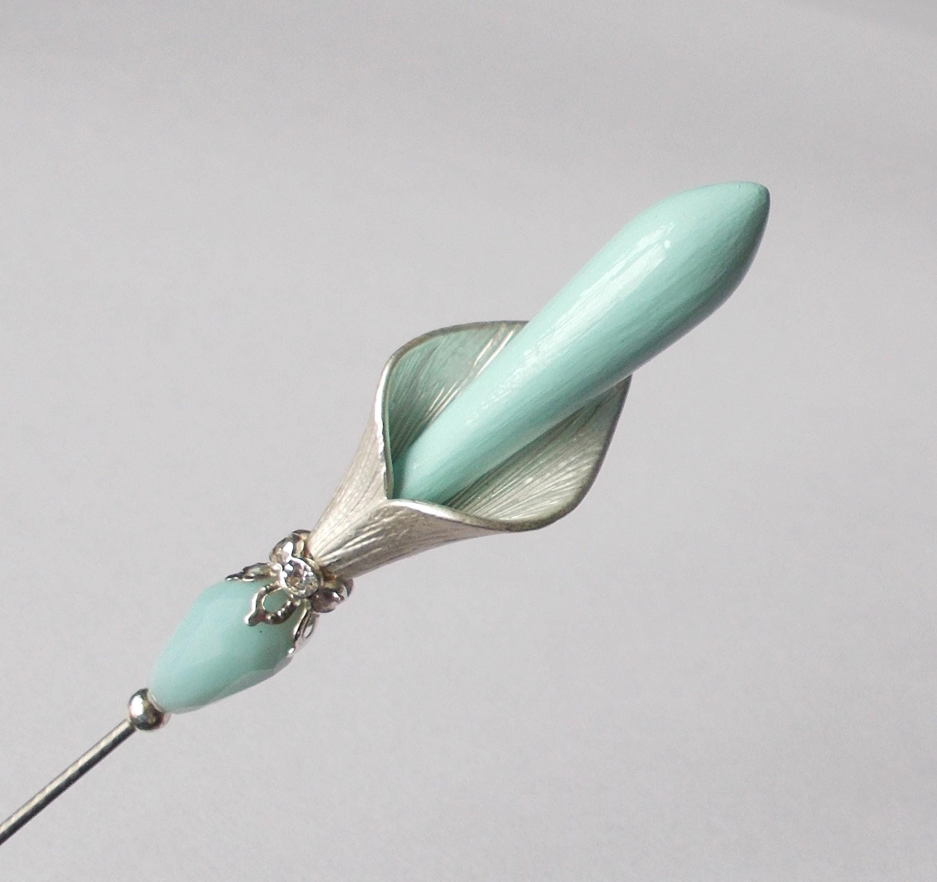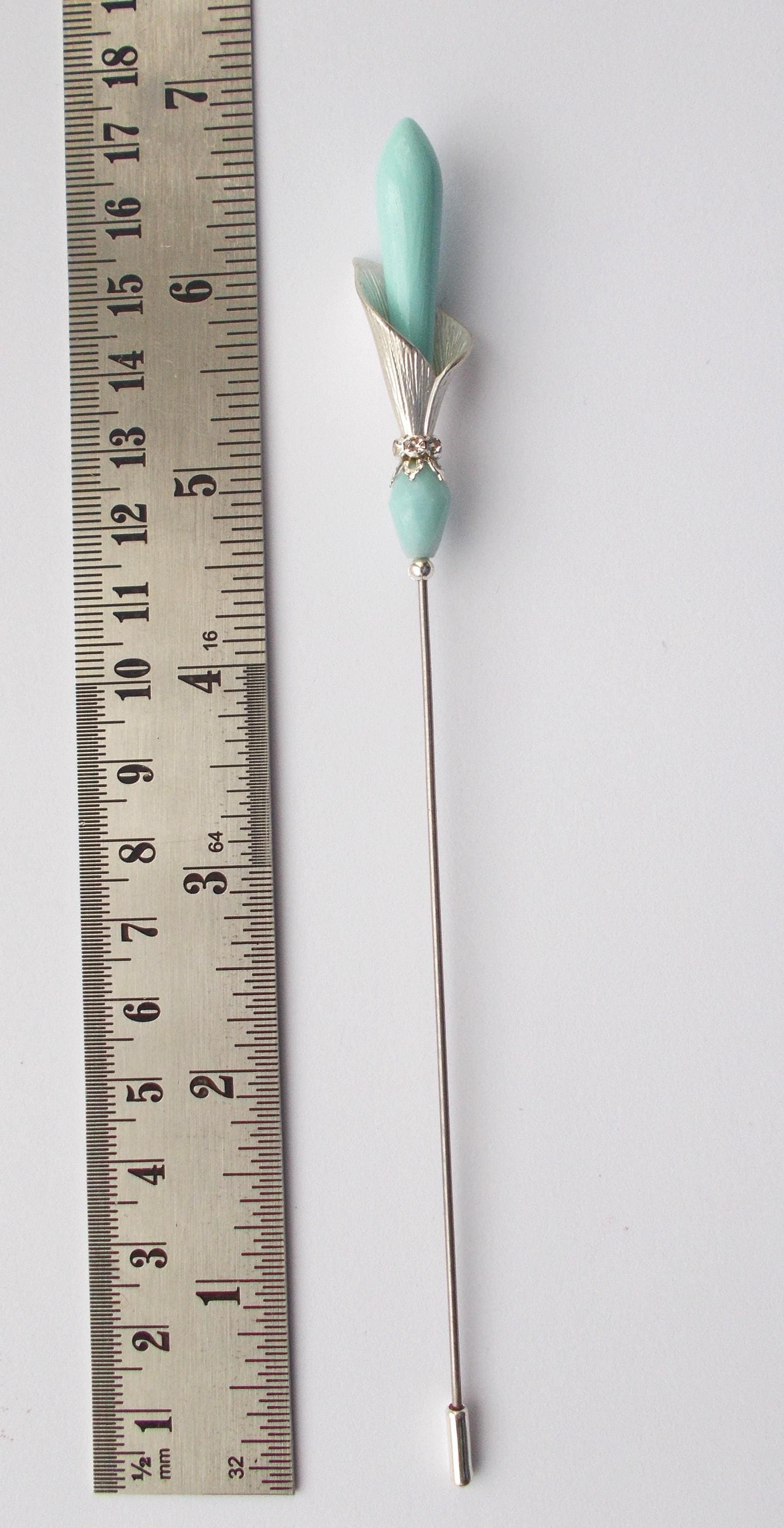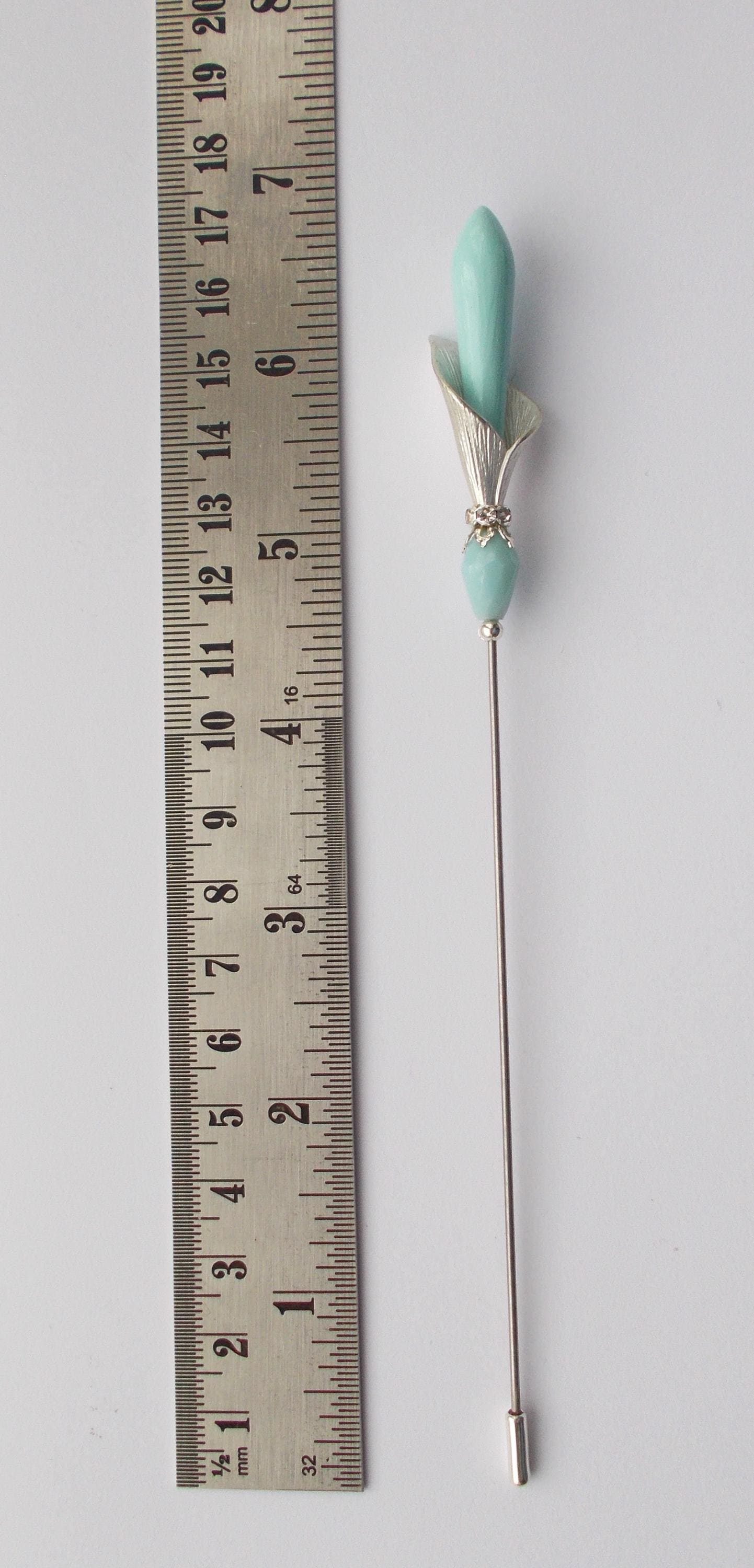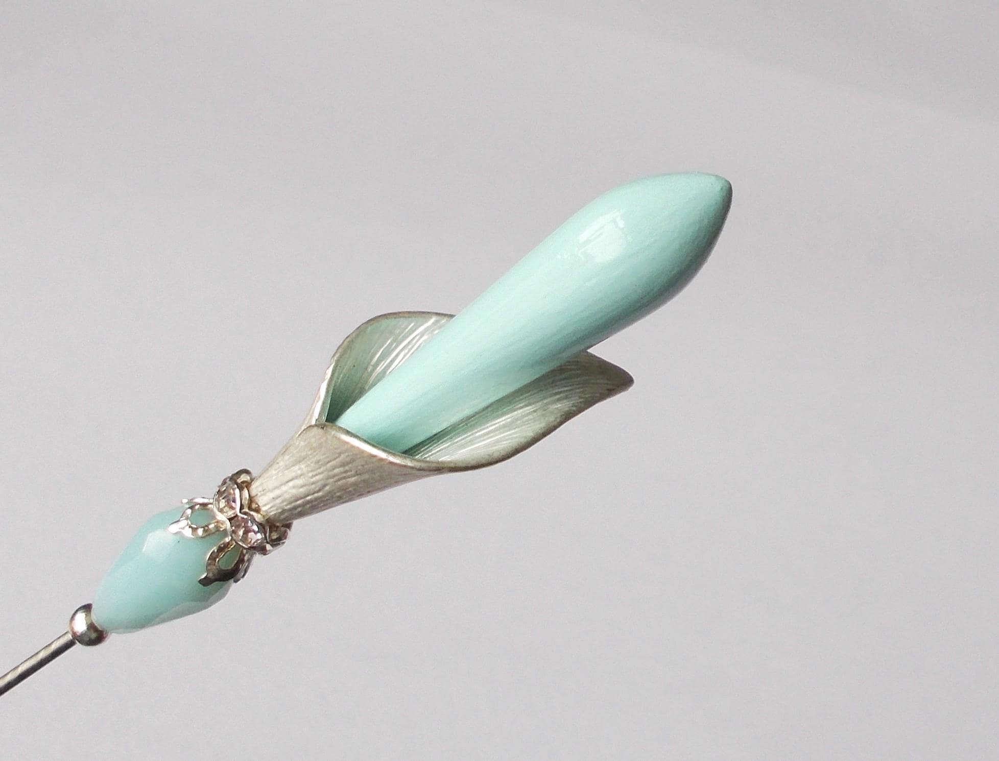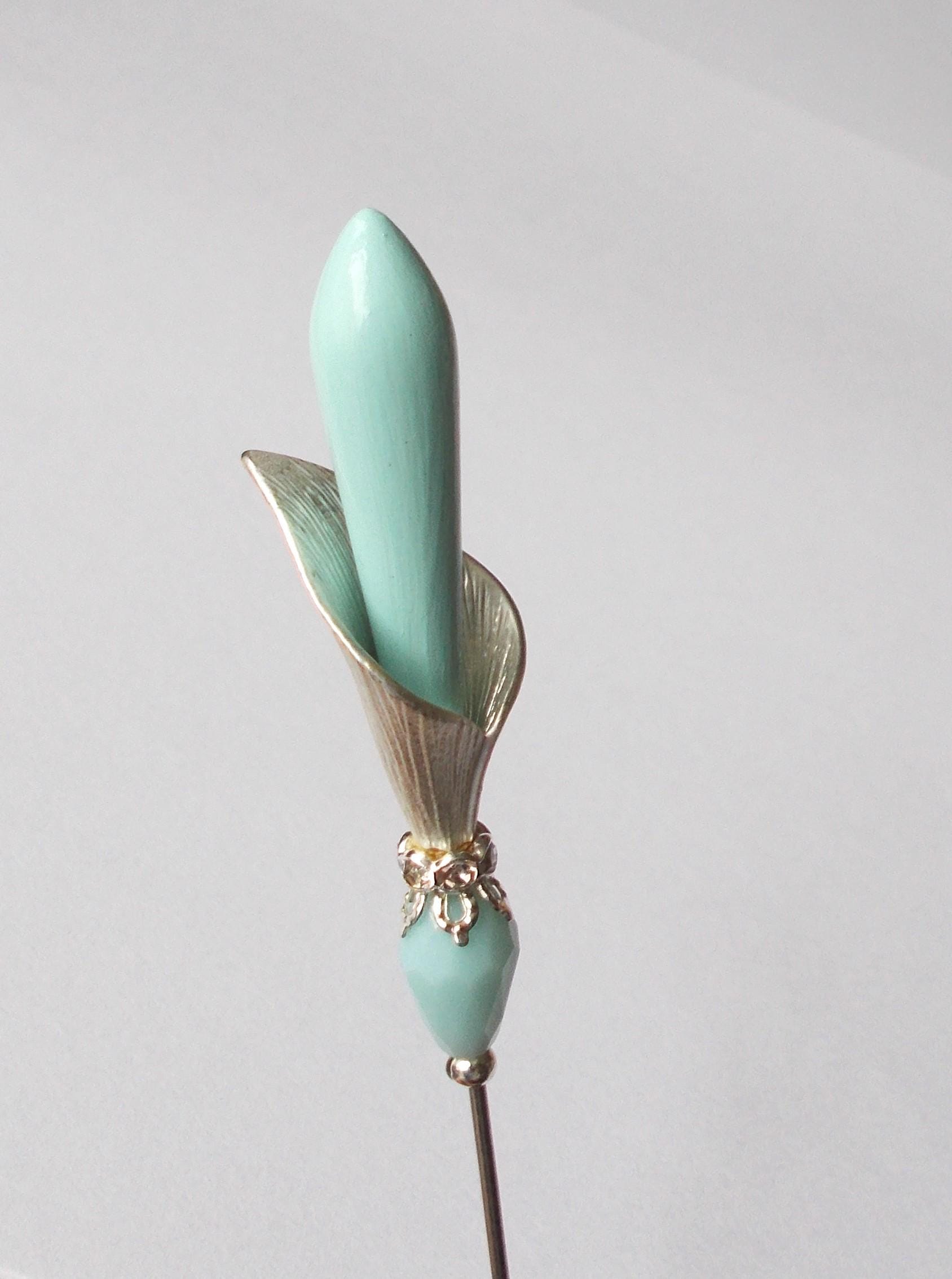 Stunning limited edition vintage pale blue painted lucite and with glass bead with silver coloured calla lily leaf and findings, steel pin (1.2mm) and hatpin is approx 6.5 inches long in total, comes with pin protector and will be sent in a gift box.