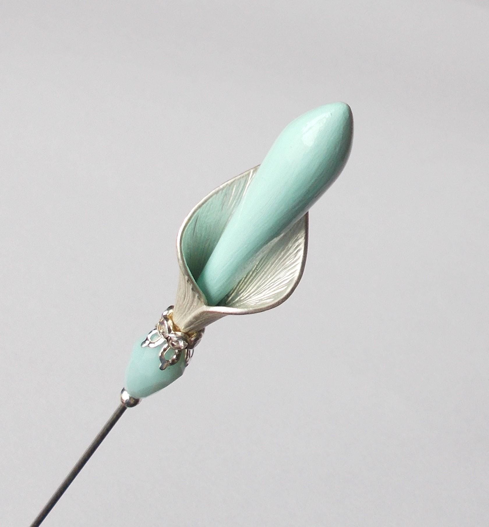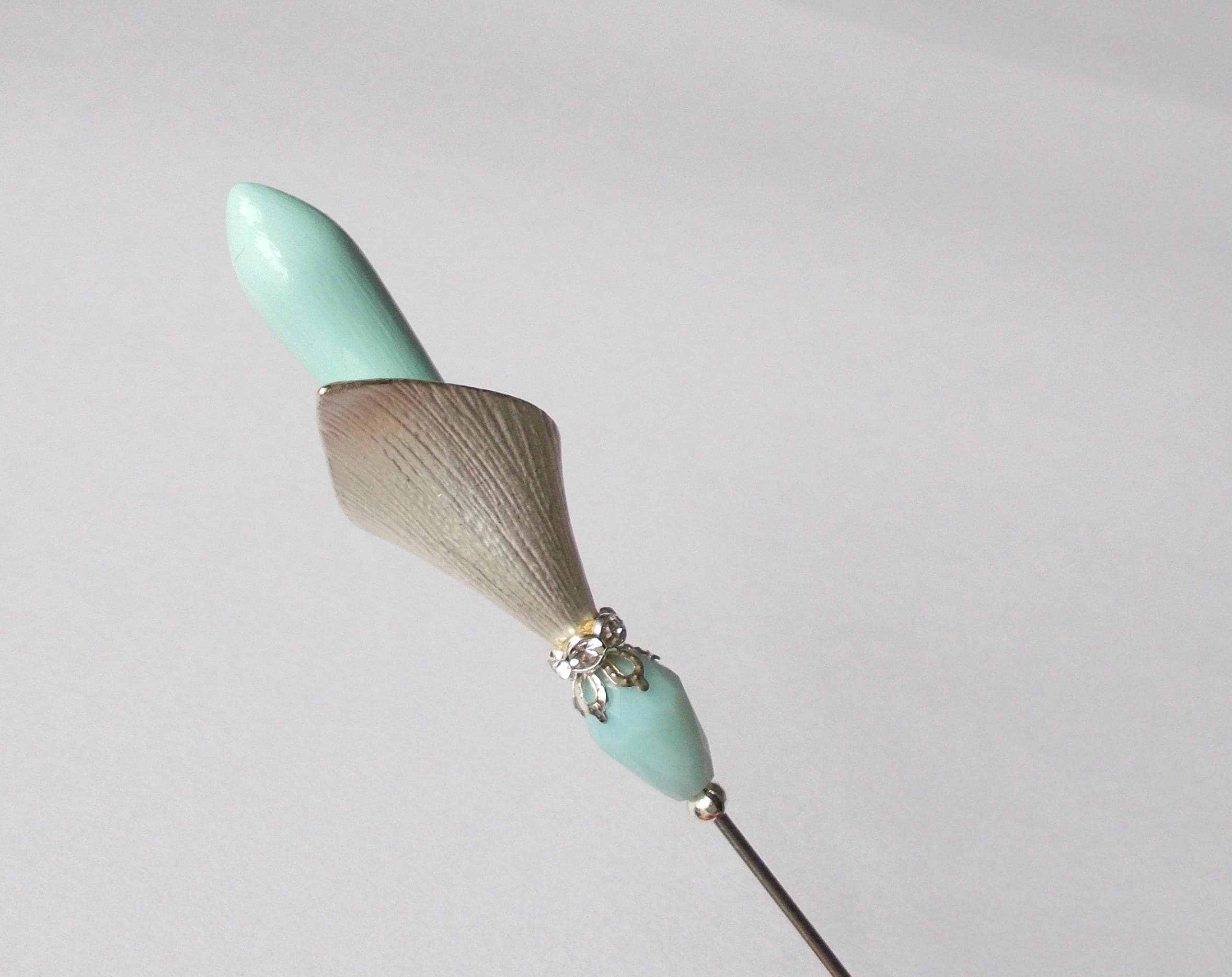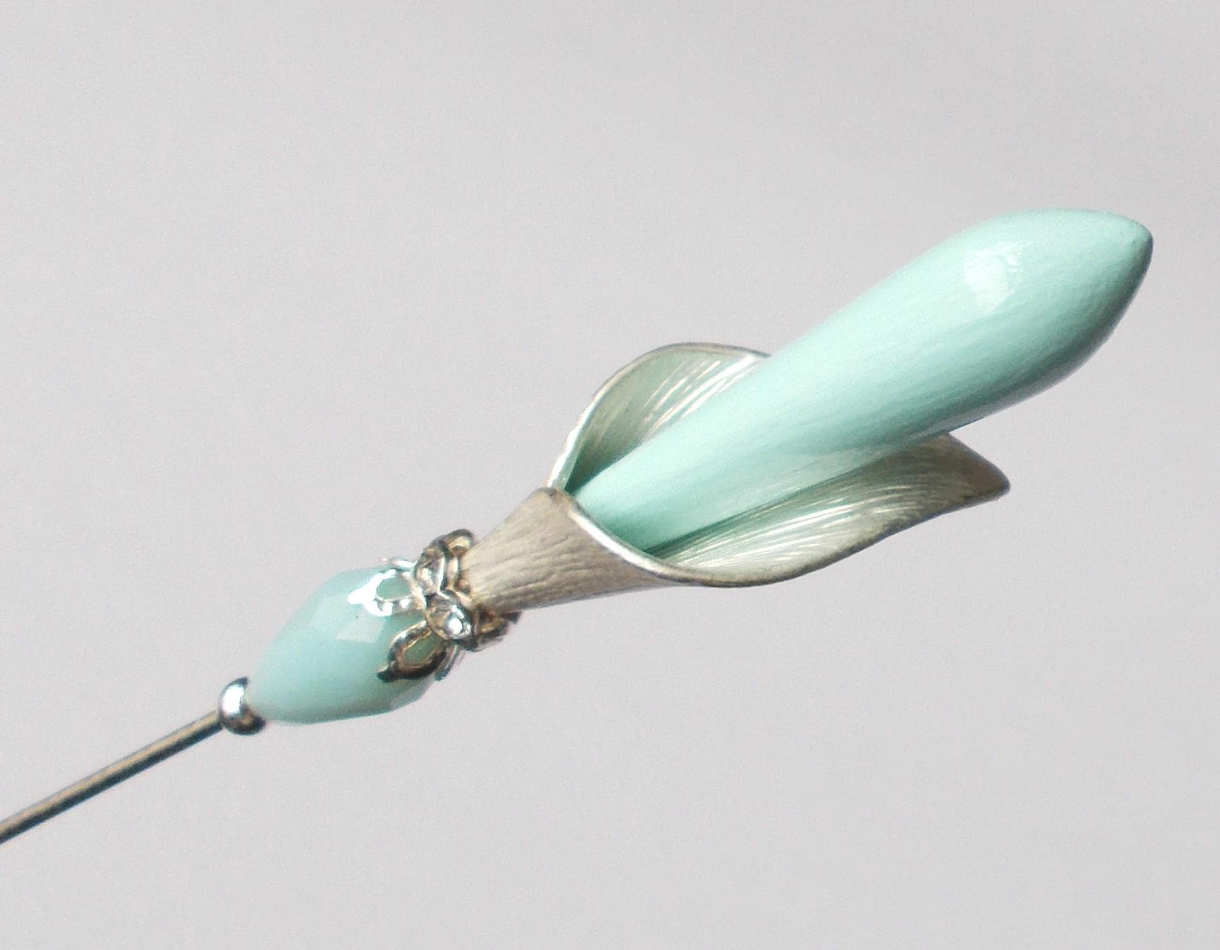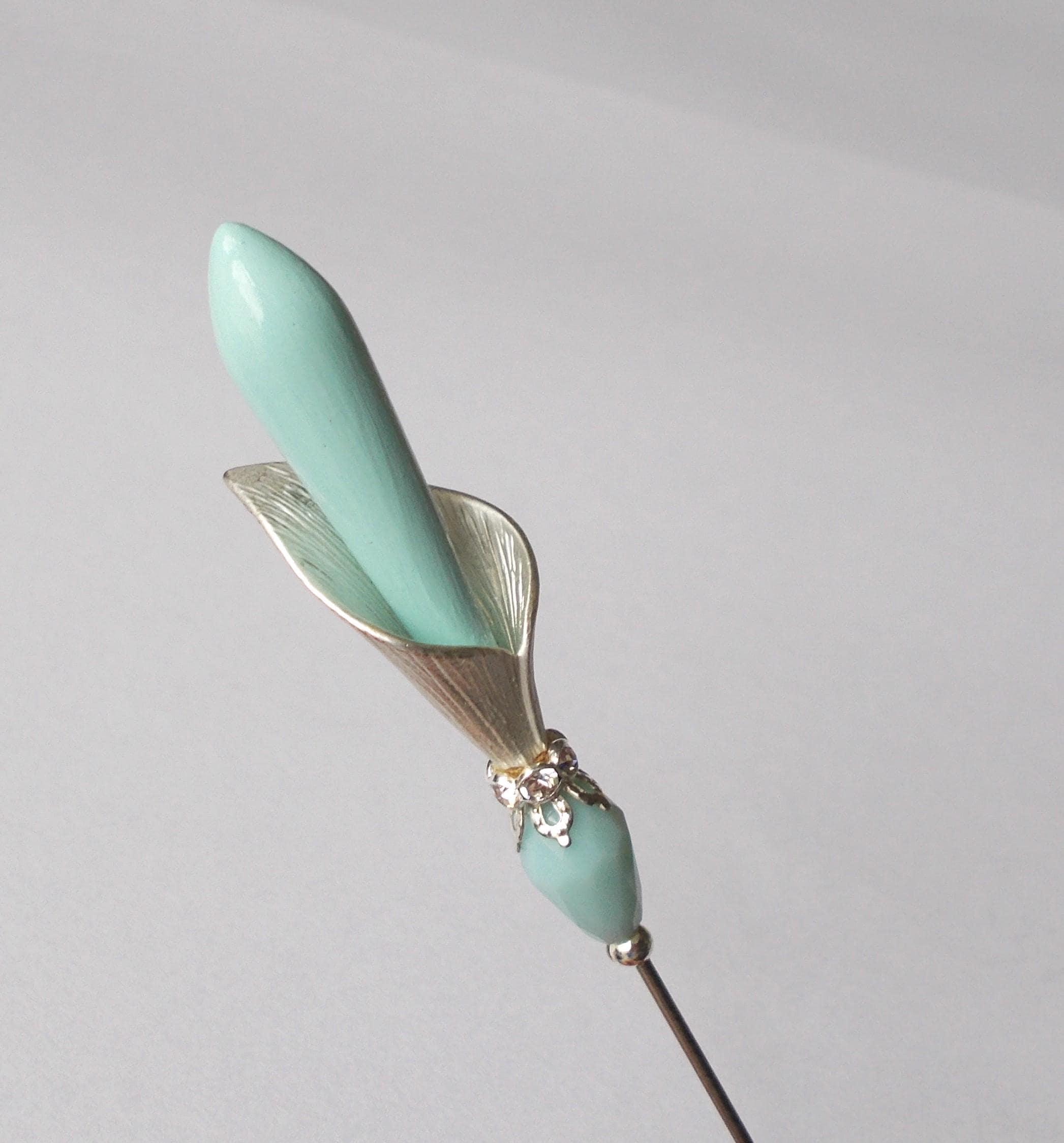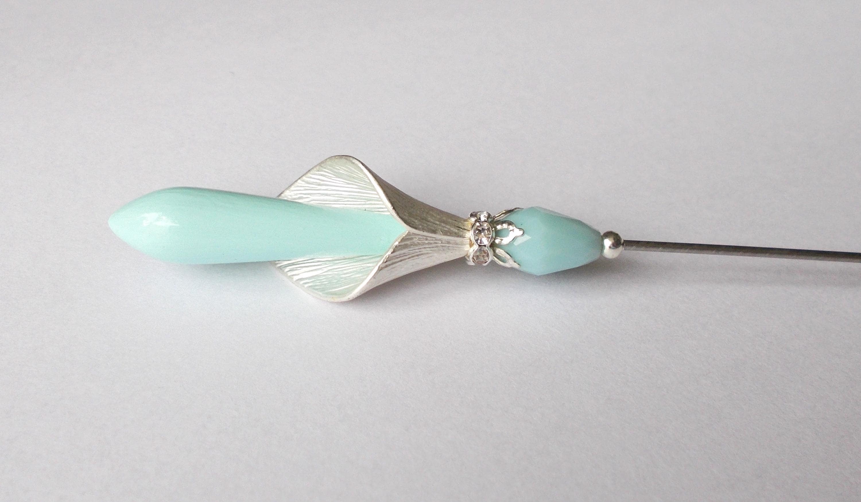Stunning limited edition vintage pale blue painted lucite and with glass bead with silver coloured calla lily leaf and findings, steel pin (1.2mm) and hatpin is approx 6.5 inches long in total, comes with pin protector and will be sent in a gift box.