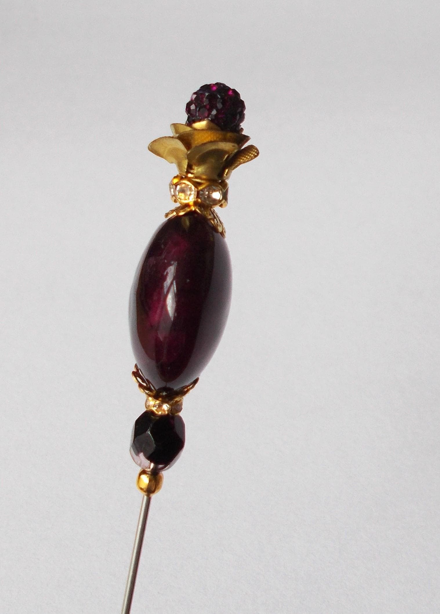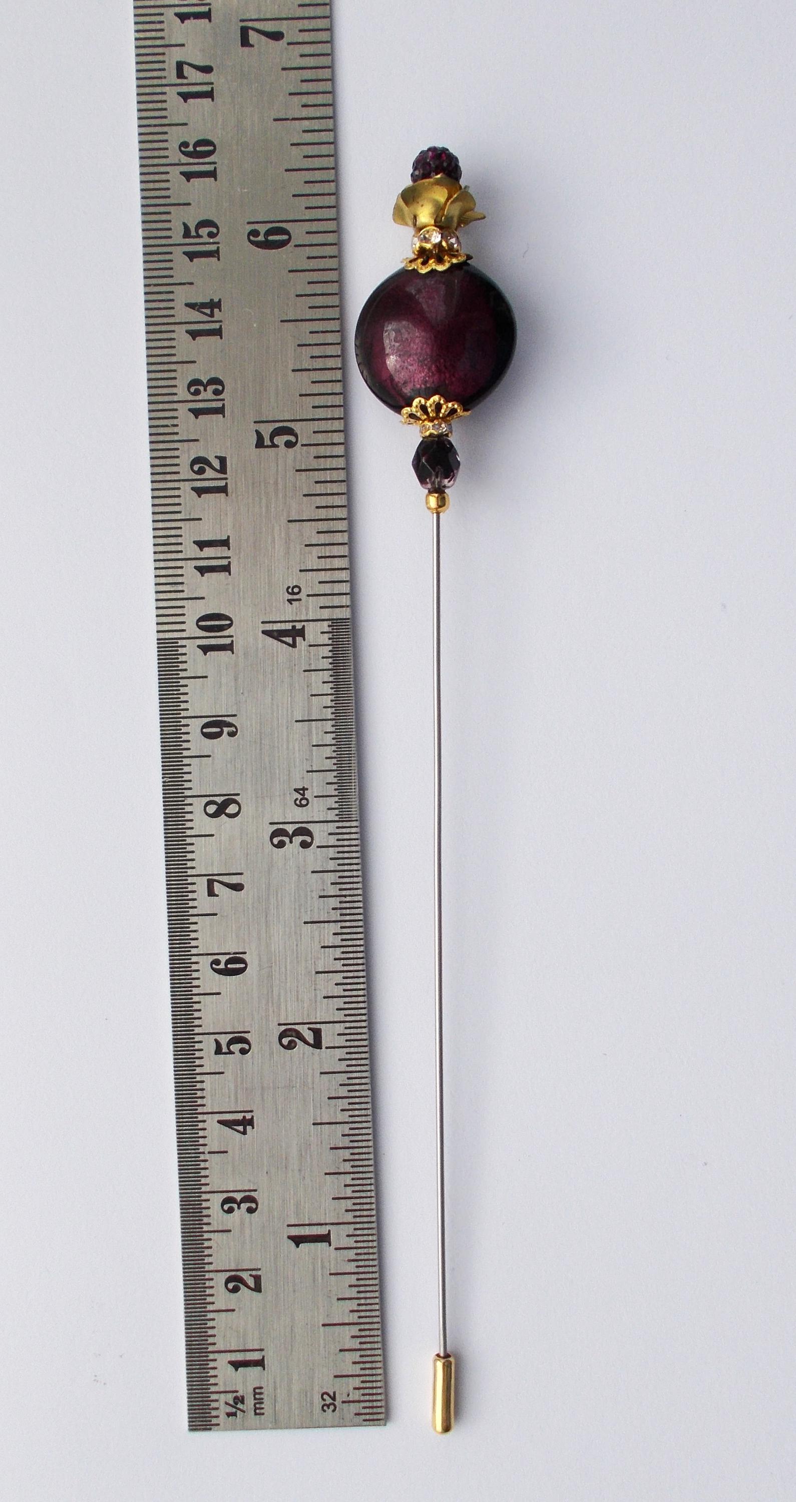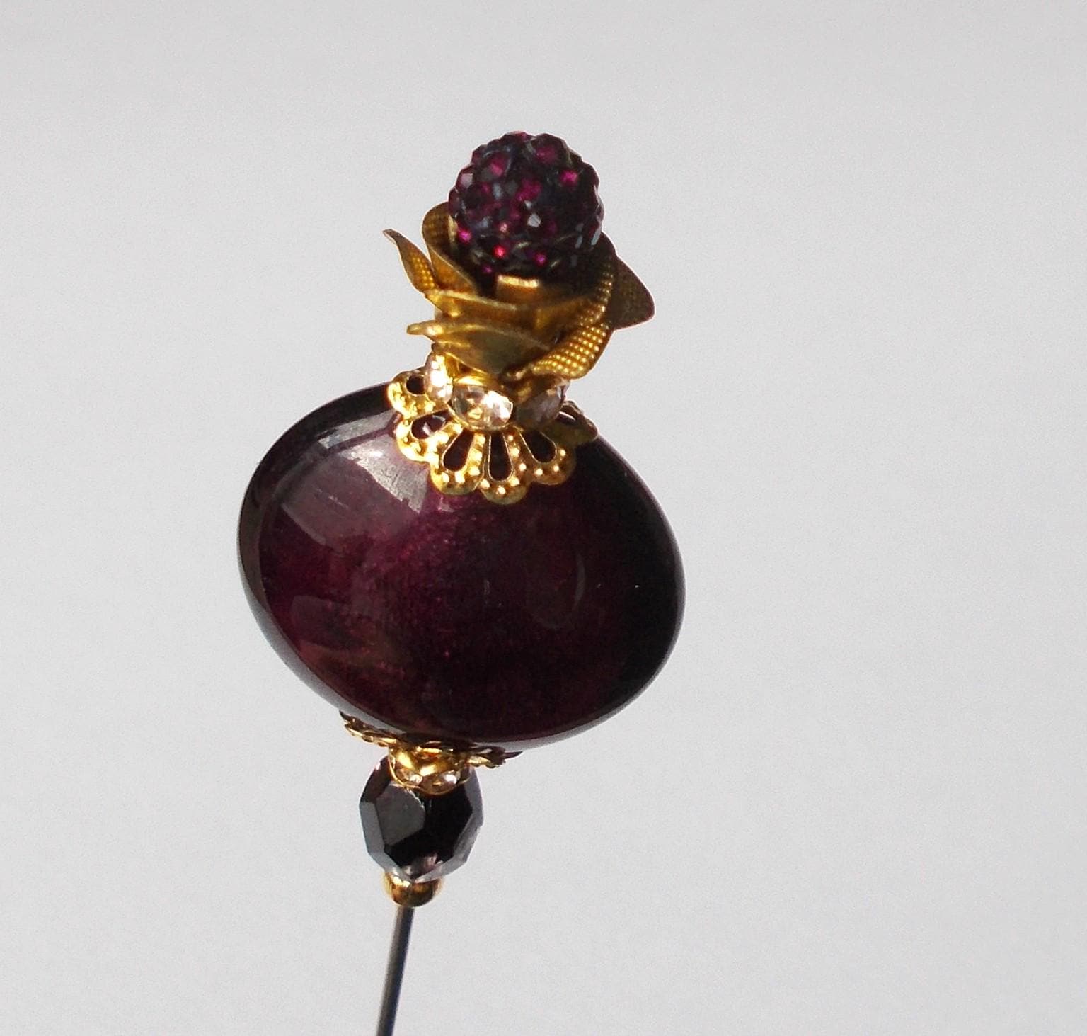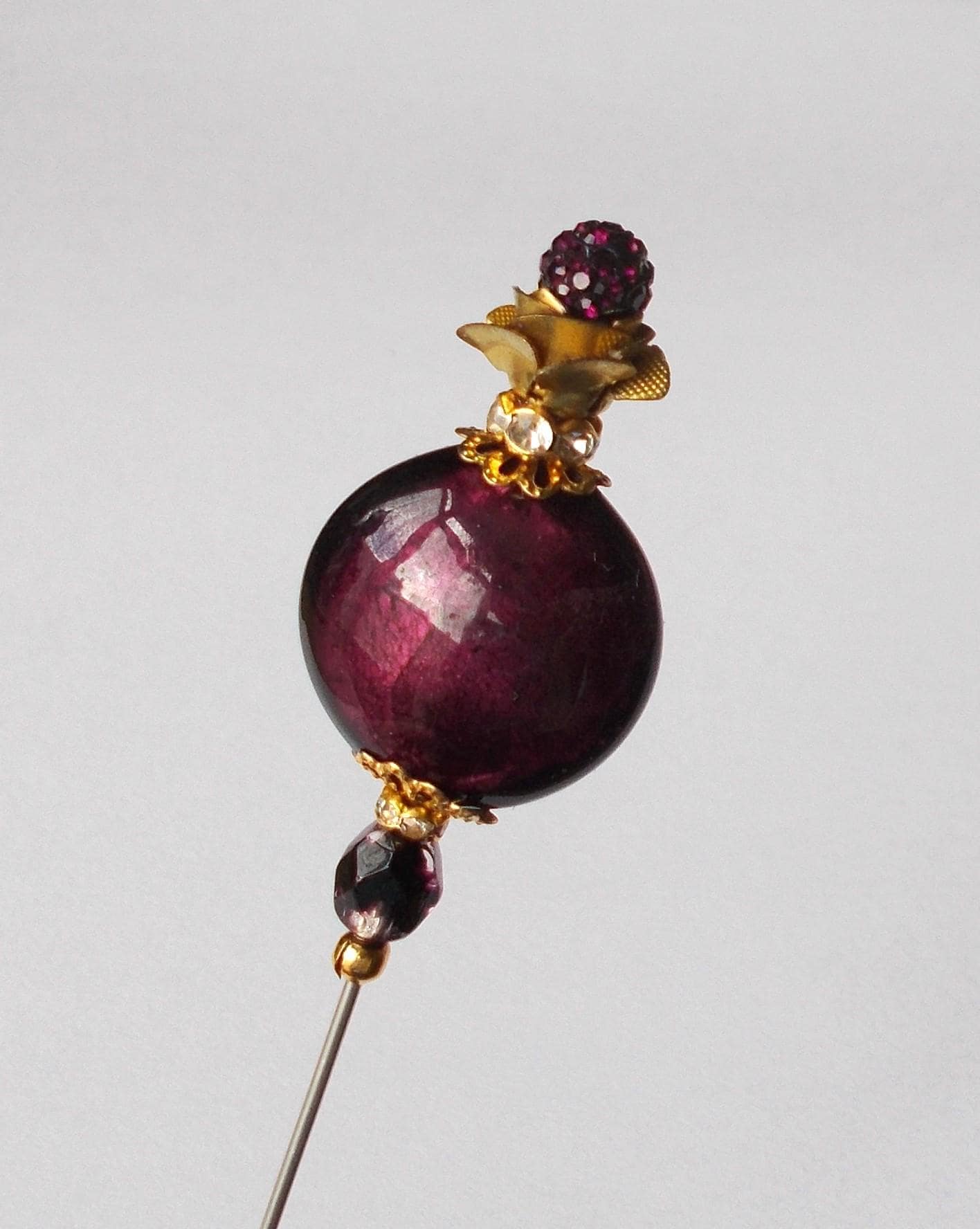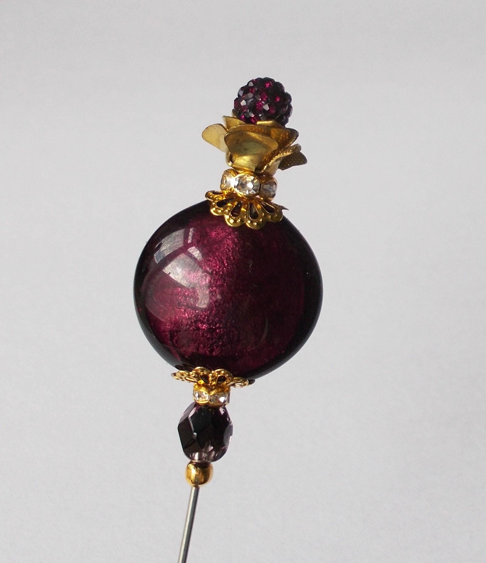 Pretty hatpin that I made using a mix of purple glass beads, vintage brass and gold coloured findings and rhinestone rondelles, 1mm diameter steel pin and hatpin is 6.25 inches long in total, comes with pin protector and will be sent in a gift box.