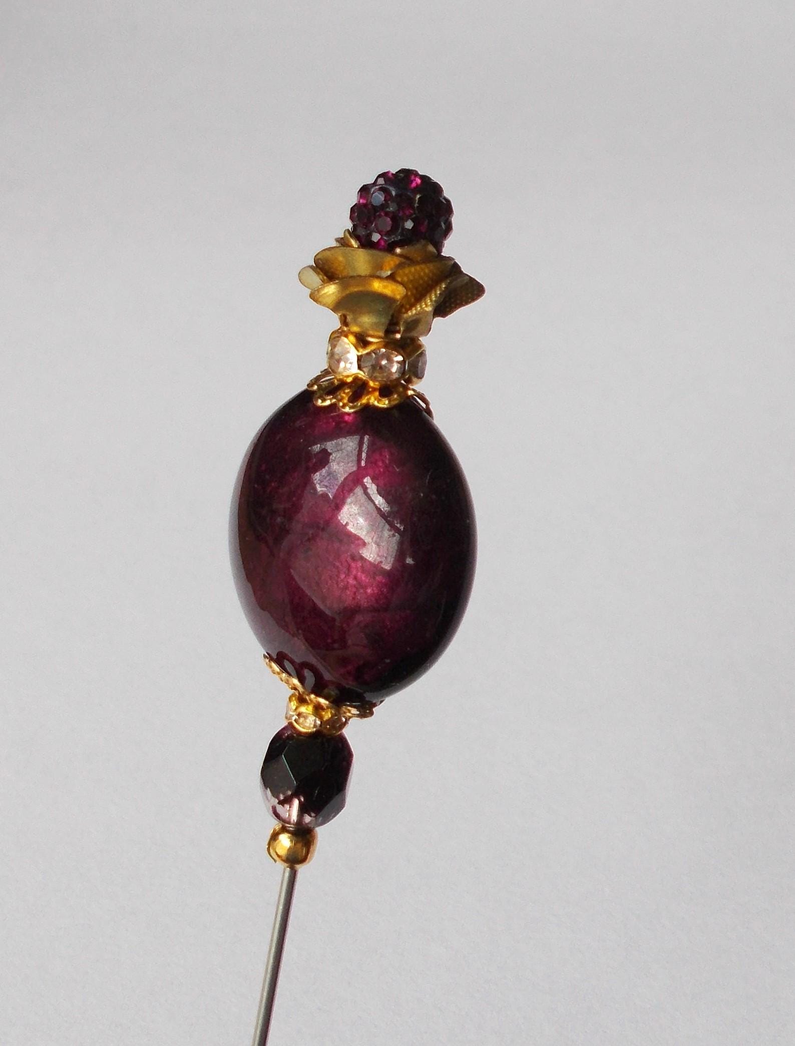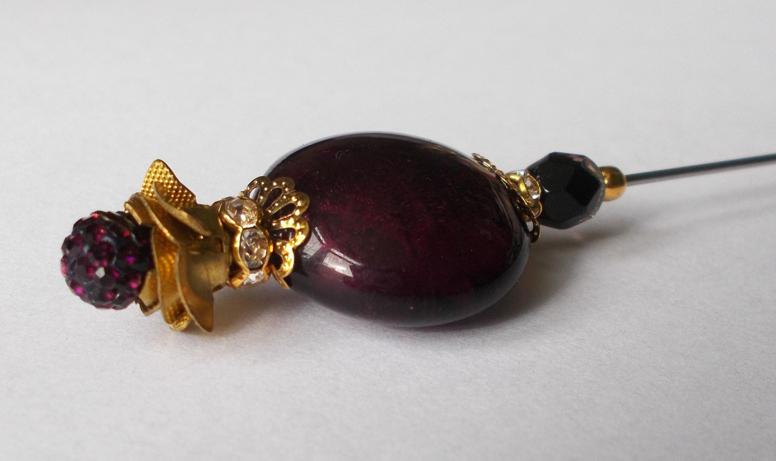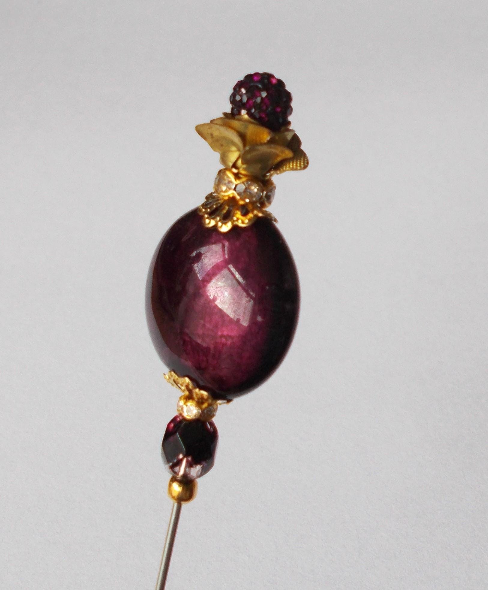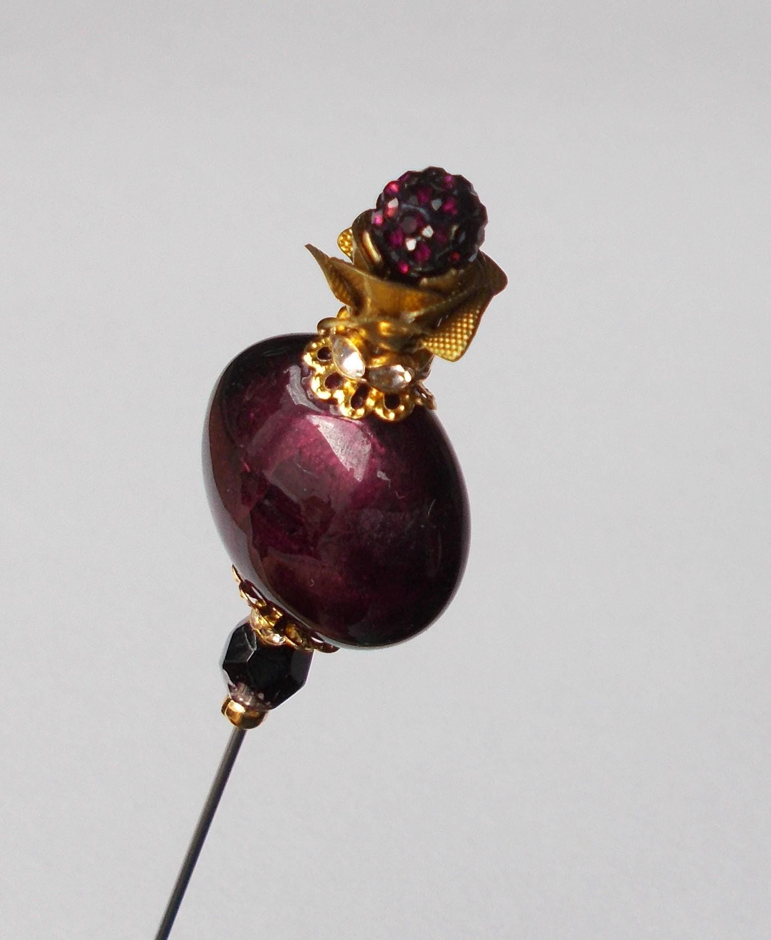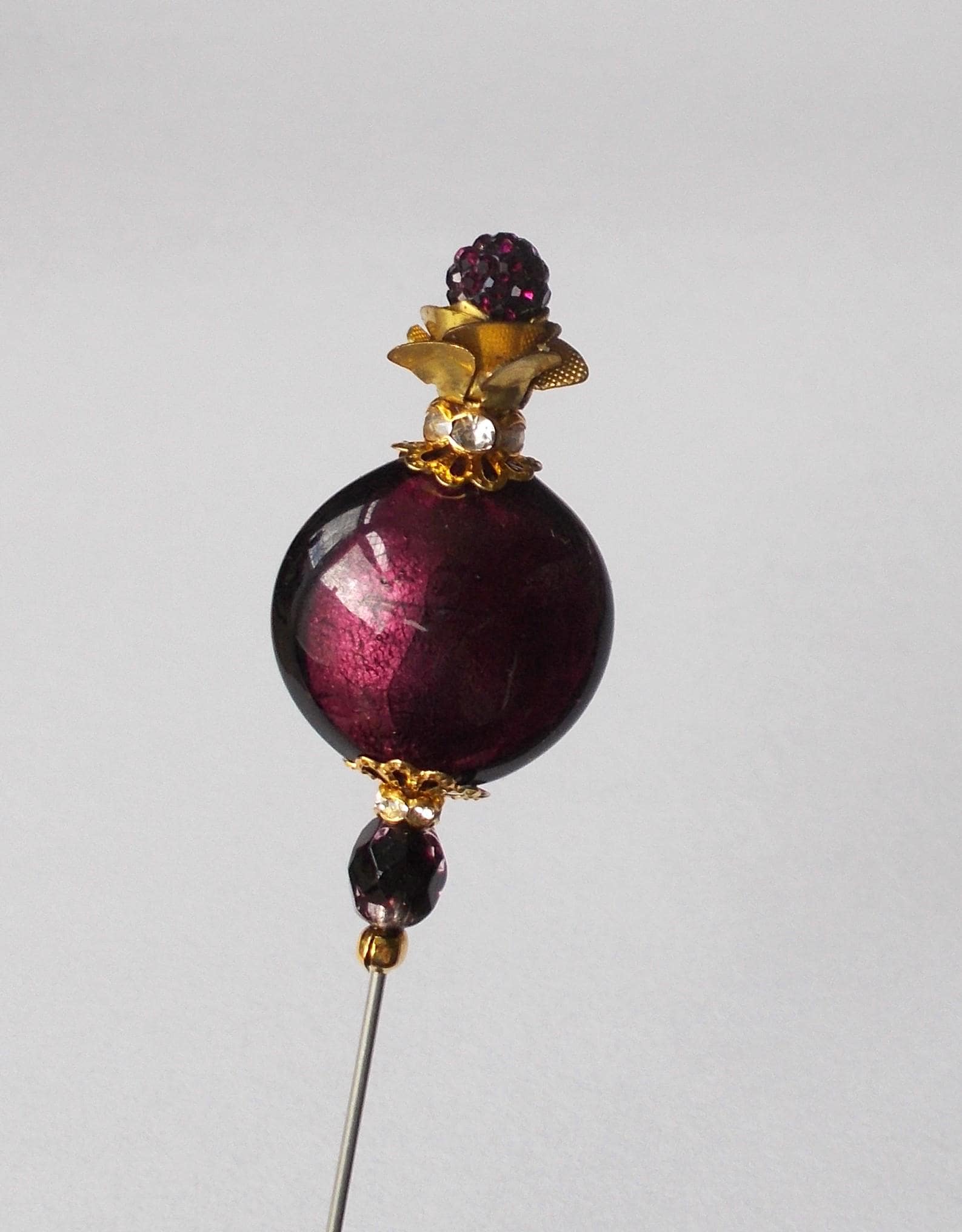 Pretty hatpin that I made using a mix of purple glass beads, vintage brass and gold coloured findings and rhinestone rondelles, 1mm diameter steel pin and hatpin is 6.25 inches long in total, comes with pin protector and will be sent in a gift box.