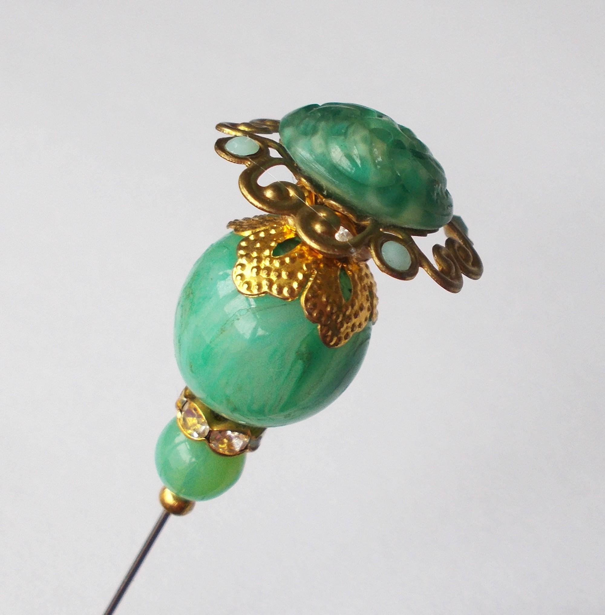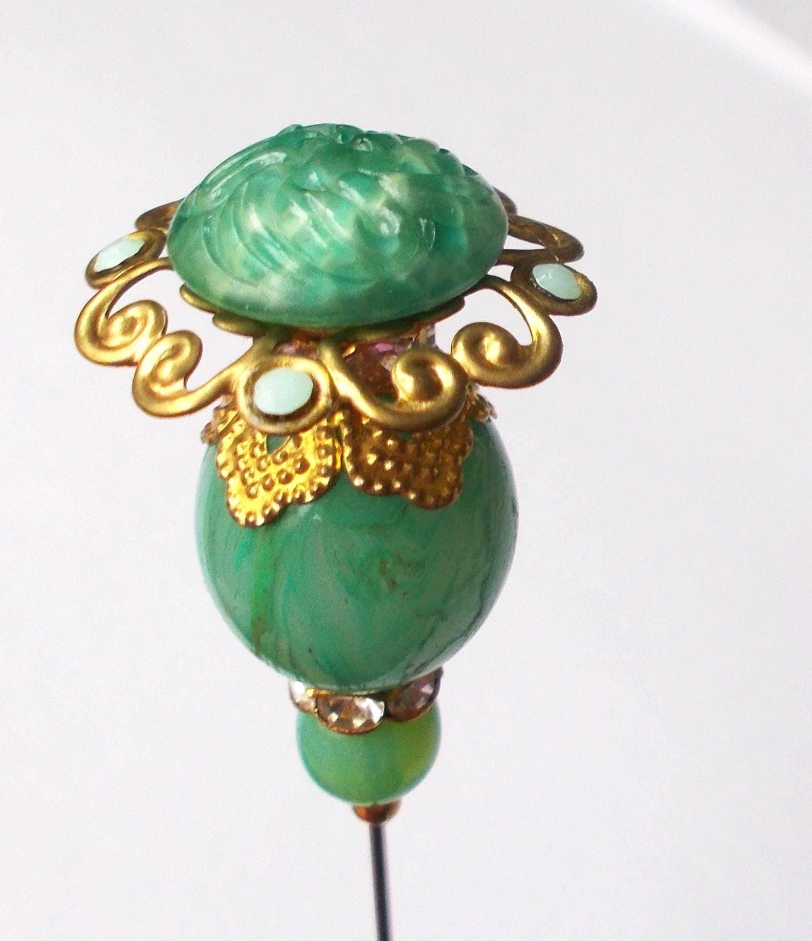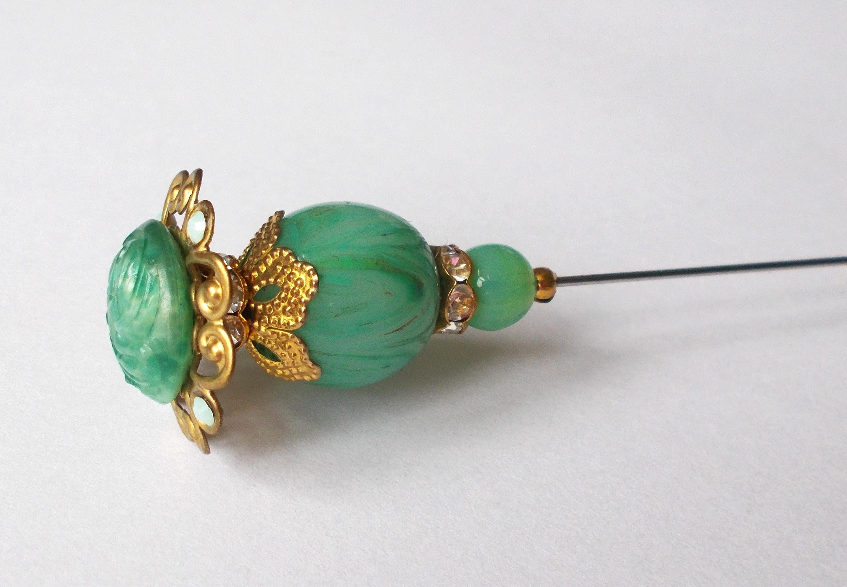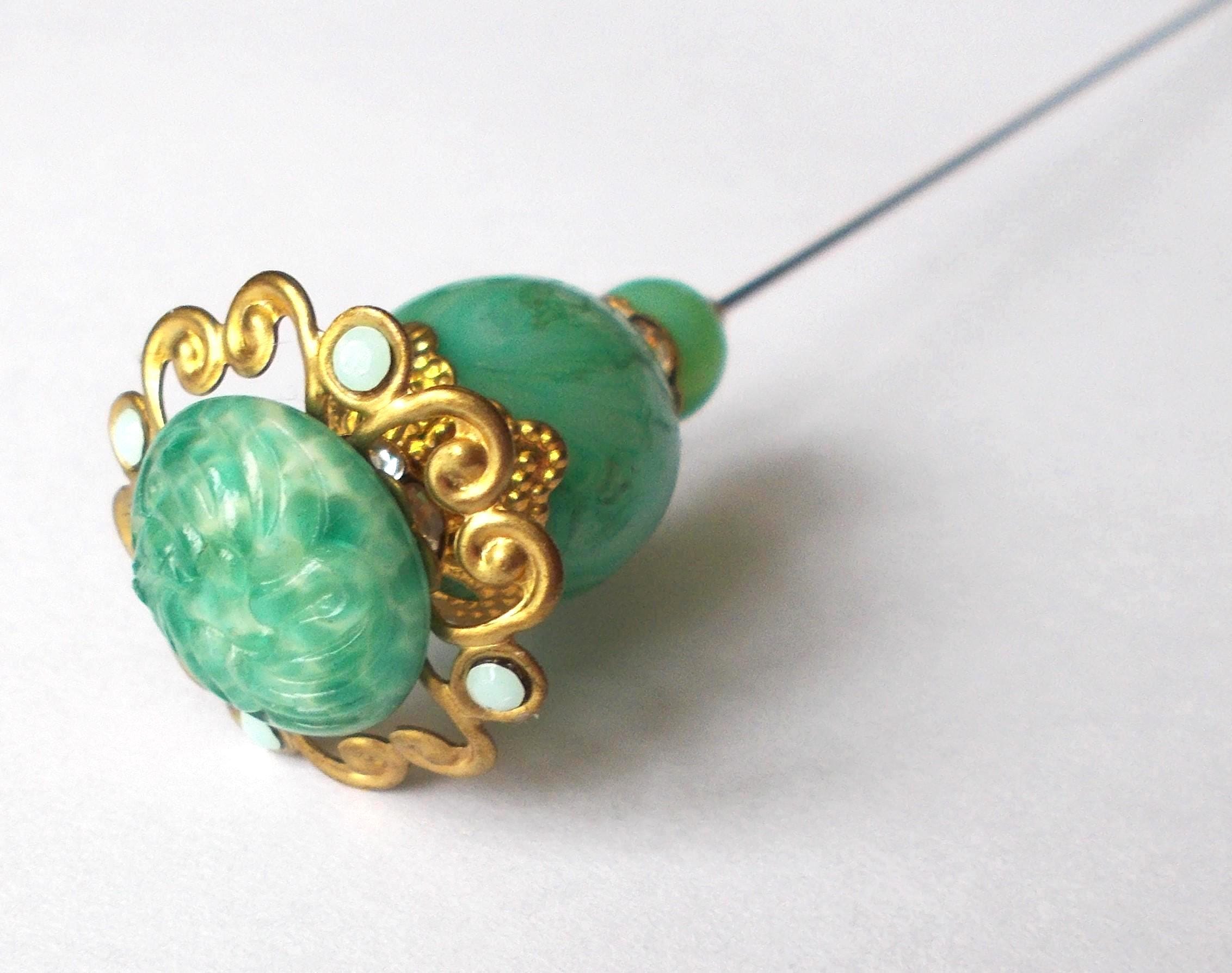 Pretty limited edition hatpin that I made using a mix of stunning vintage green glass beads, gold coloured vintage and modern findings, 1mm diameter steel pin and hatpin 7.25 inches long in total, comes with pin protector and will be sent in a gift box.