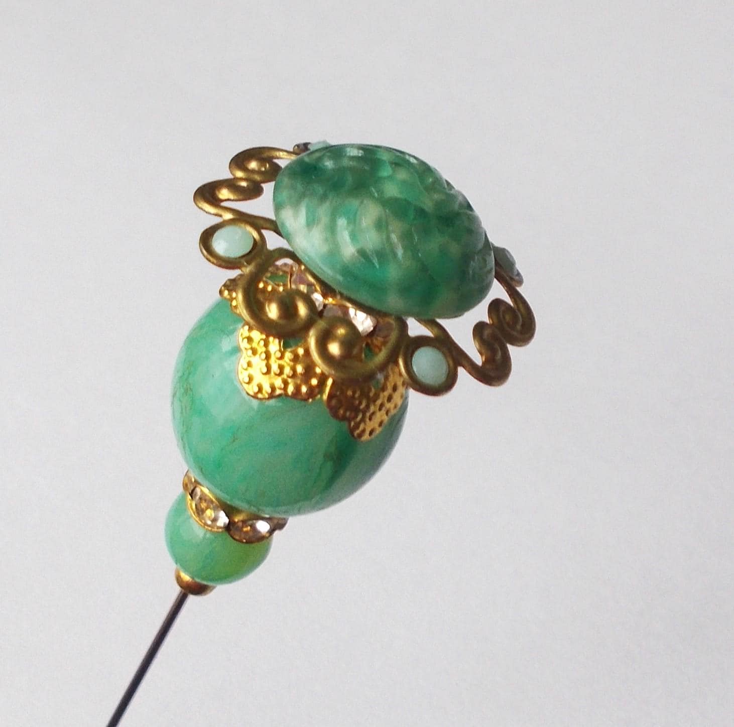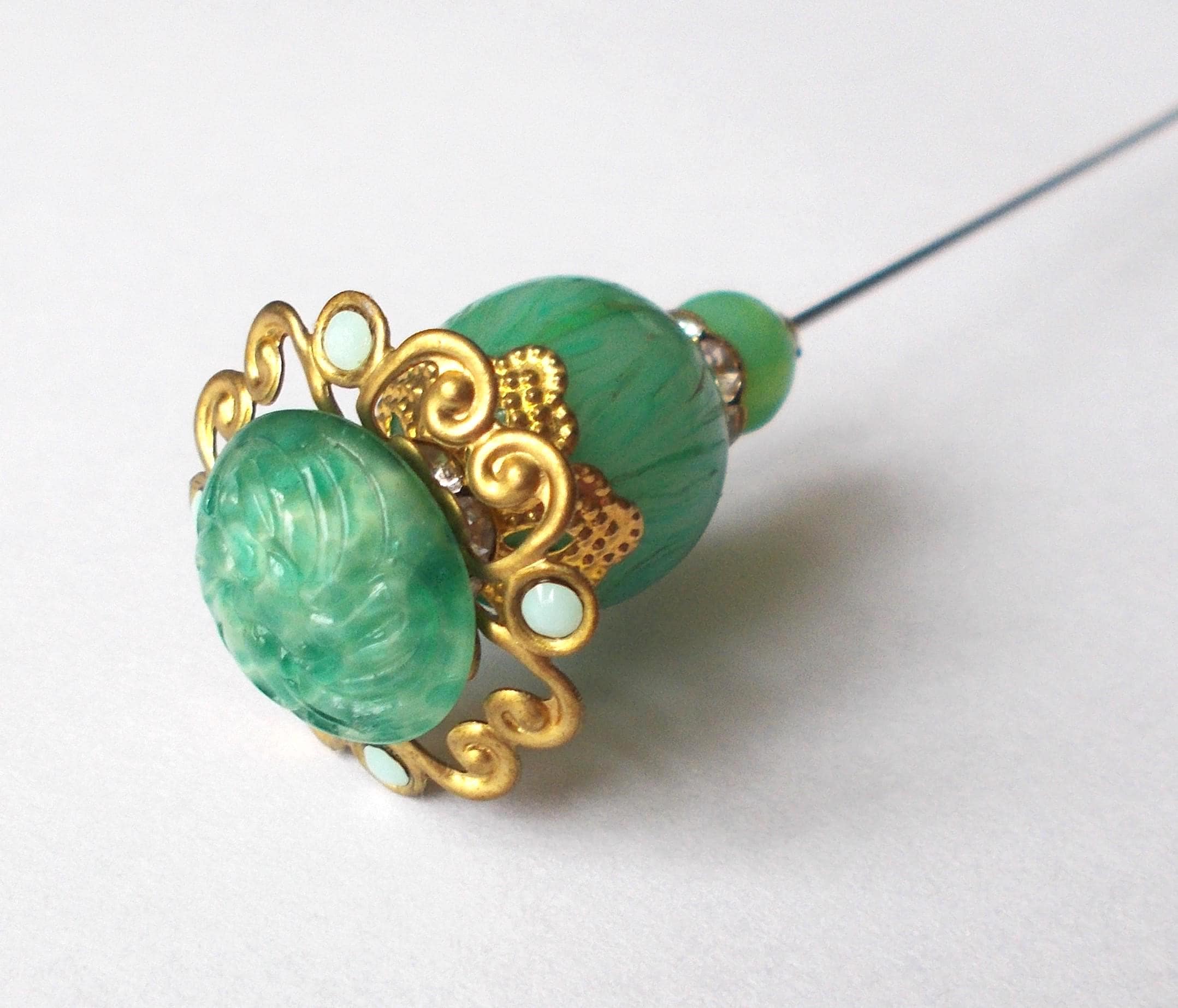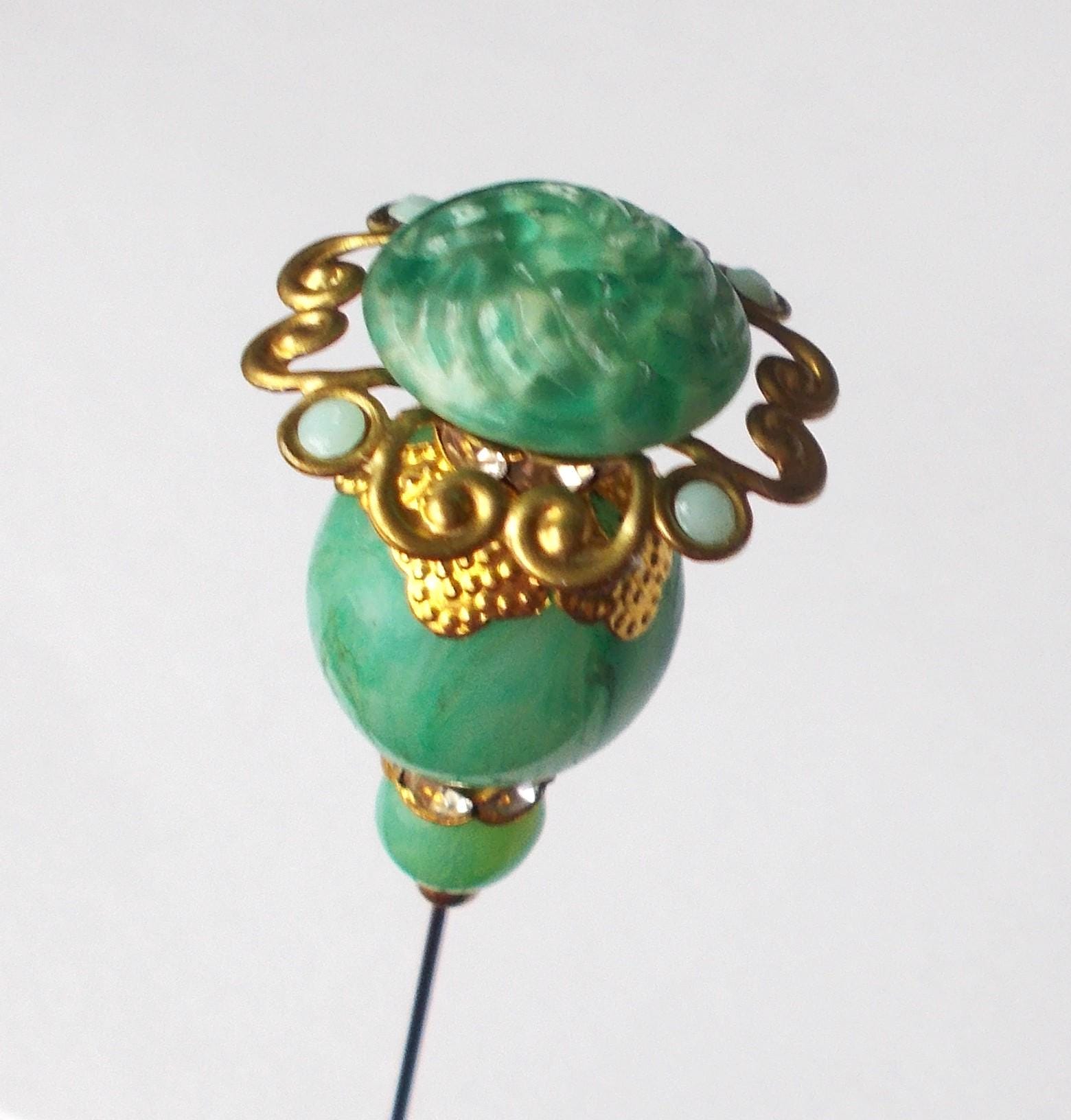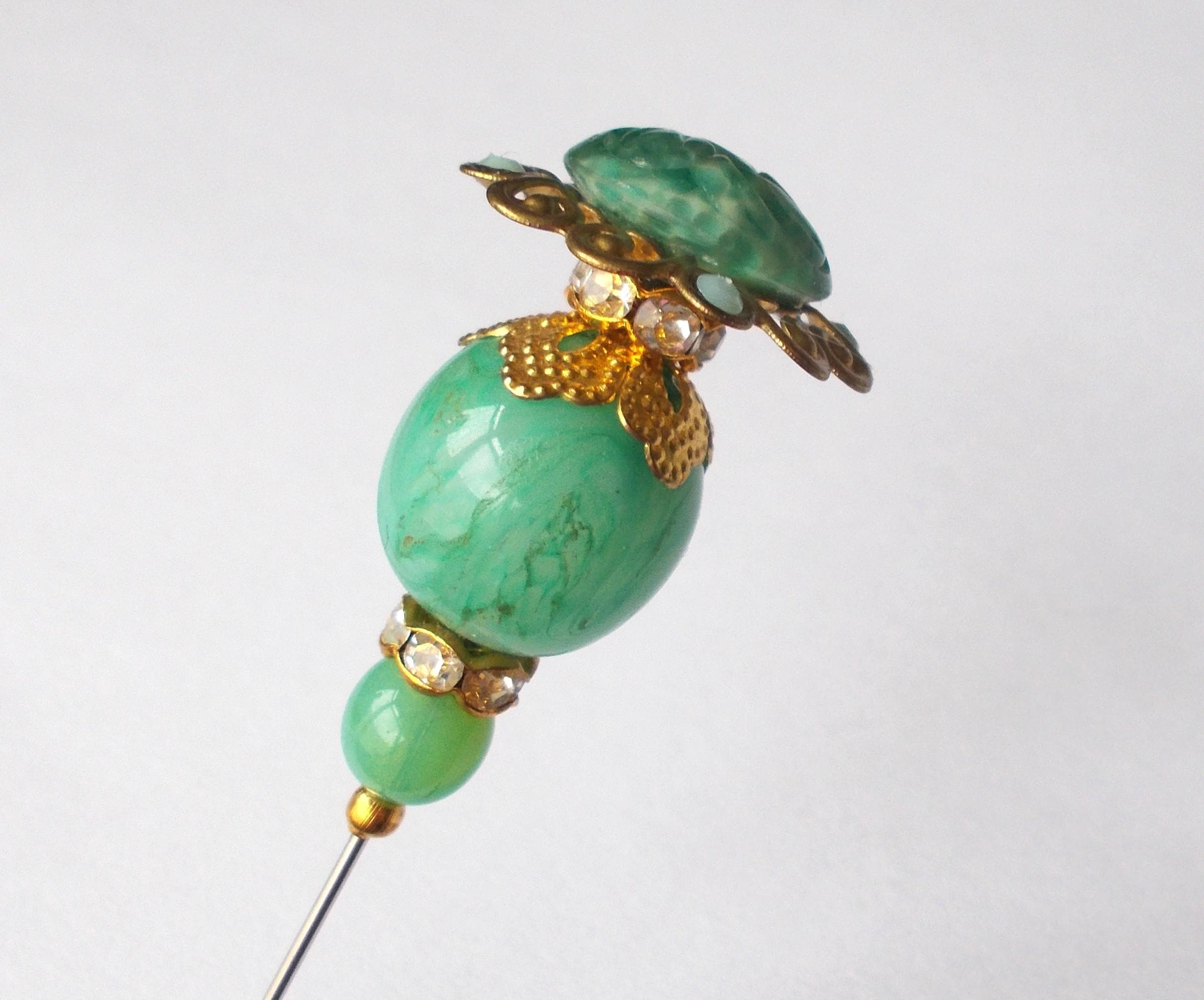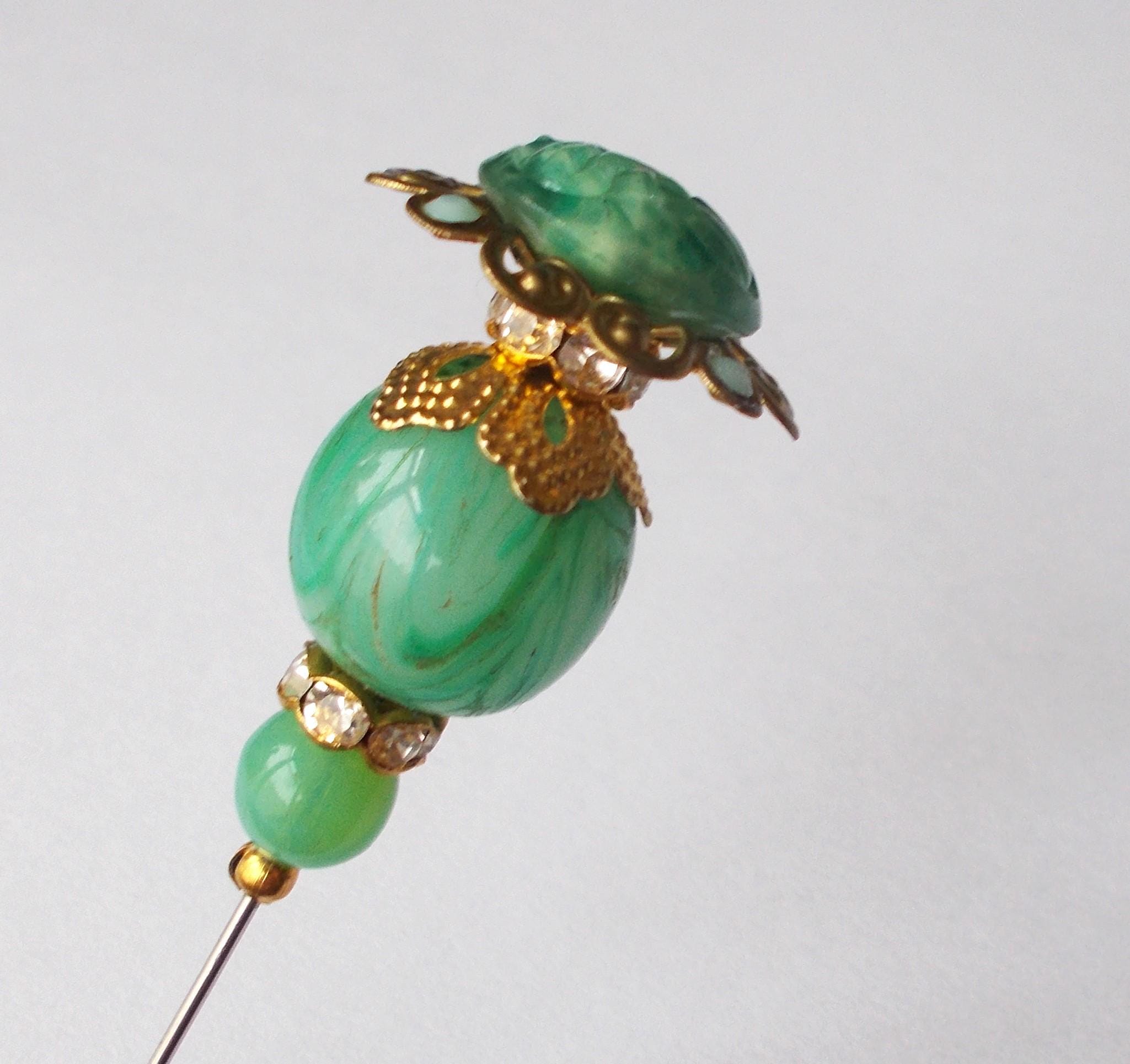 Pretty limited edition hatpin that I made using a mix of stunning vintage green glass beads, gold coloured vintage and modern findings, 1mm diameter steel pin and hatpin 7.25 inches long in total, comes with pin protector and will be sent in a gift box.