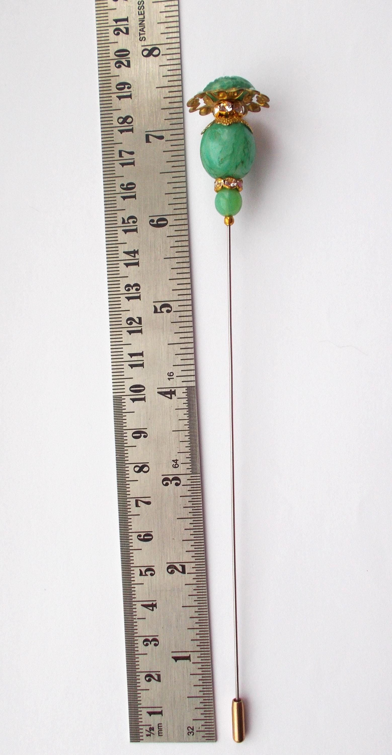 Hatpins are shown against a ruler to show scale/size of decoration and length.