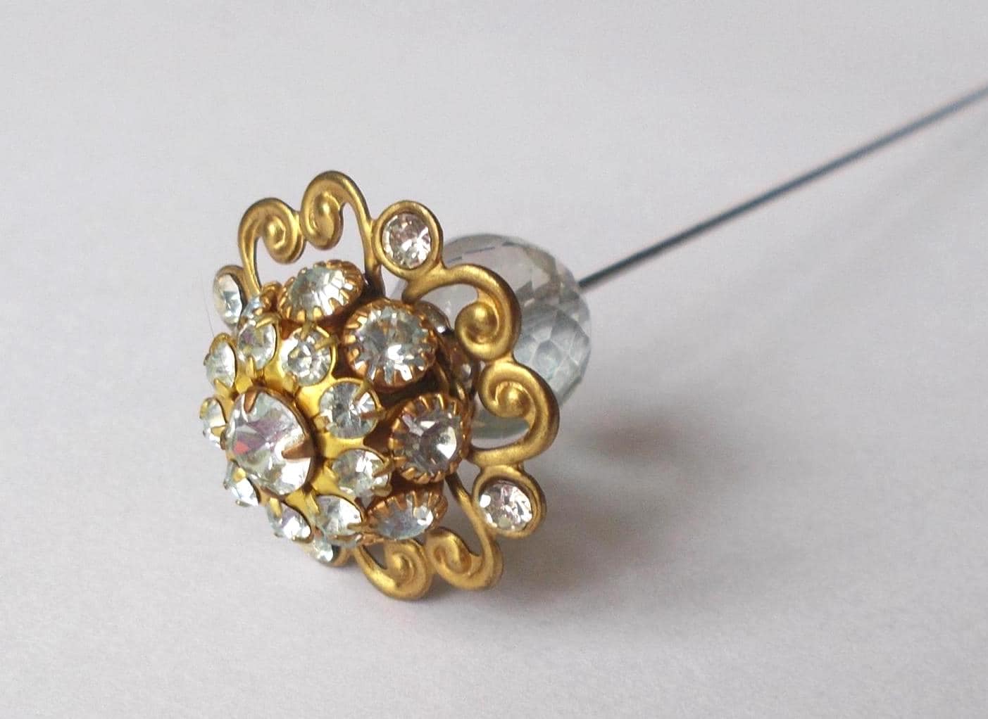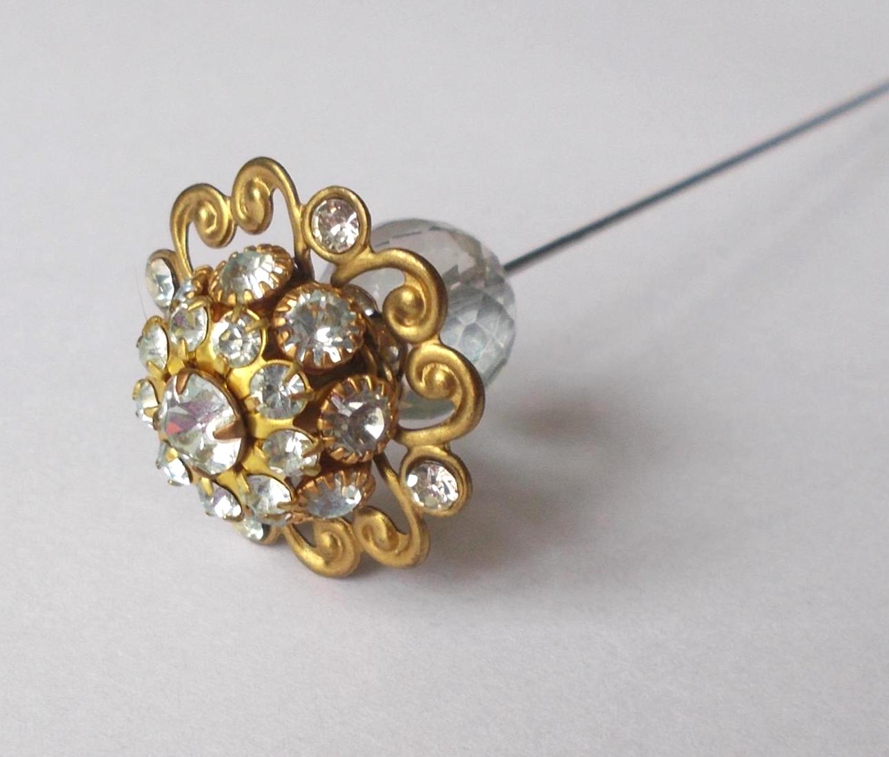 Stunning limited edition hatpin that I made using a small vintage clear rhinestone decorated brass coloured metal top (last one of these) and very pale blue/yellow glass bead, steel pin 1mm diameter and hatpin is 5.25 inches long in total, comes with pin protector and will be sent in a gift box.