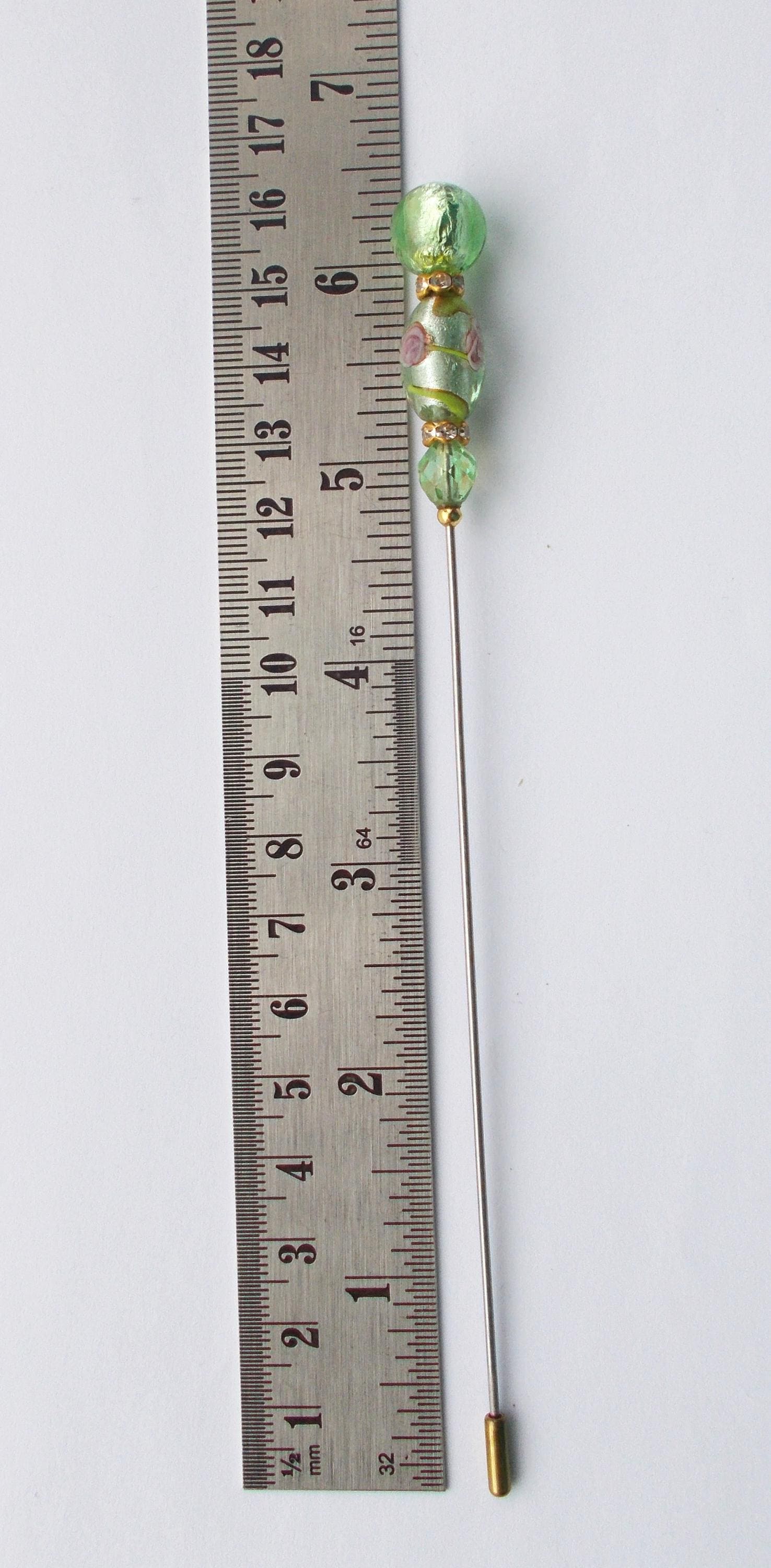 Hatpins are shown against a ruler to show scale/size of decoration and length.