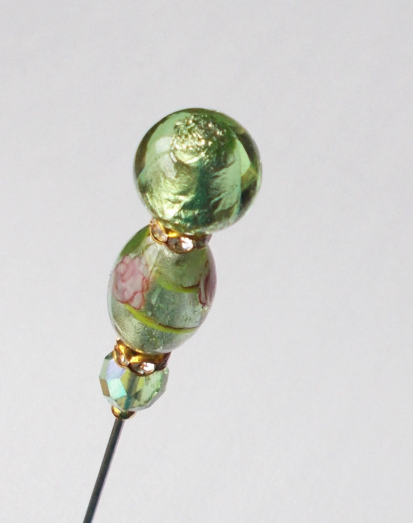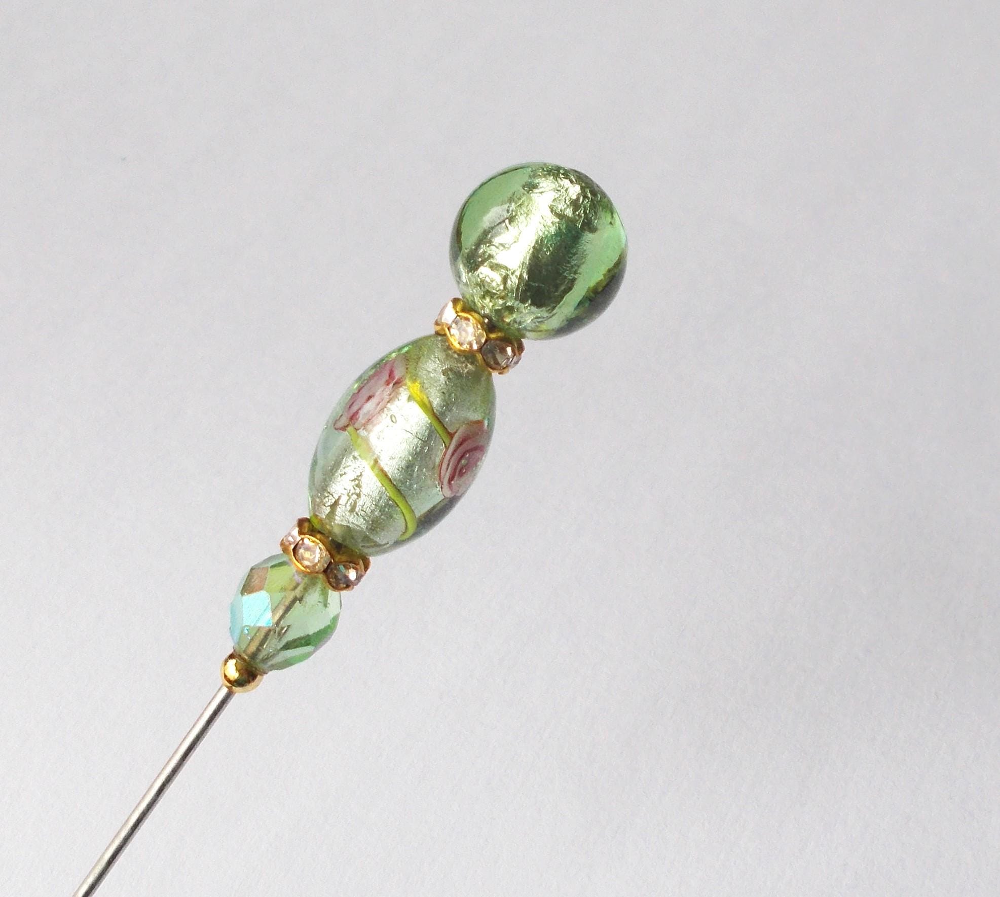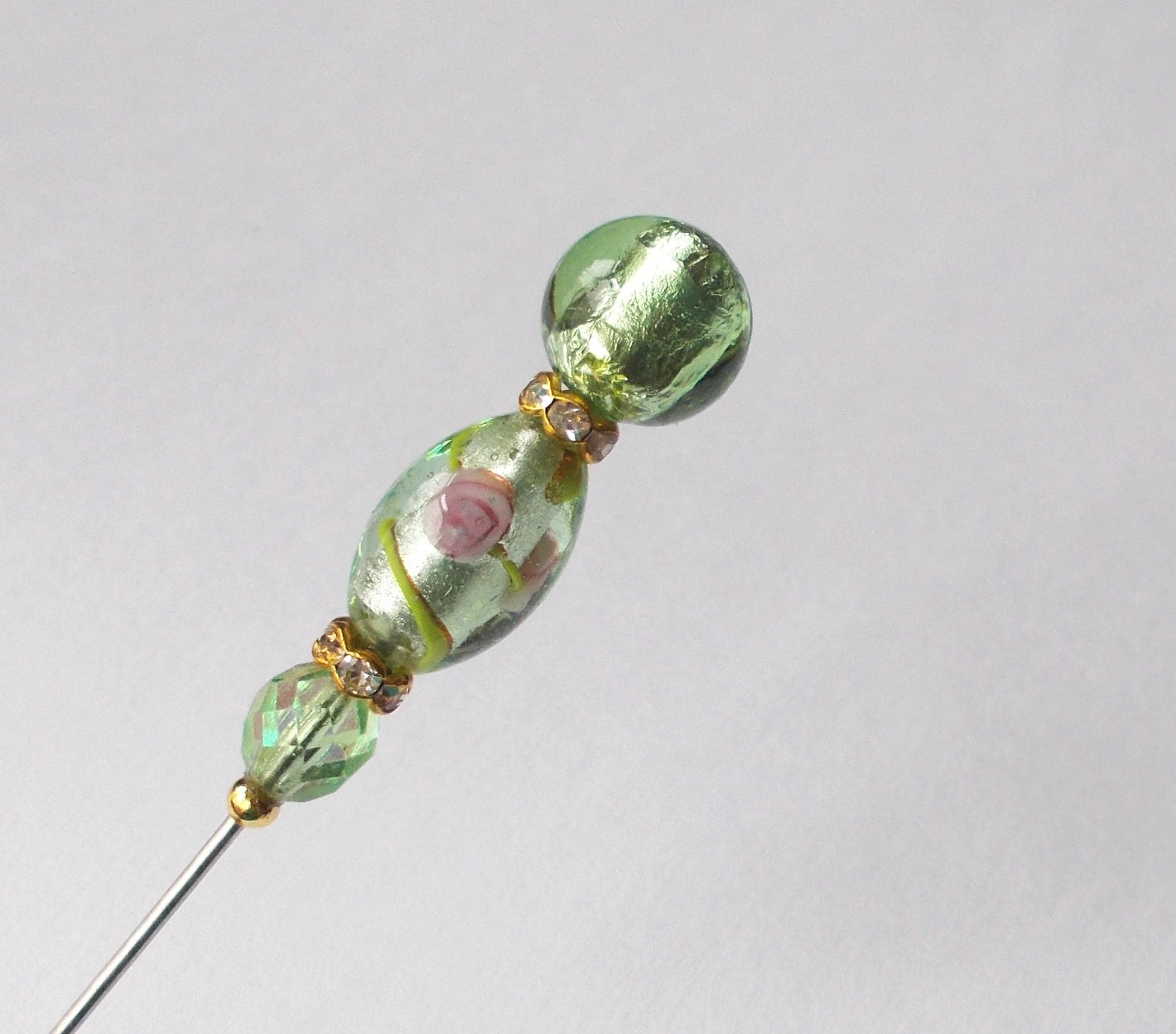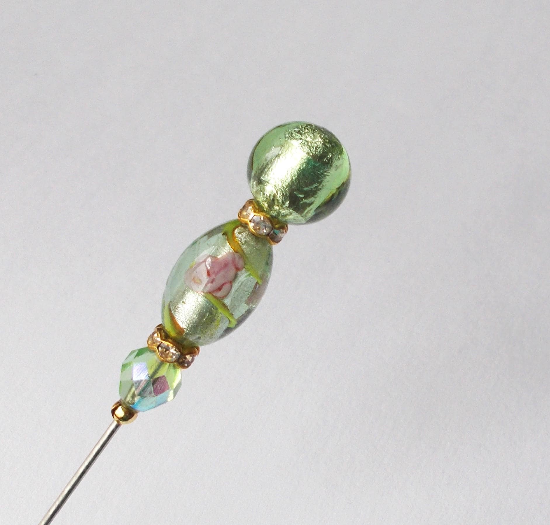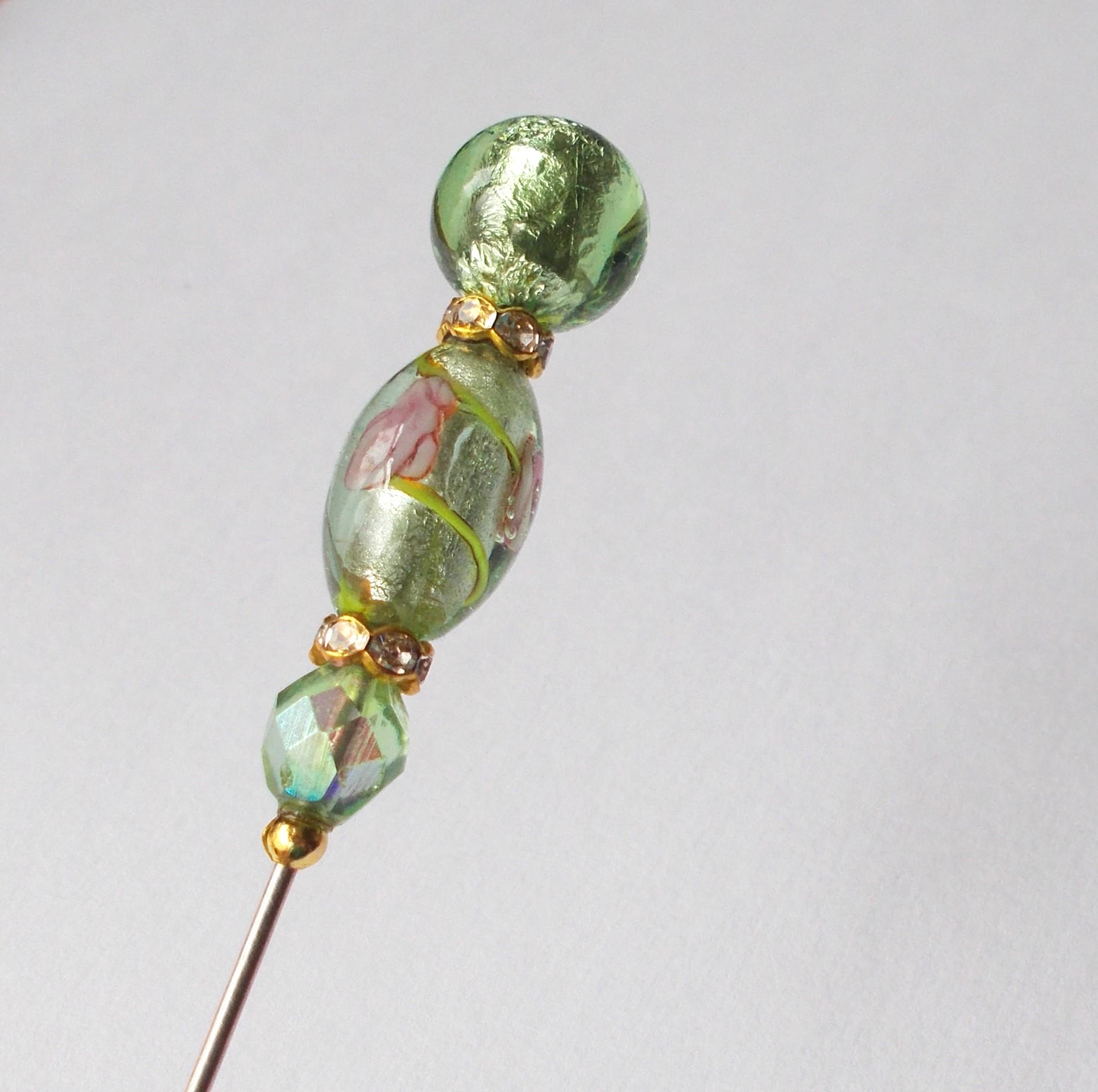Pretty limited edition hatpin that I made using a mix of lovely pale green glass beads, gold coloured findings, 1.2mm diameter steel pin and hatpin 6.25 inches long in total, comes with pin protector and will be sent in a gift box.