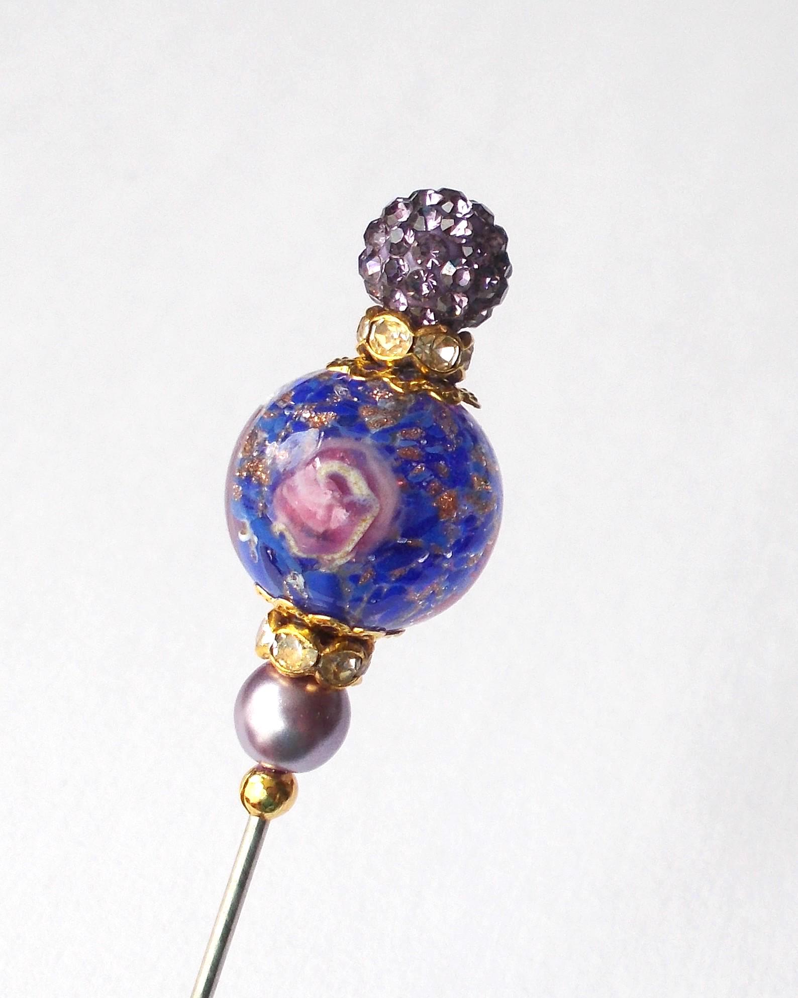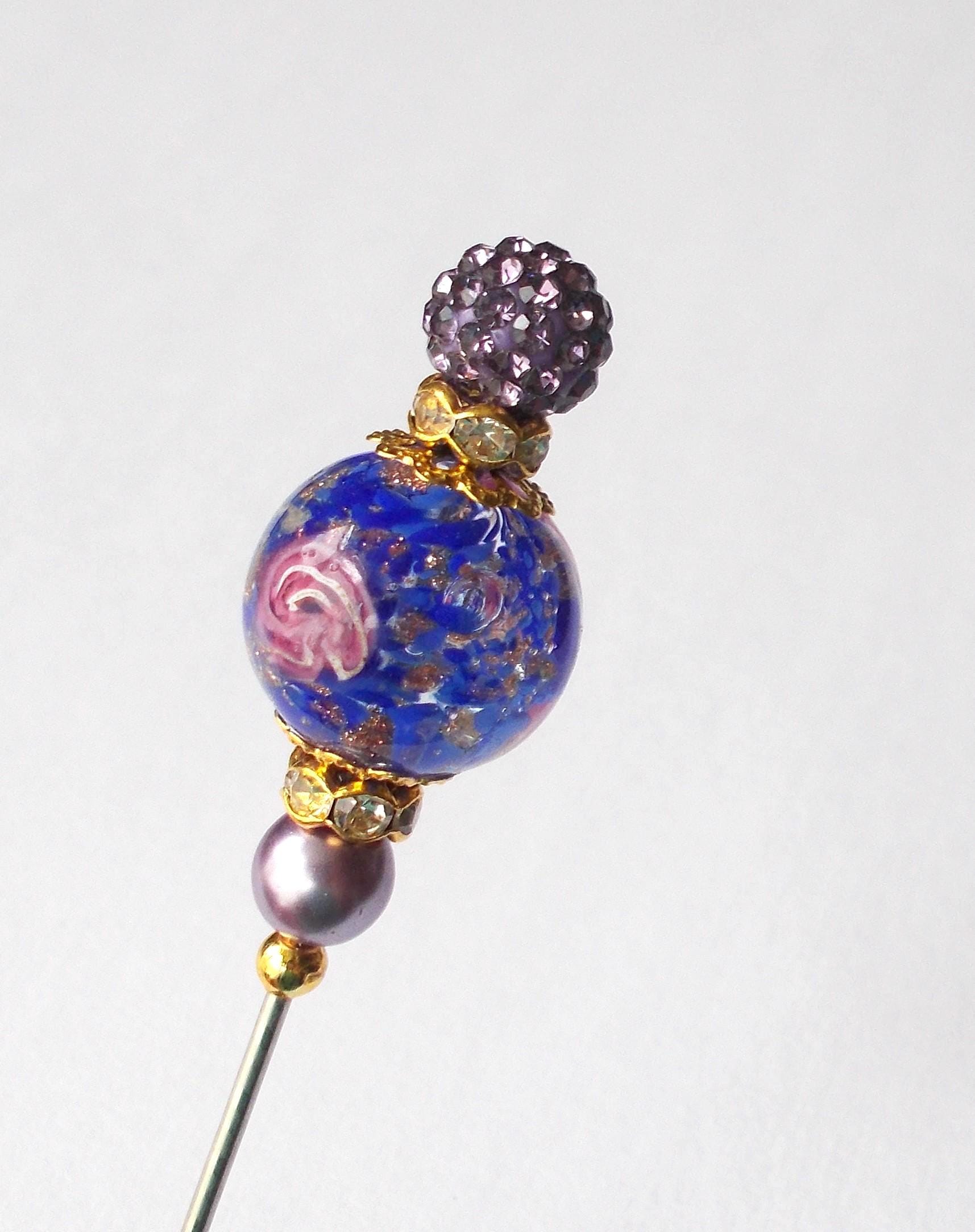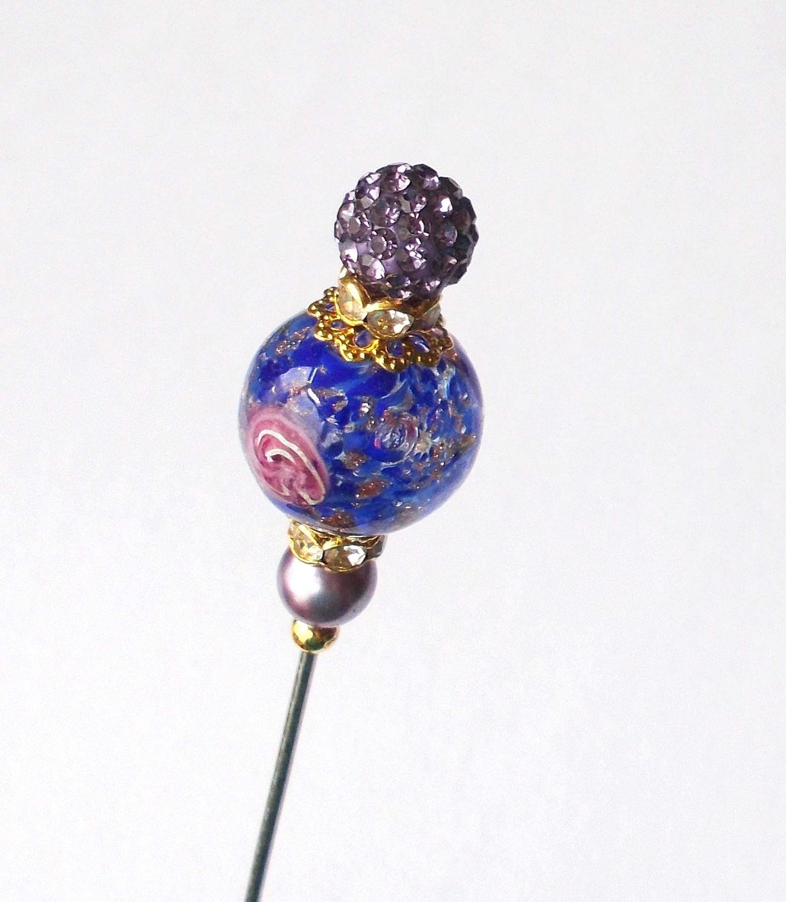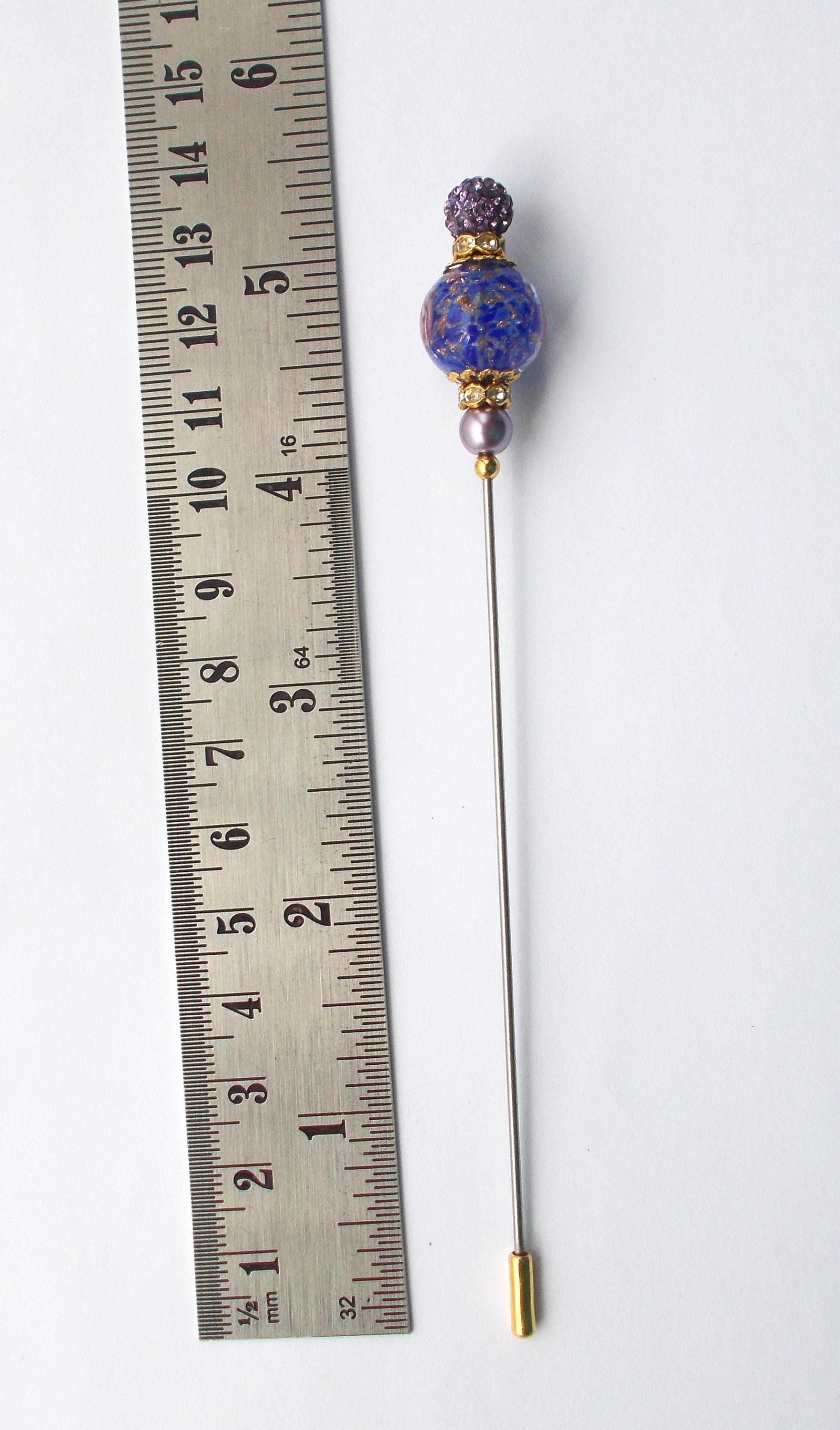 Hatpin - Blue & Lilac Gold Sommerso Venetian Glass Hatpin - 5.25 Inches Long - 1.2mm Diameter Steel Hat Pin