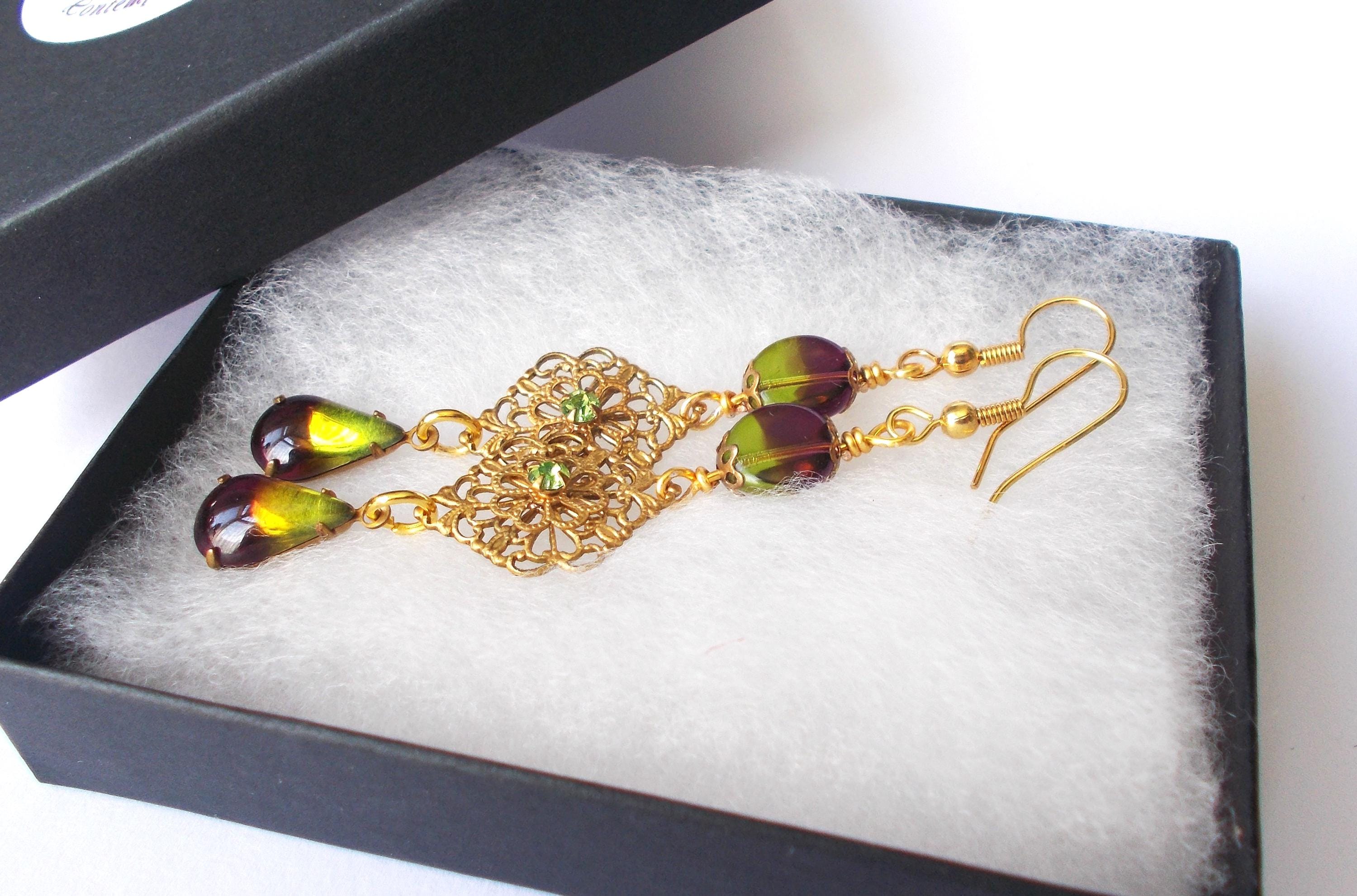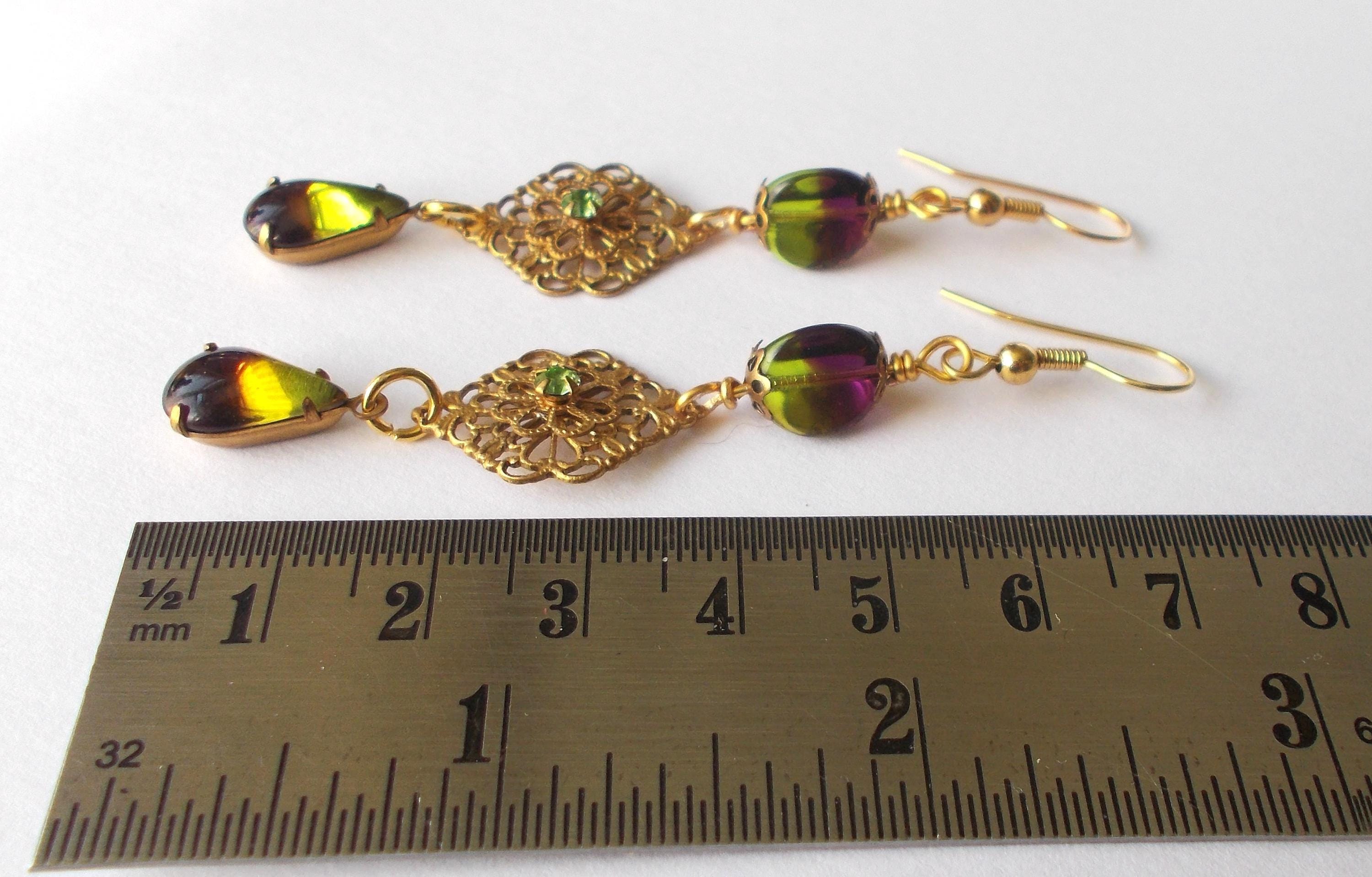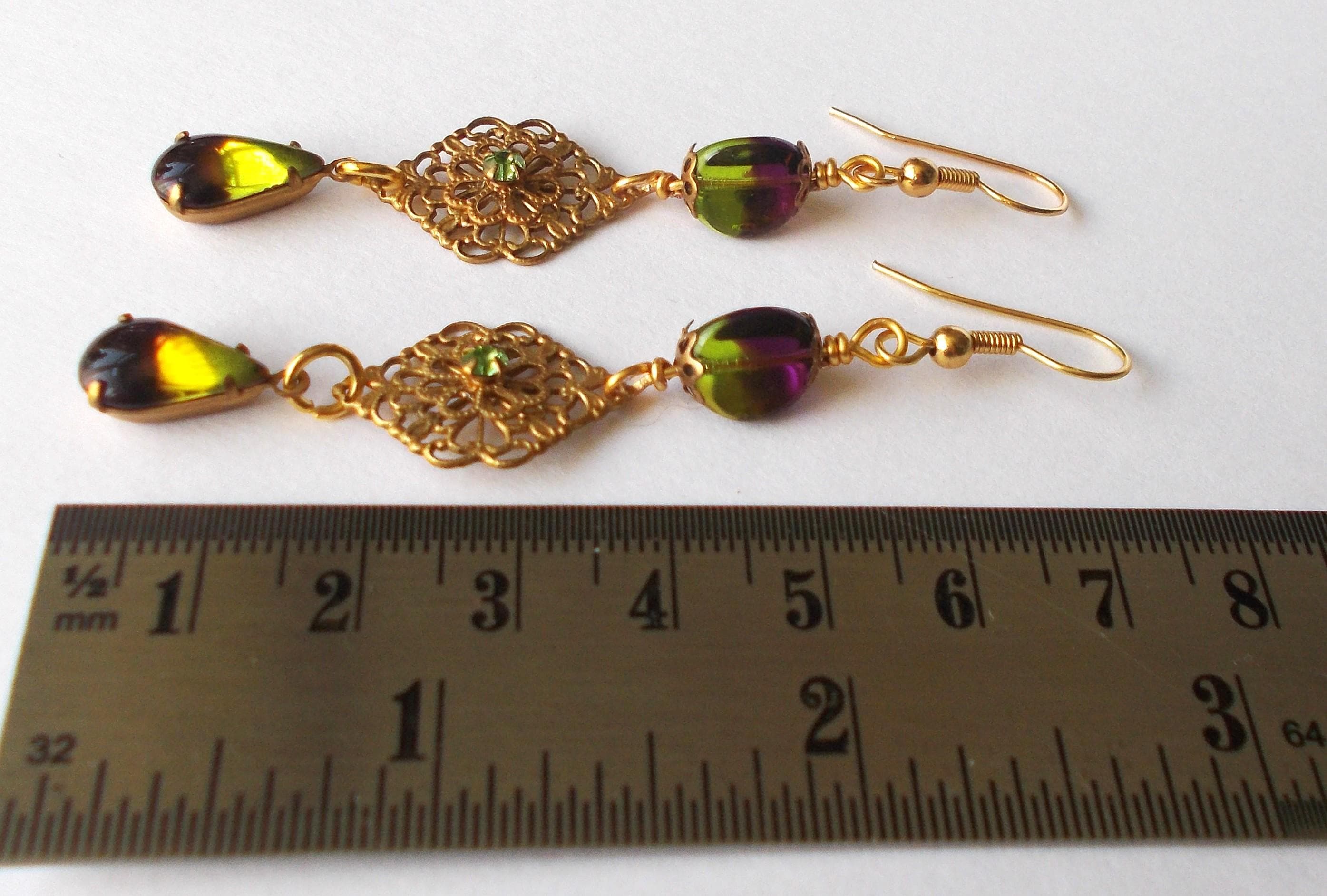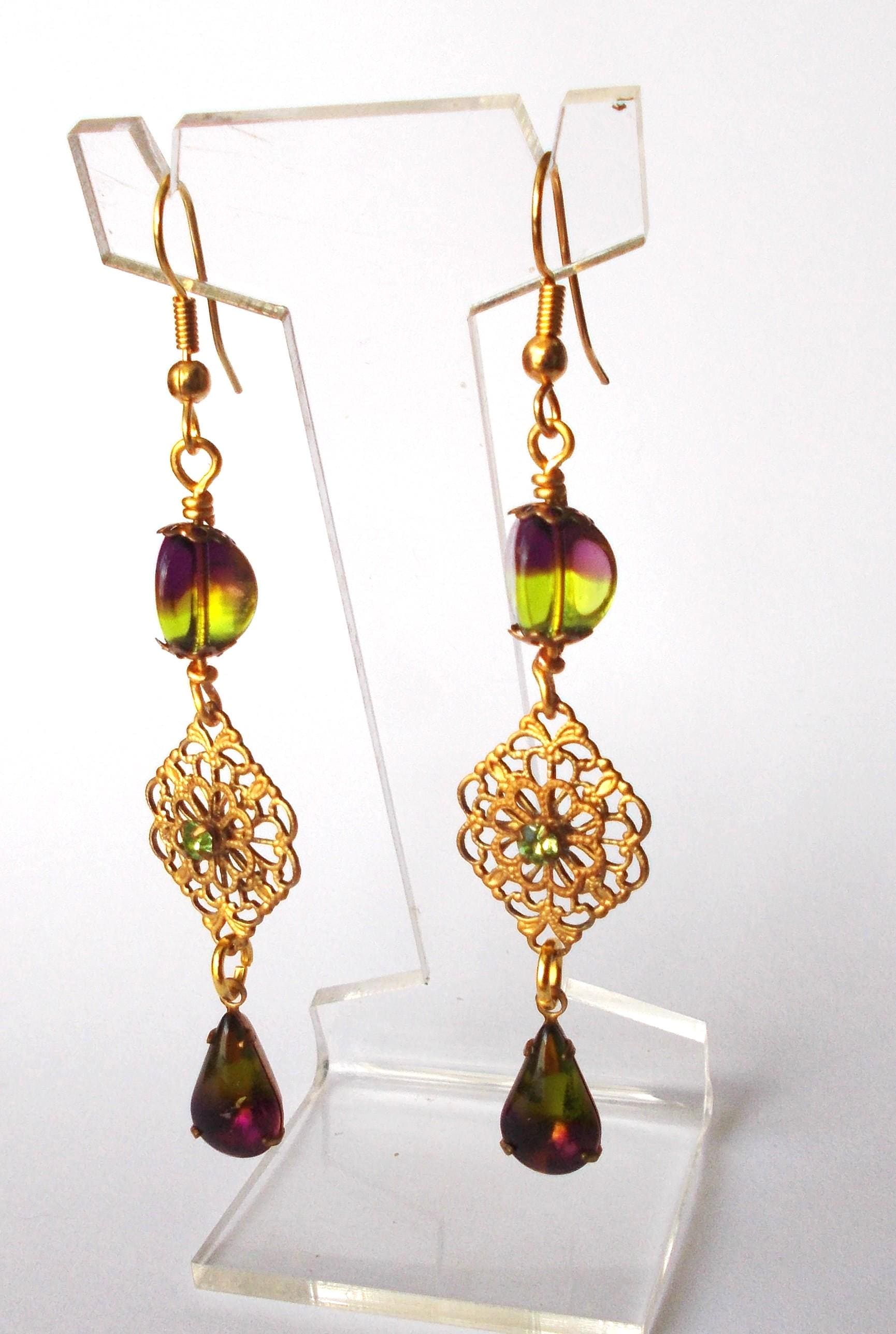 Ask a questionHandmade artisan Victorian / Art Nouveau inspired vintage glass bead and rhinestone earrings, brass findings, earrings are approx. 7 cms long and will be sent in a gift box as shown.