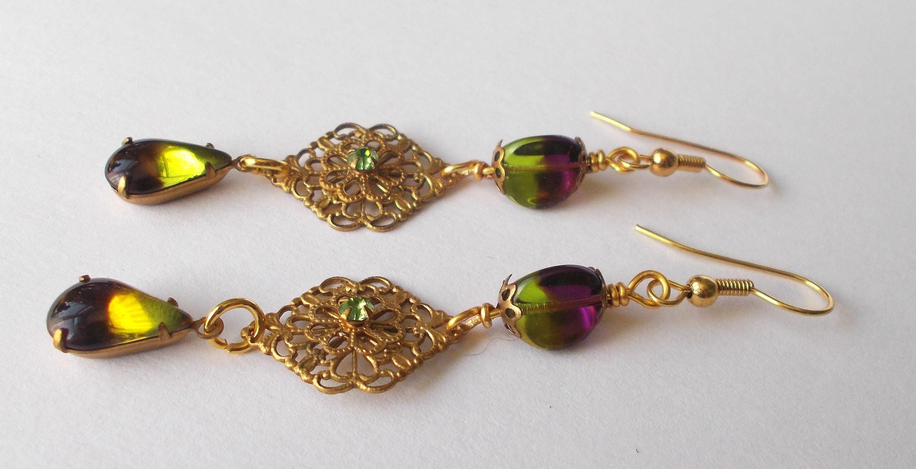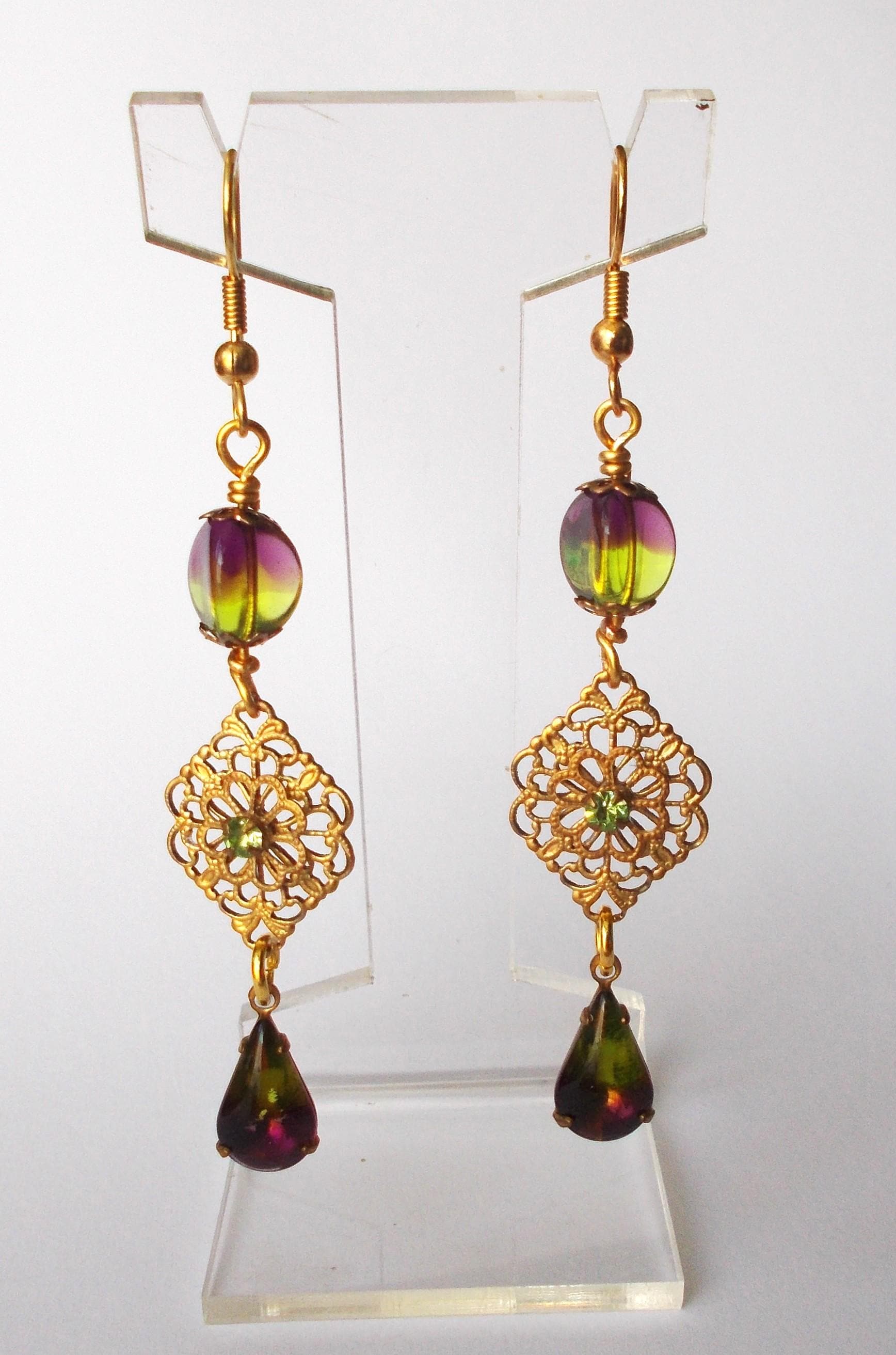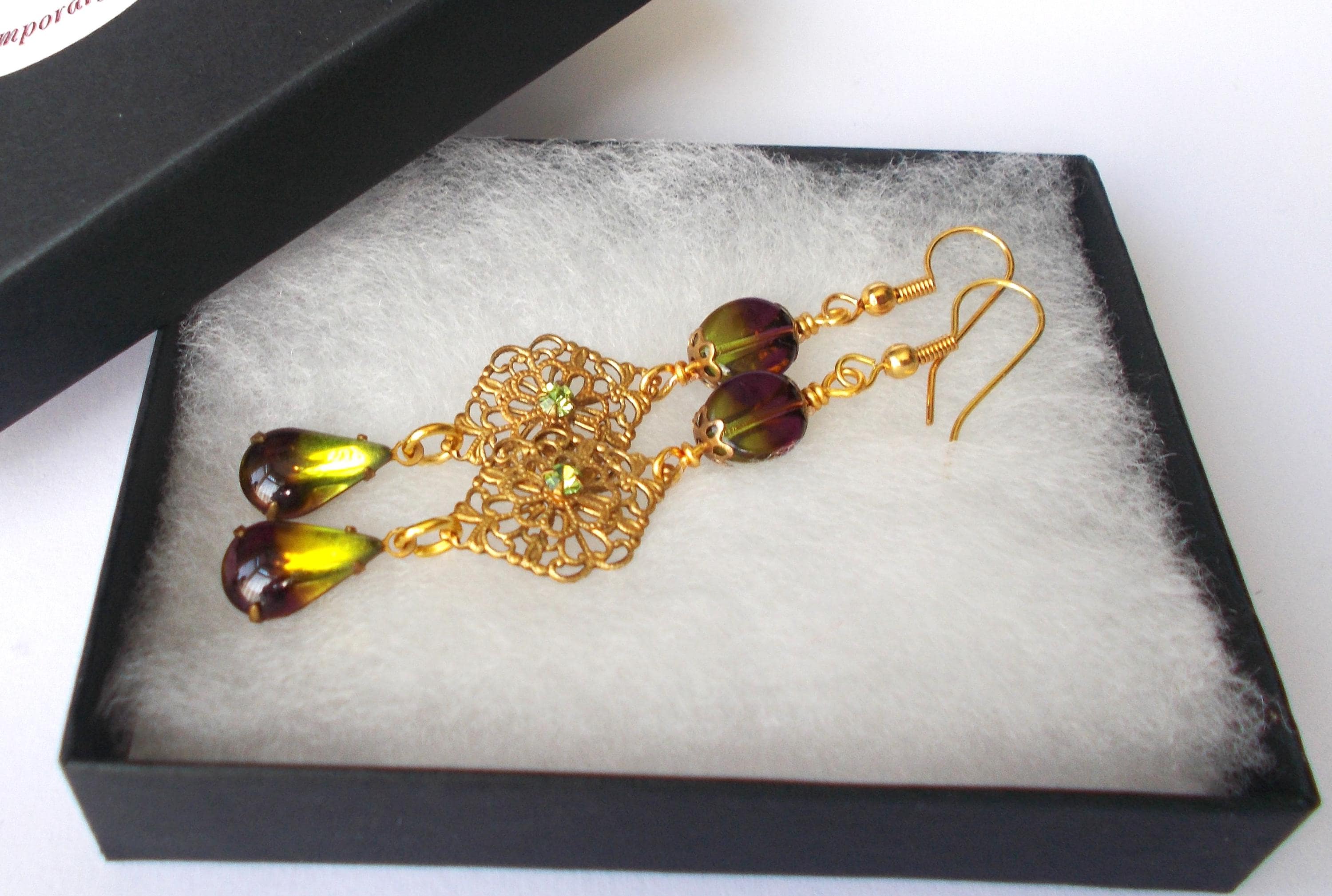 Ask a questionHandmade artisan Victorian / Art Nouveau inspired vintage glass bead and rhinestone earrings, brass findings, earrings are approx. 7 cms long and will be sent in a gift box as shown.