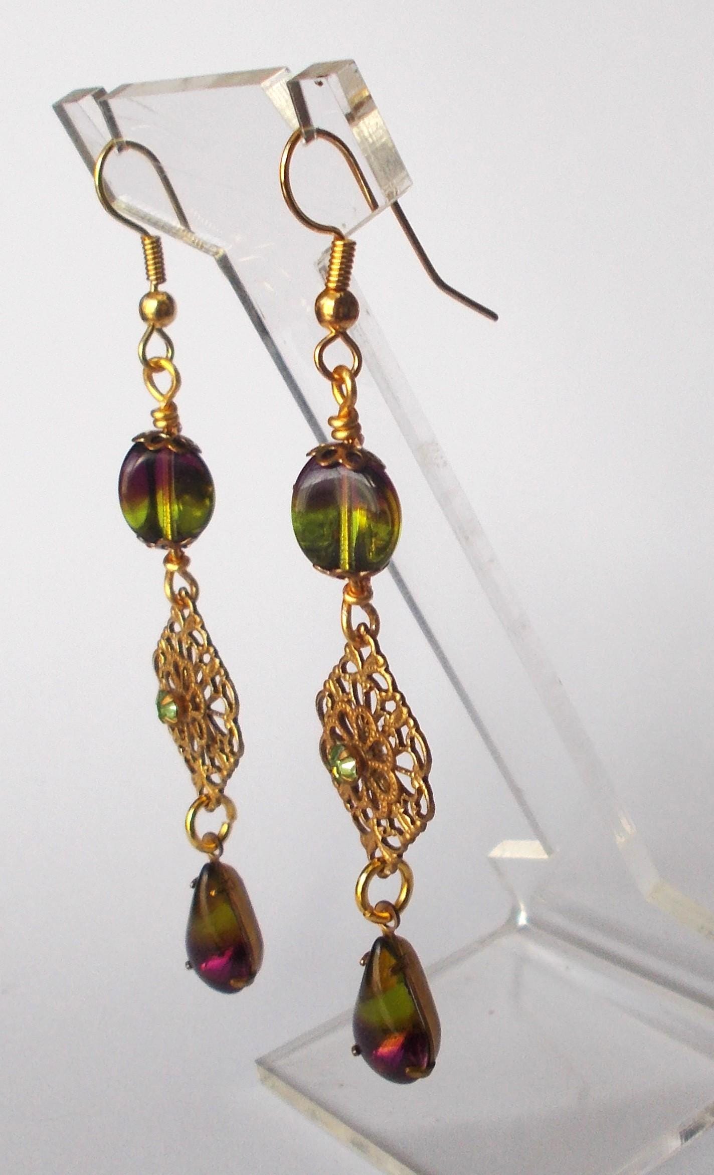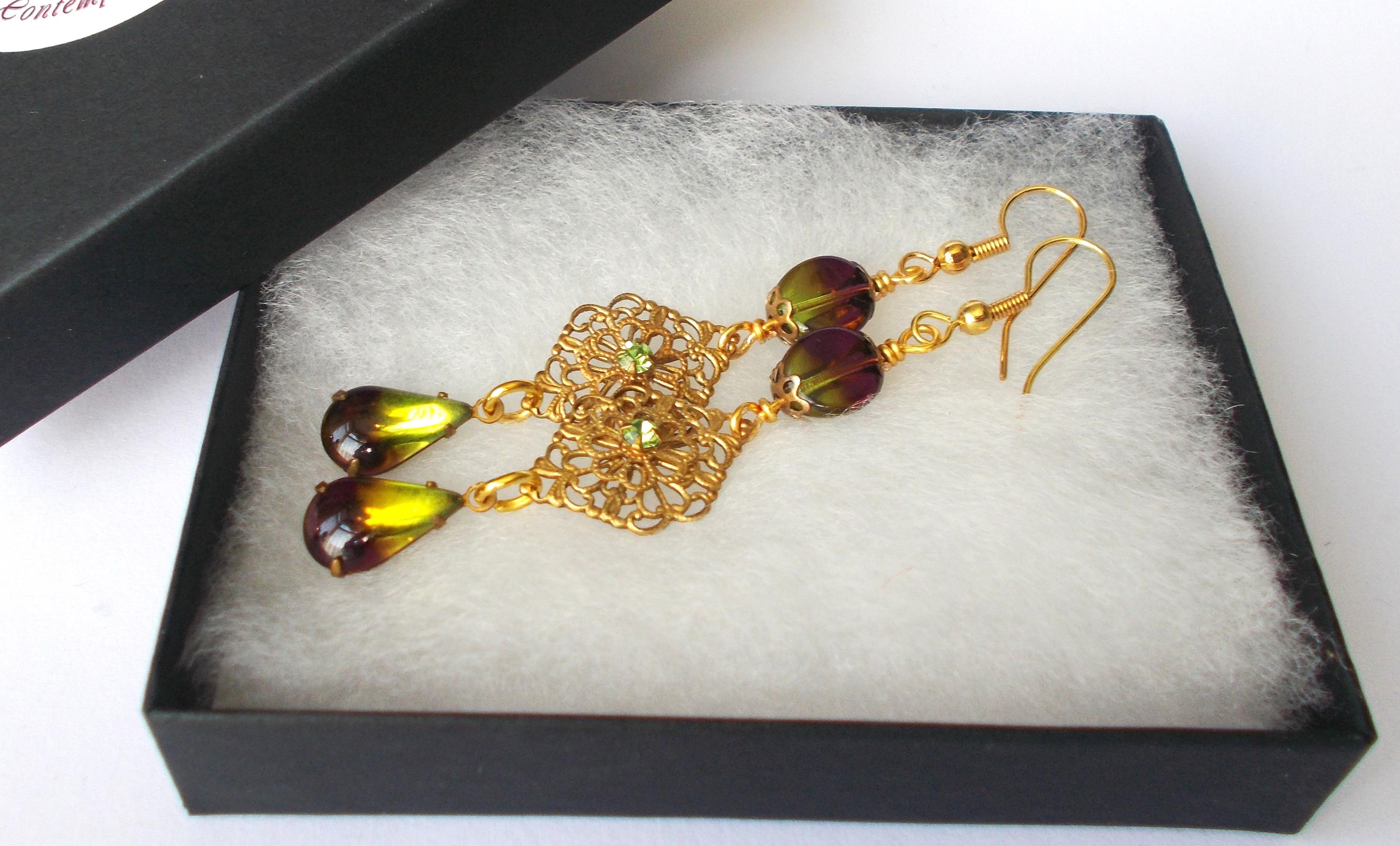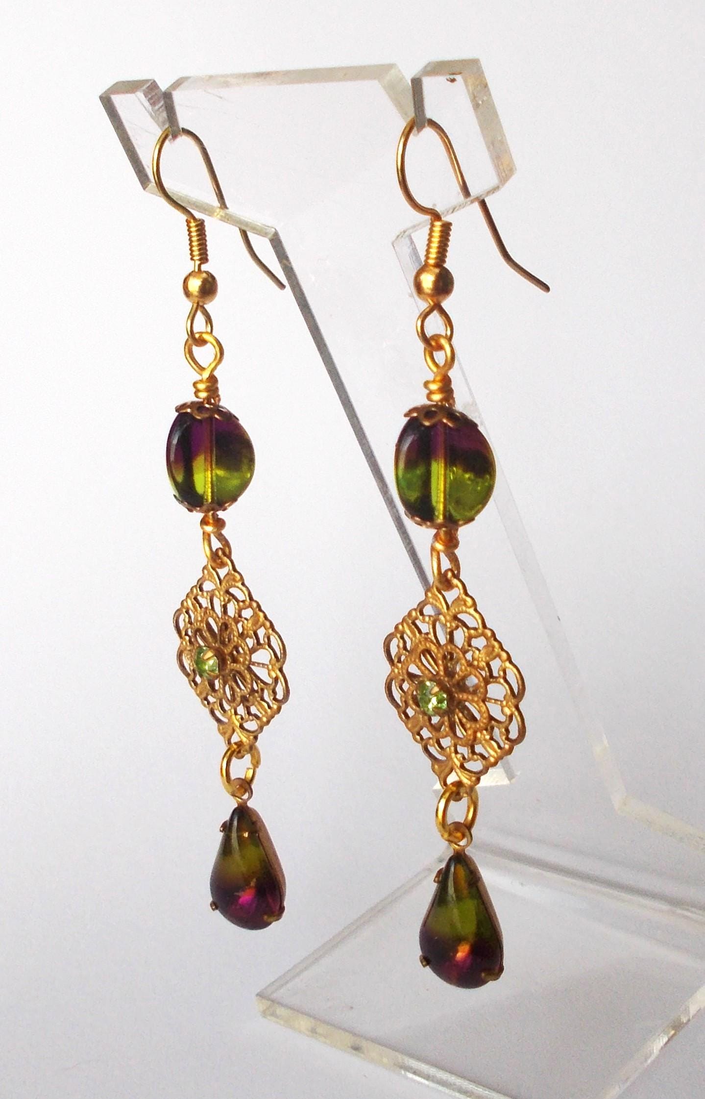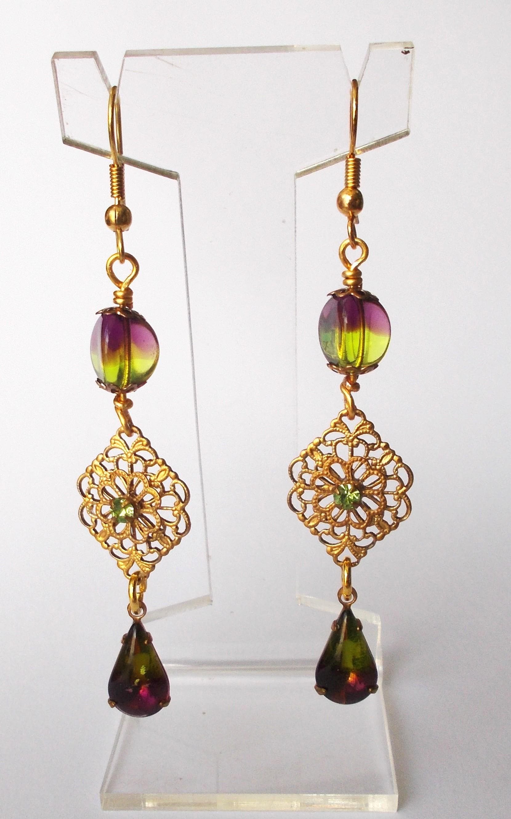 Ask a questionHandmade artisan Victorian / Art Nouveau inspired vintage glass bead and rhinestone earrings, brass findings, earrings are approx. 7 cms long and will be sent in a gift box as shown.