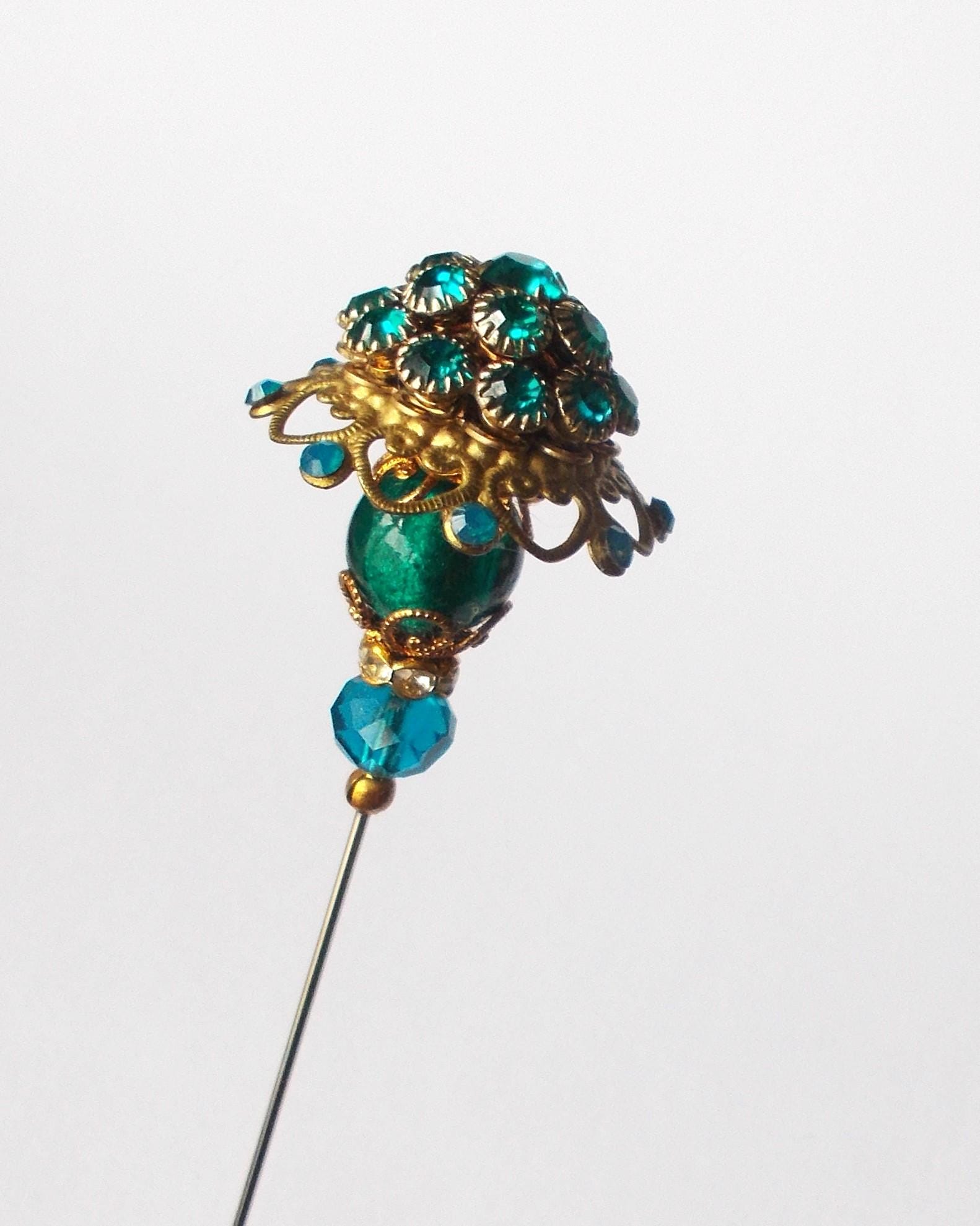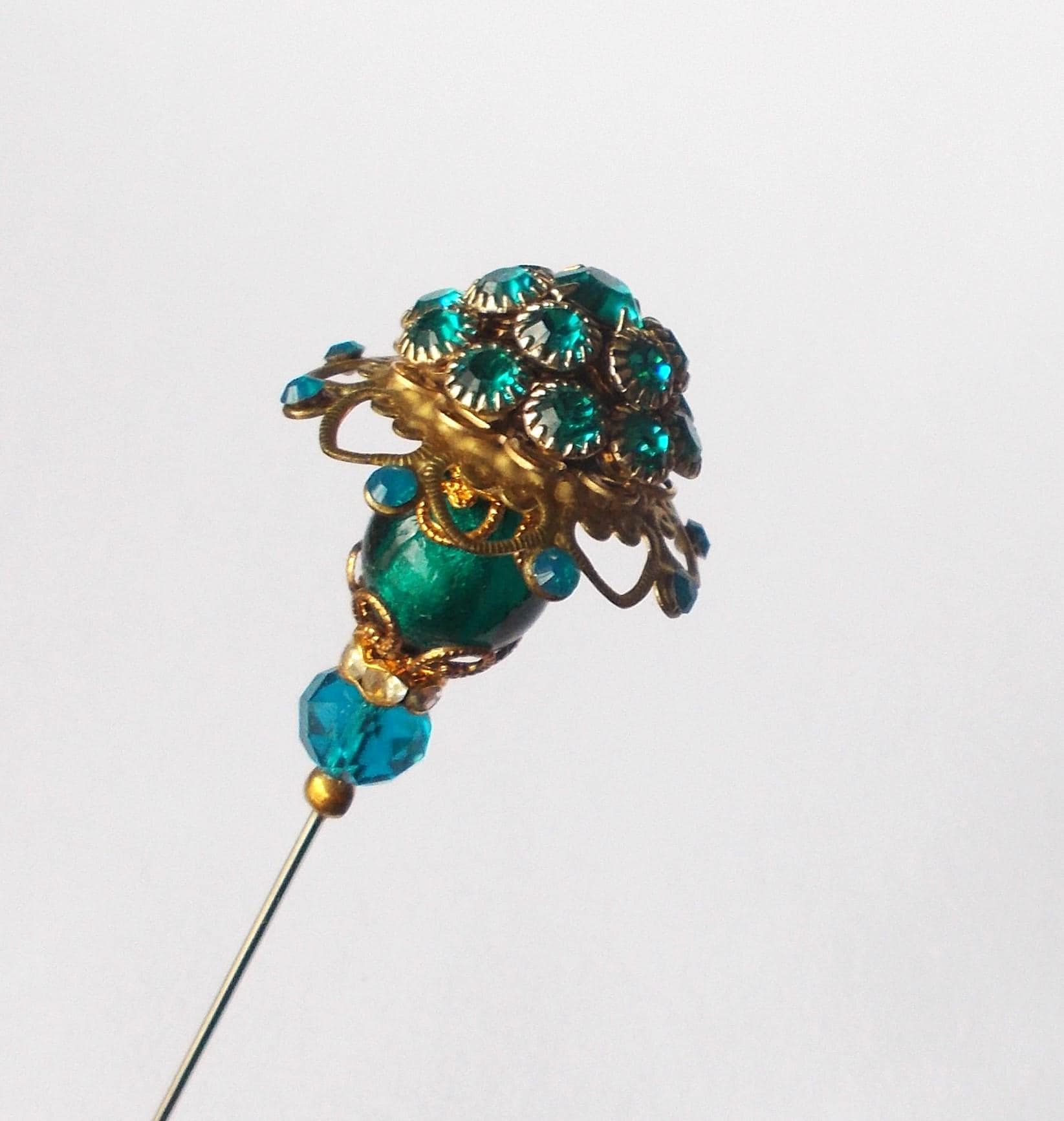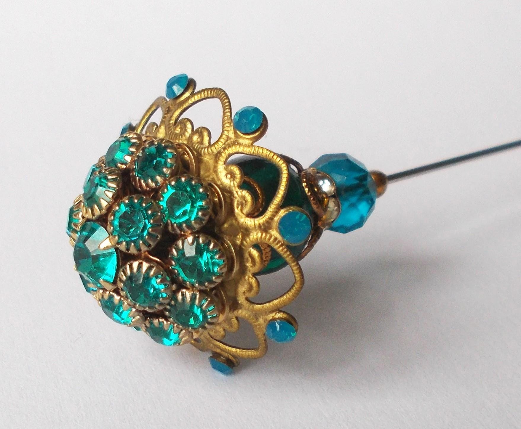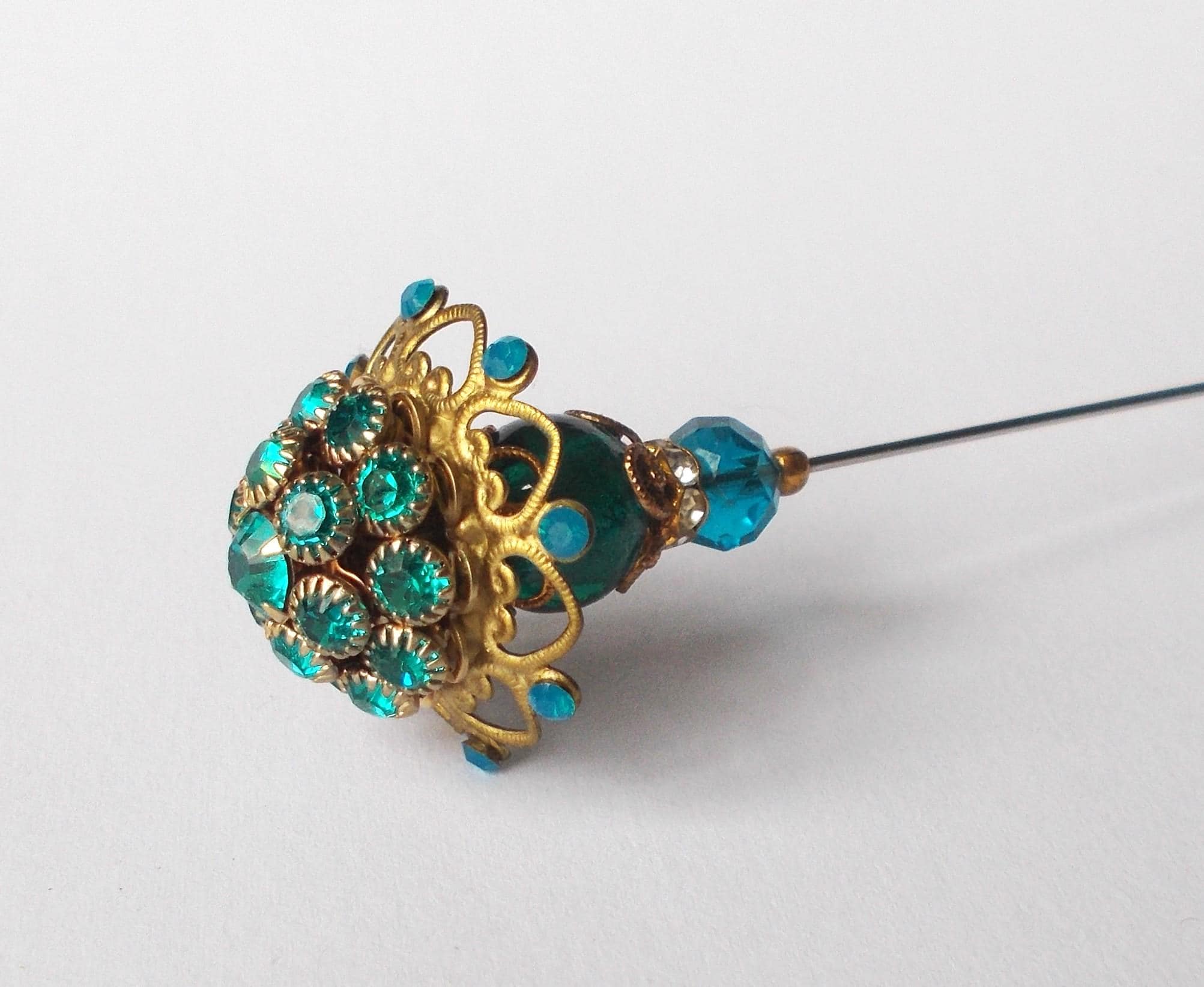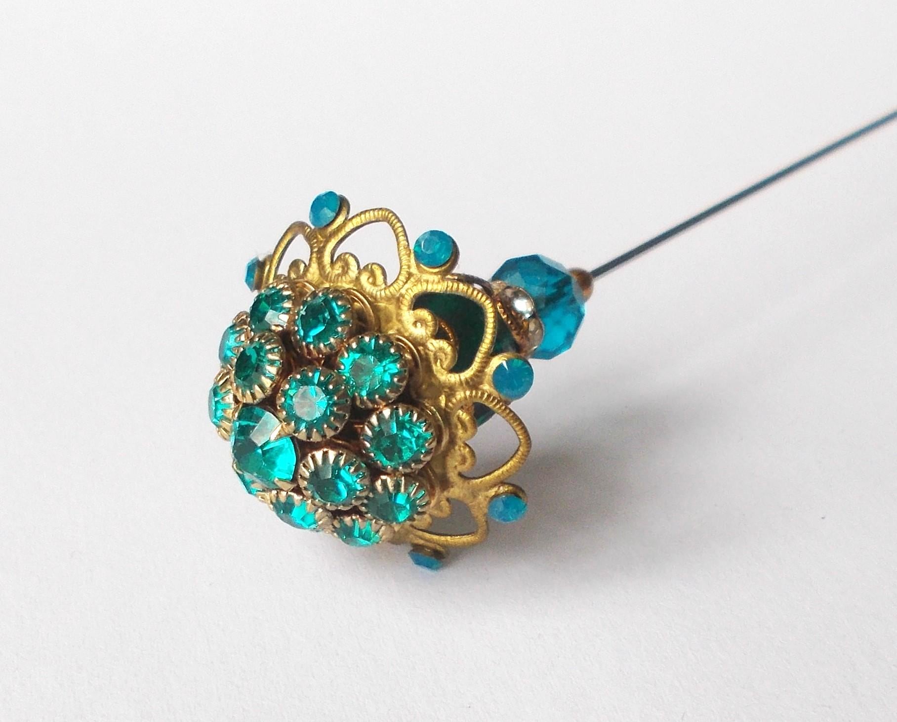 Stunning limited edition hatpin that I made using a vintage teal rhinestone decorated brass coloured metal top and blue glass beads, steel pin 1mm diameter and hatpin is 7 inches long in total, comes with pin protector and will be sent in a gift box.