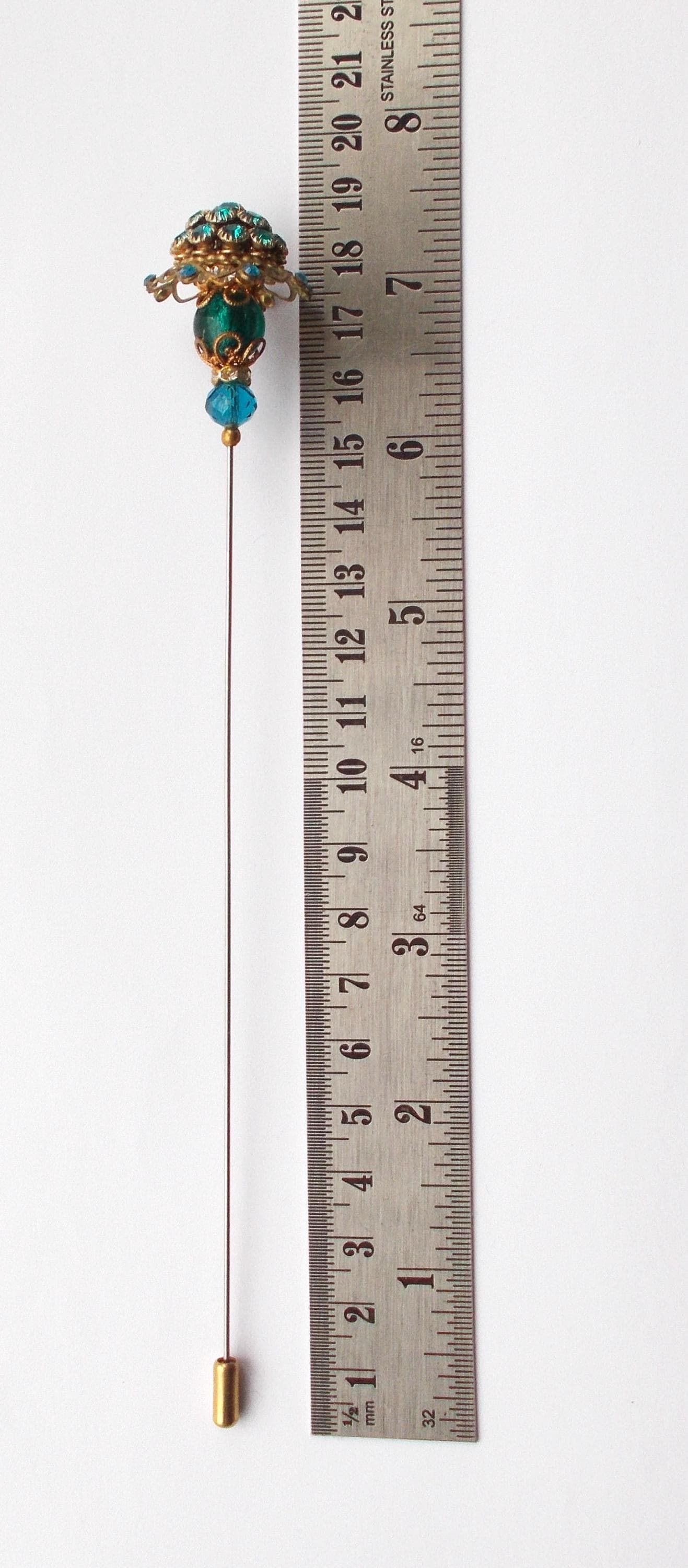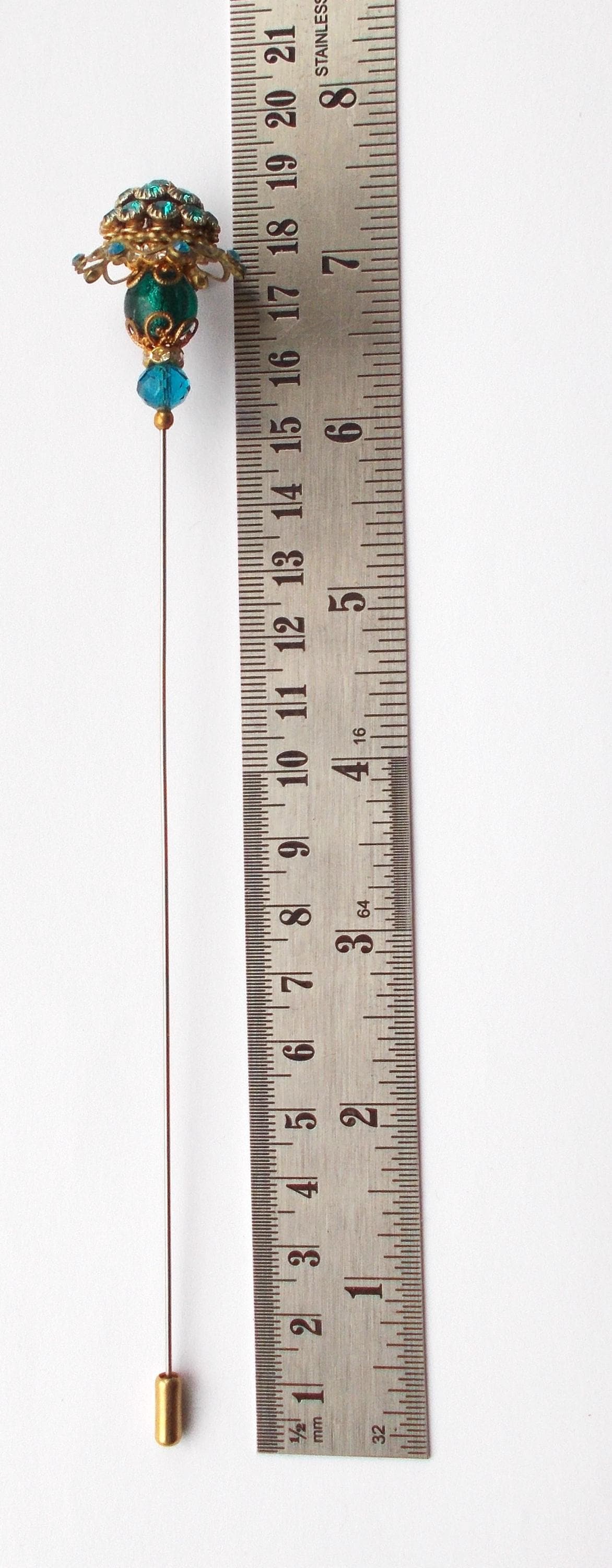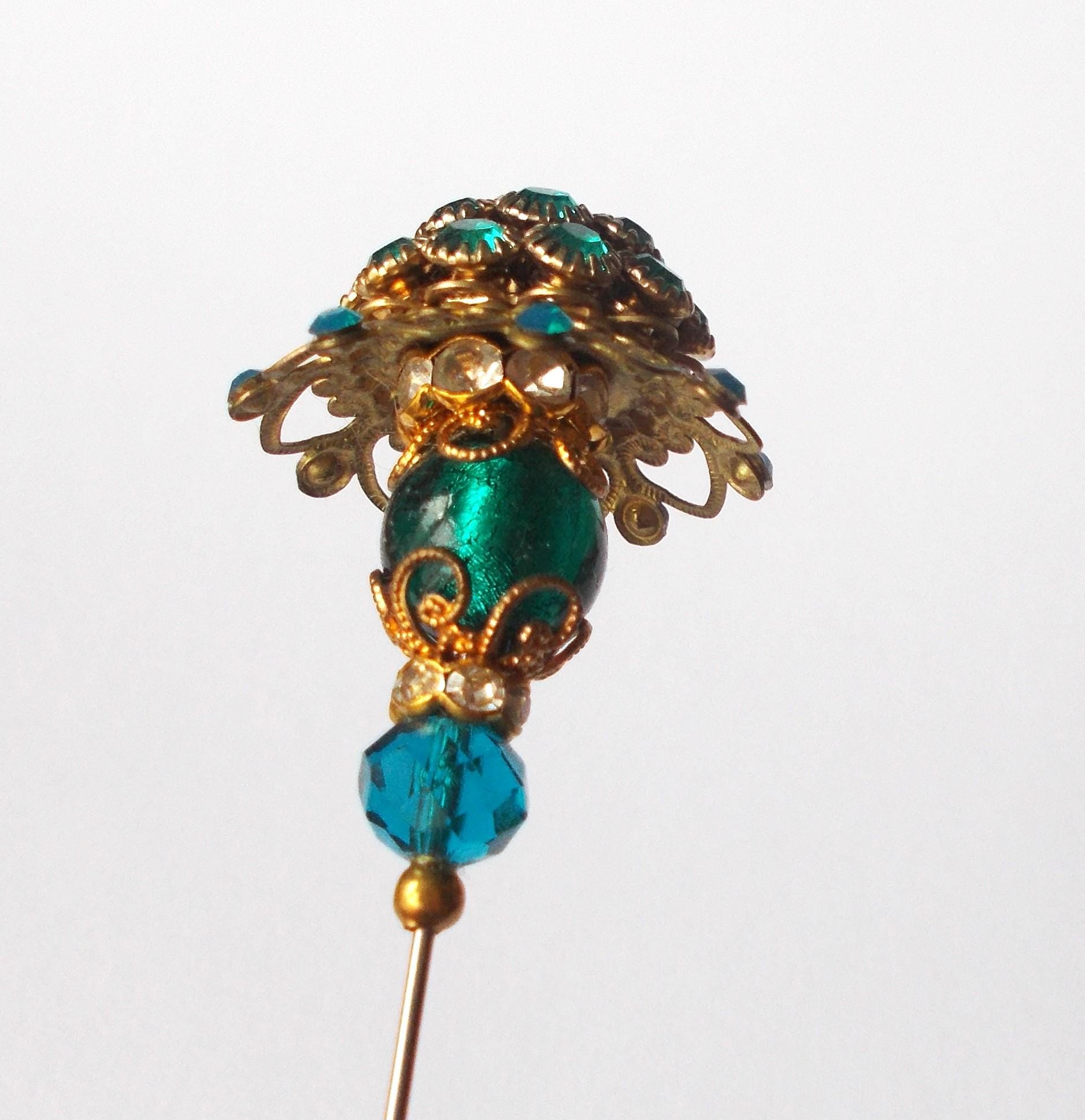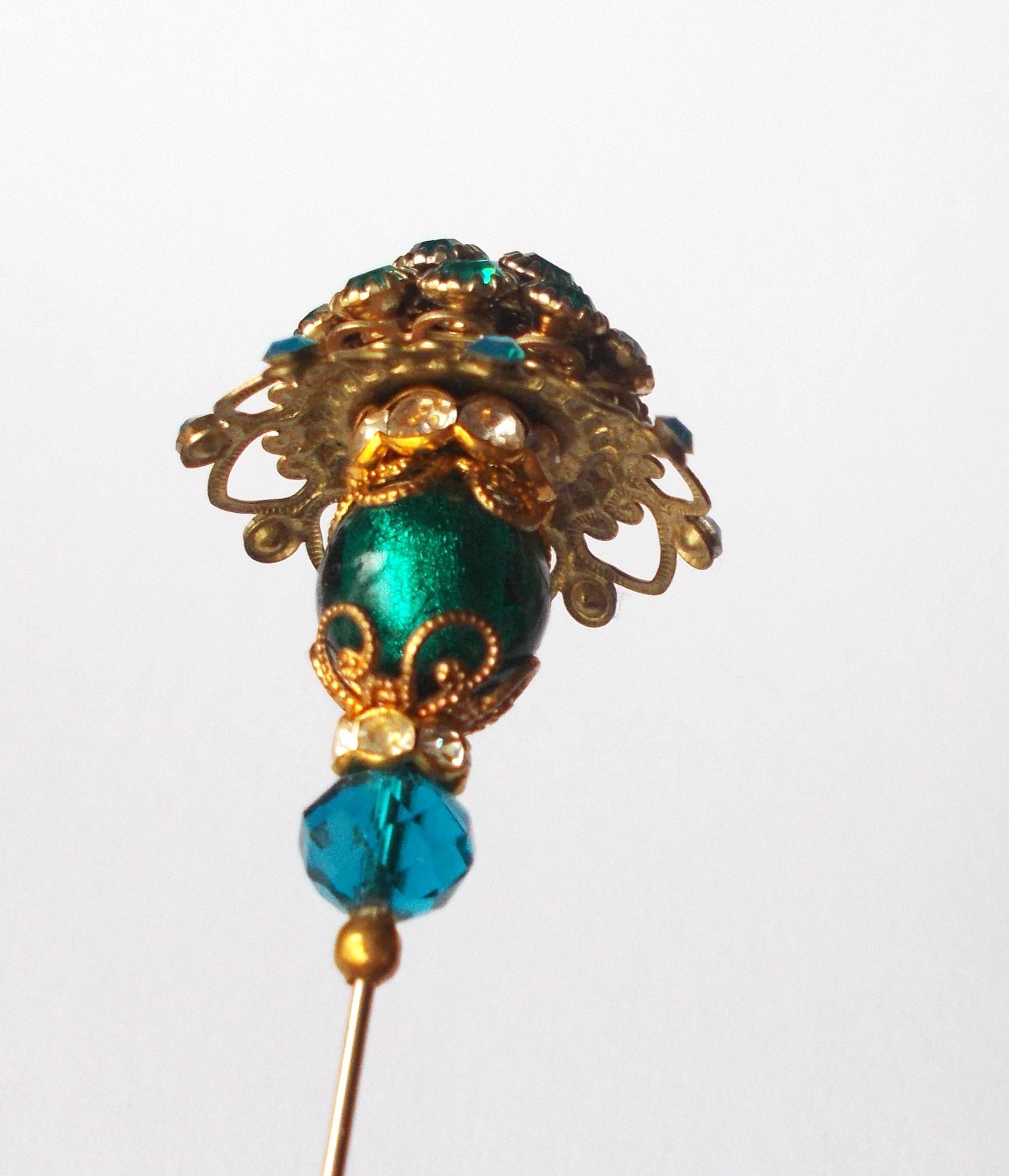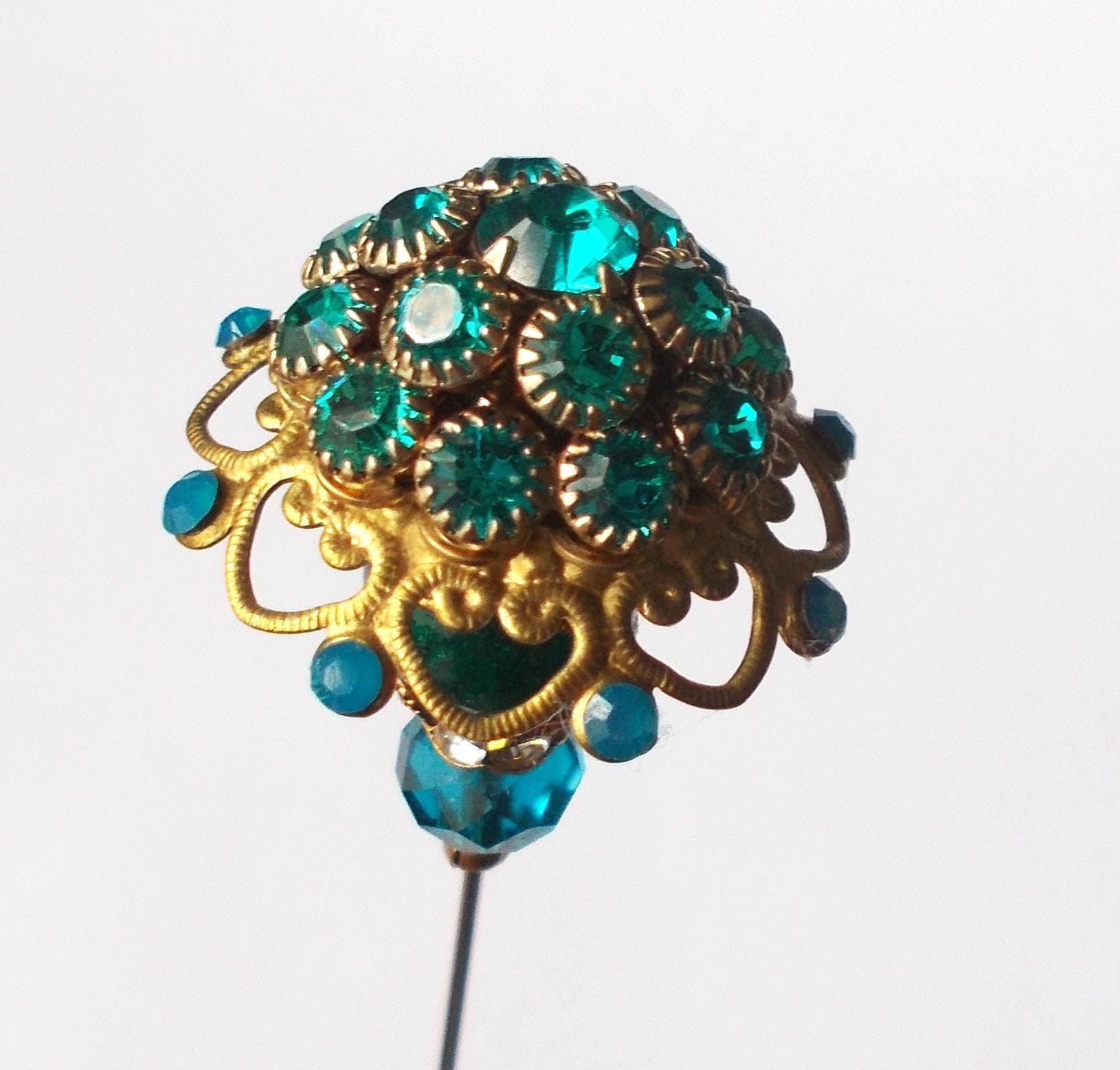 Stunning limited edition hatpin that I made using a vintage teal rhinestone decorated brass coloured metal top and blue glass beads, steel pin 1mm diameter and hatpin is 7 inches long in total, comes with pin protector and will be sent in a gift box.