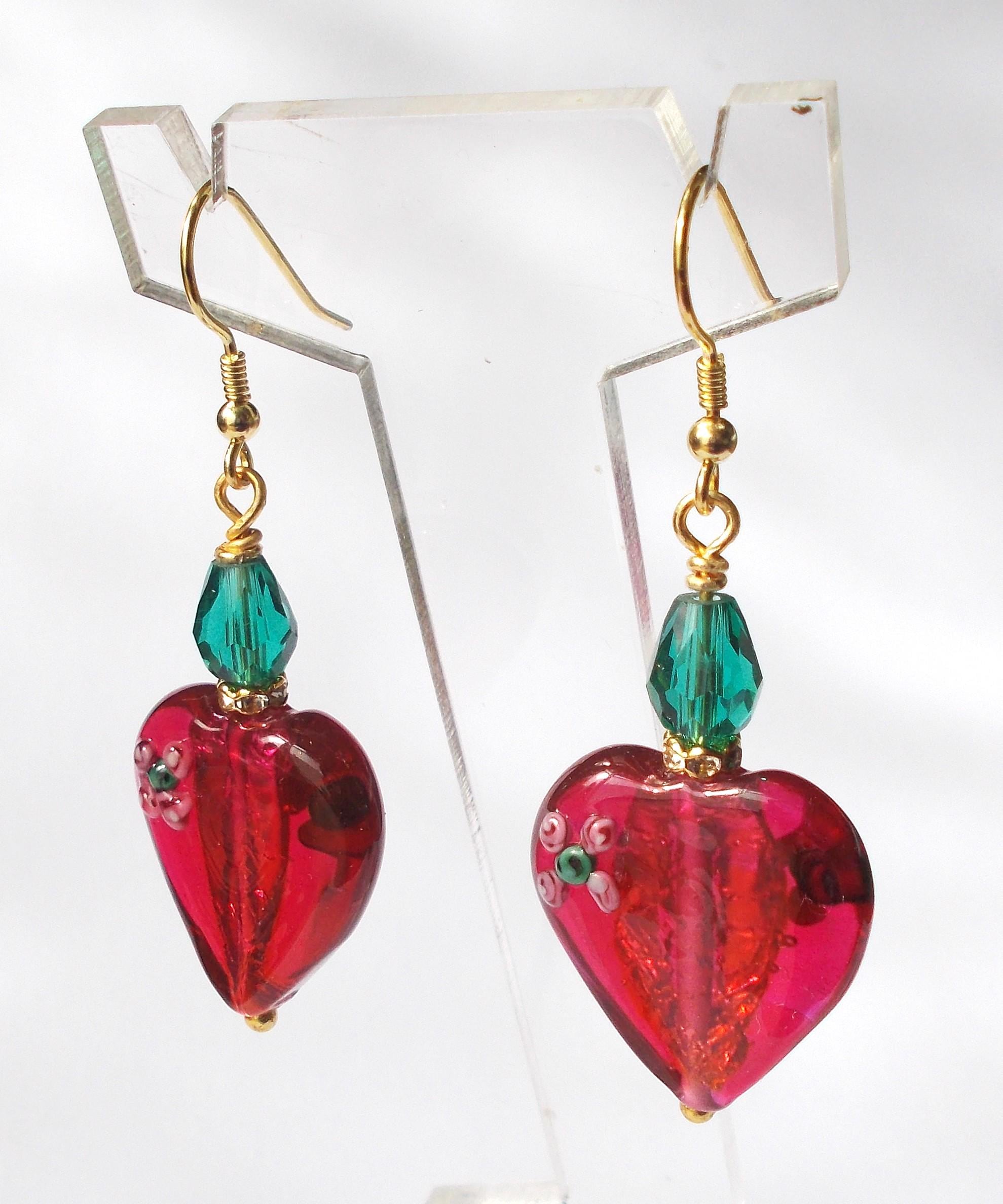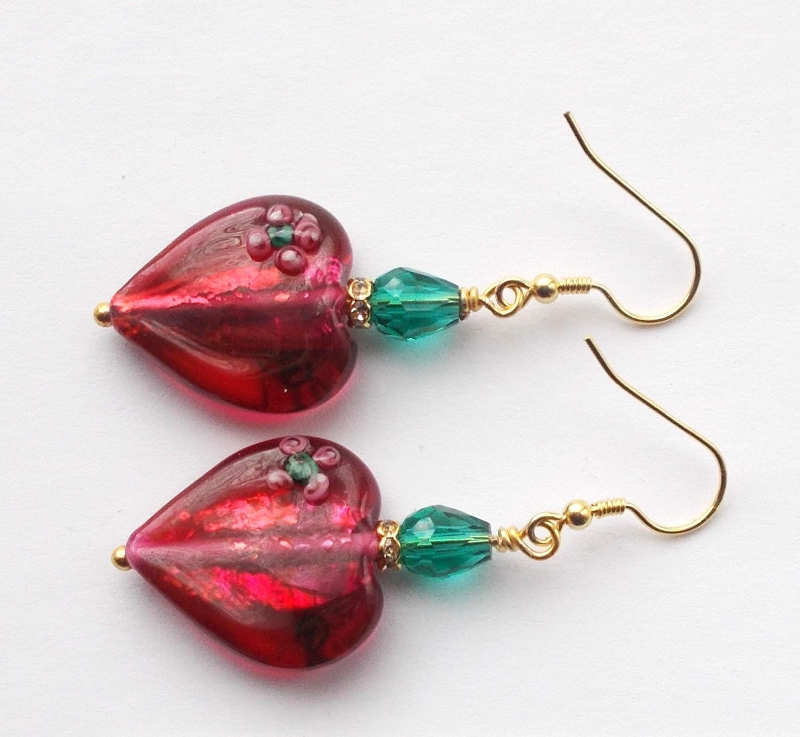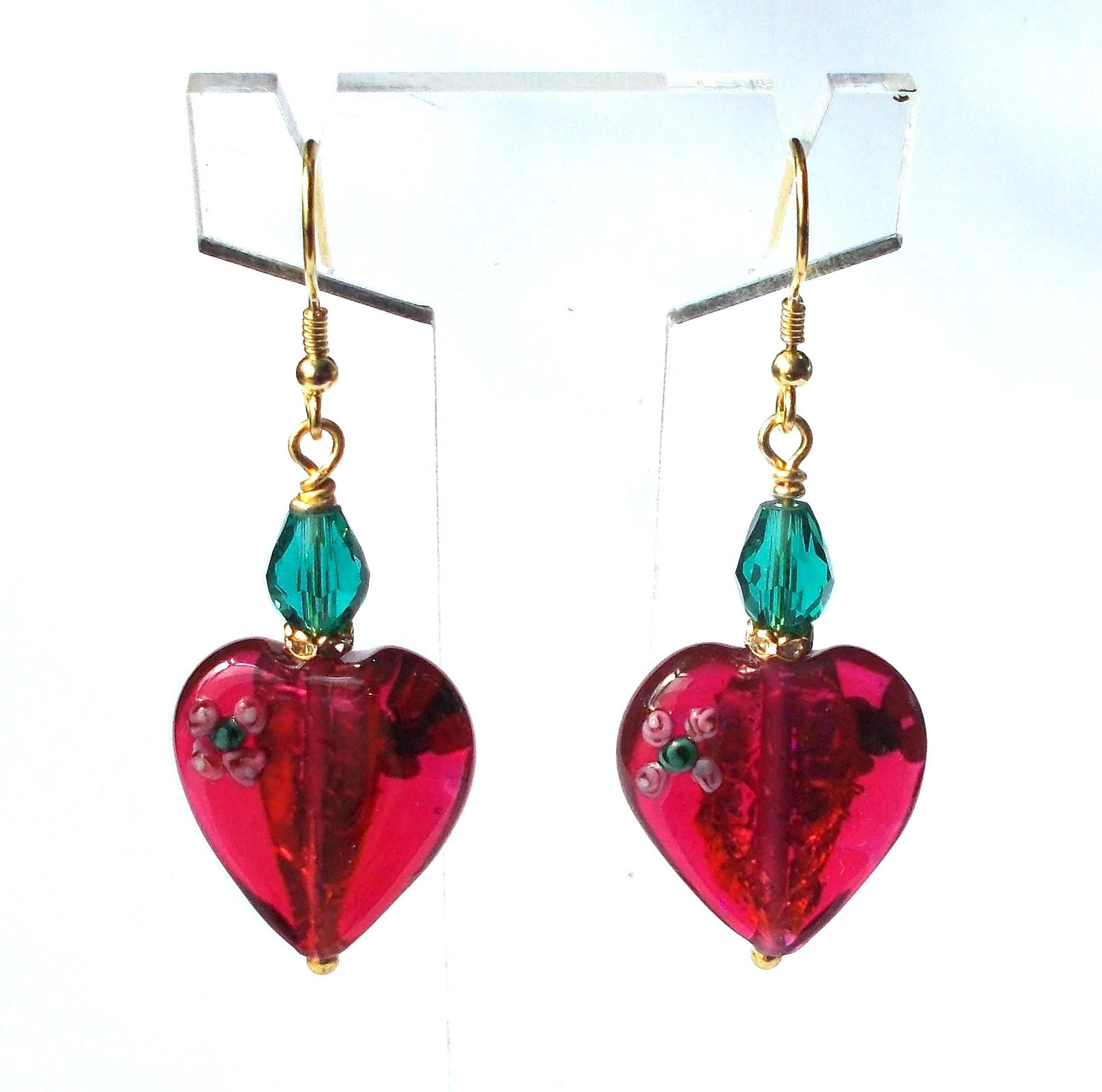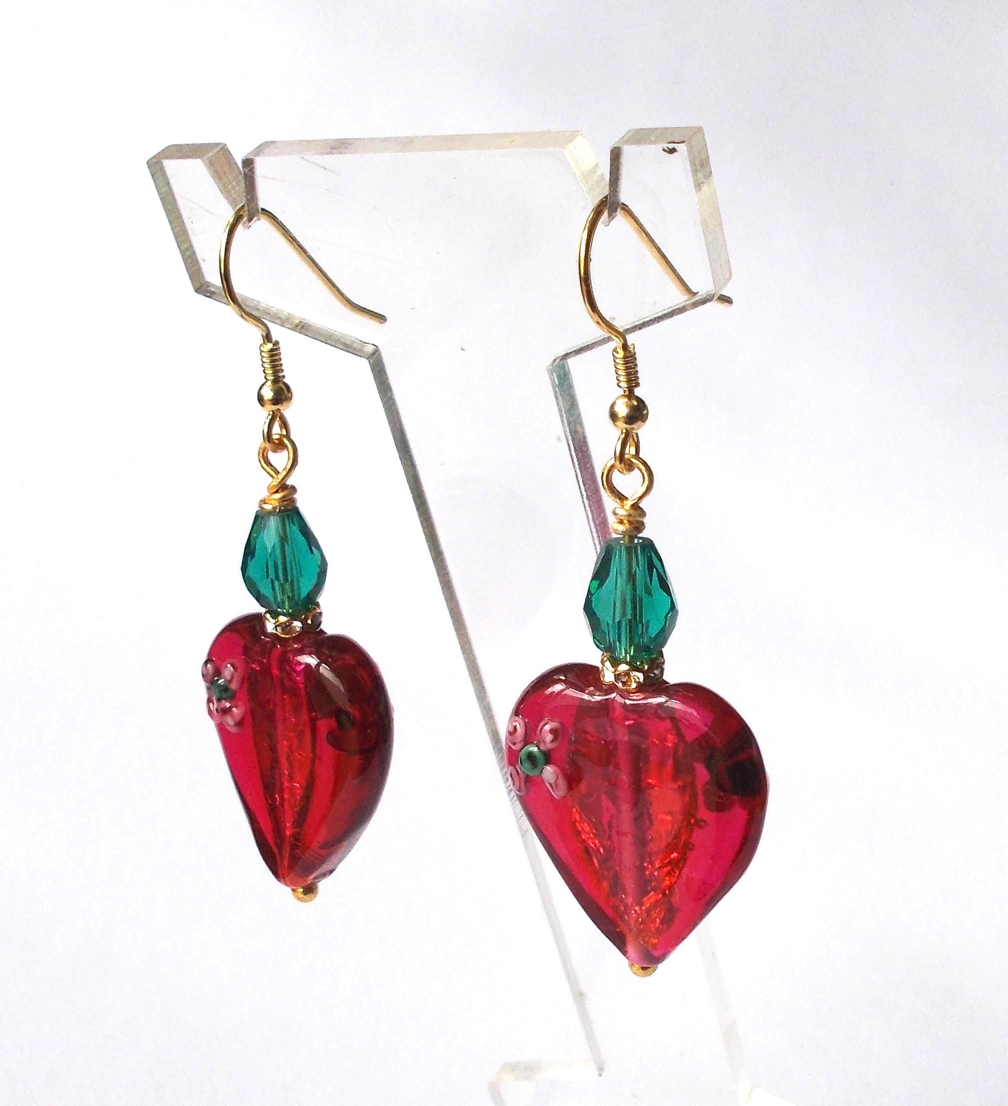 Handmade artisan Victorian / Art Nouveau inspired vintage red glass heart earrings, small green faceted glass beads, brass findings, gold vermeil earring hooks, earrings are approx. 2 inches long and will be sent in a gift box.