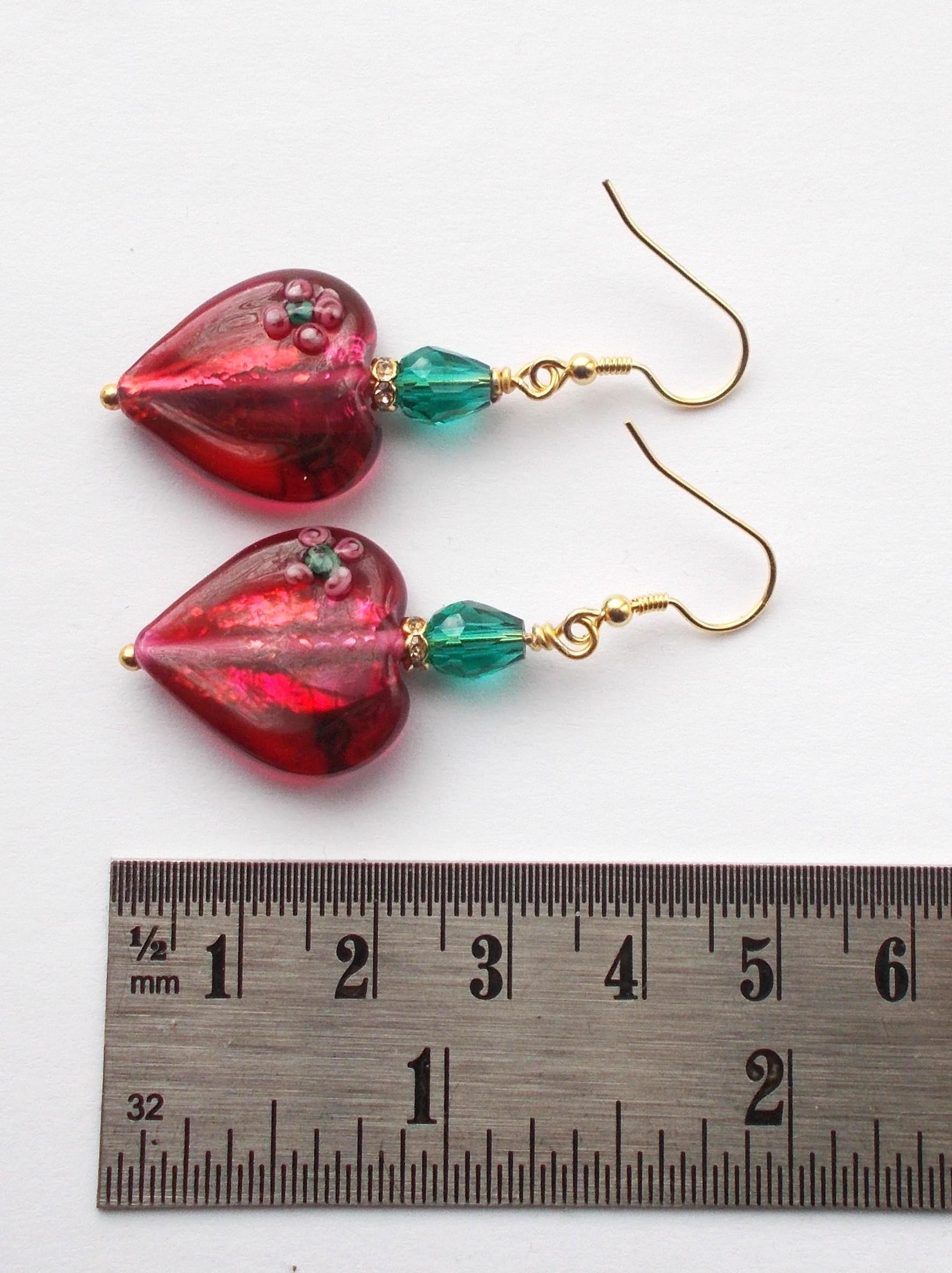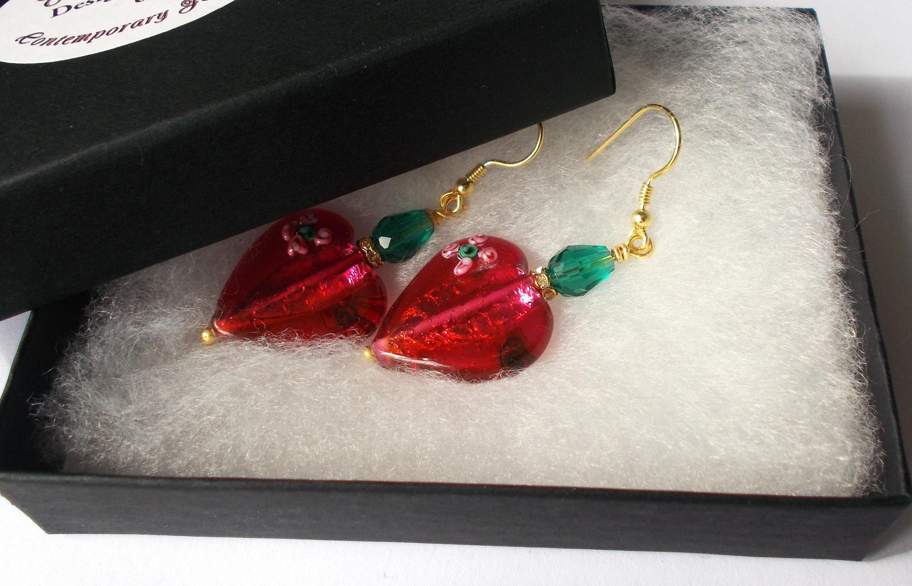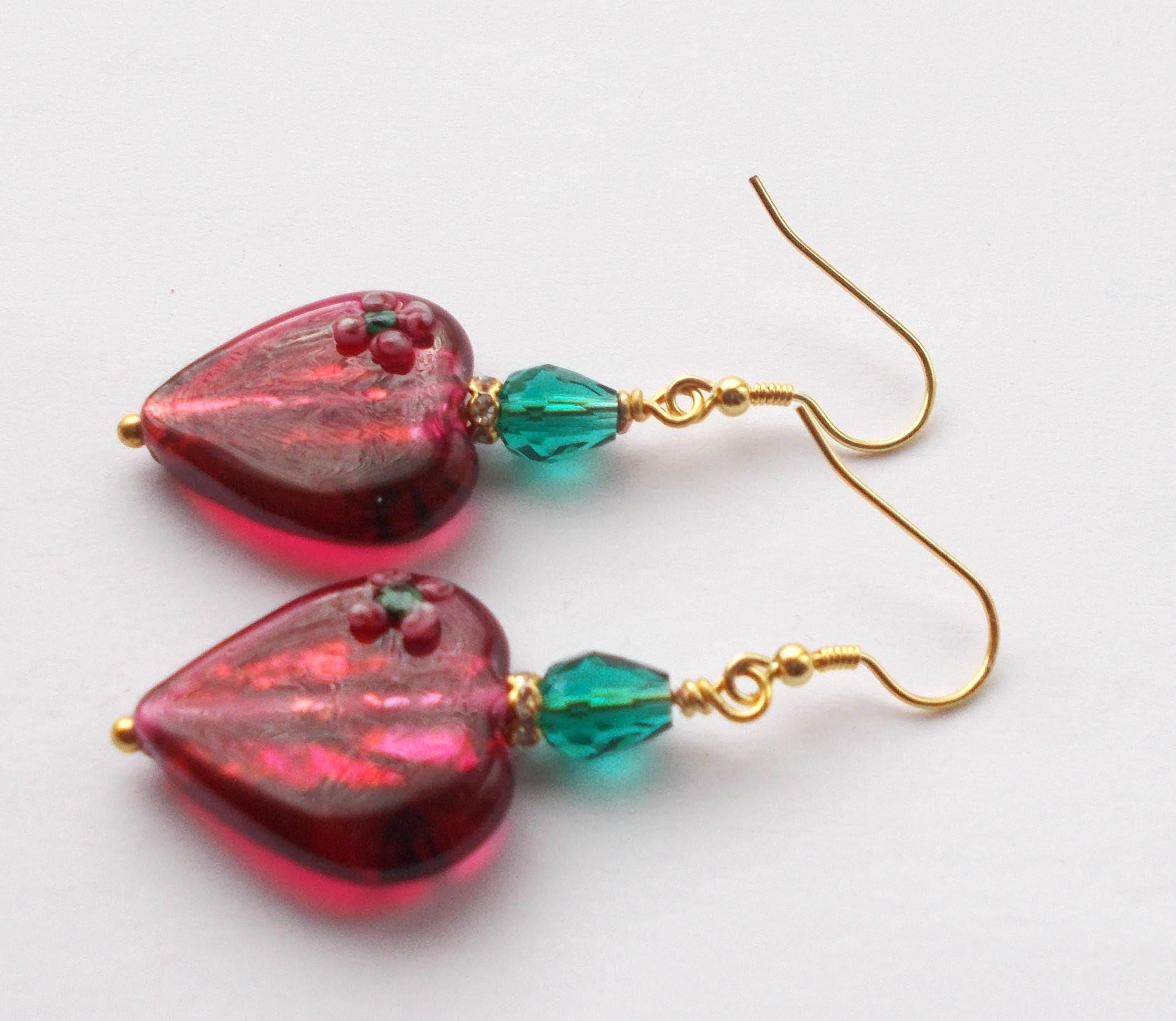 Handmade artisan Victorian / Art Nouveau inspired vintage red glass heart earrings, small green faceted glass beads, brass findings, gold vermeil earring hooks, earrings are approx. 2 inches long and will be sent in a gift box.
