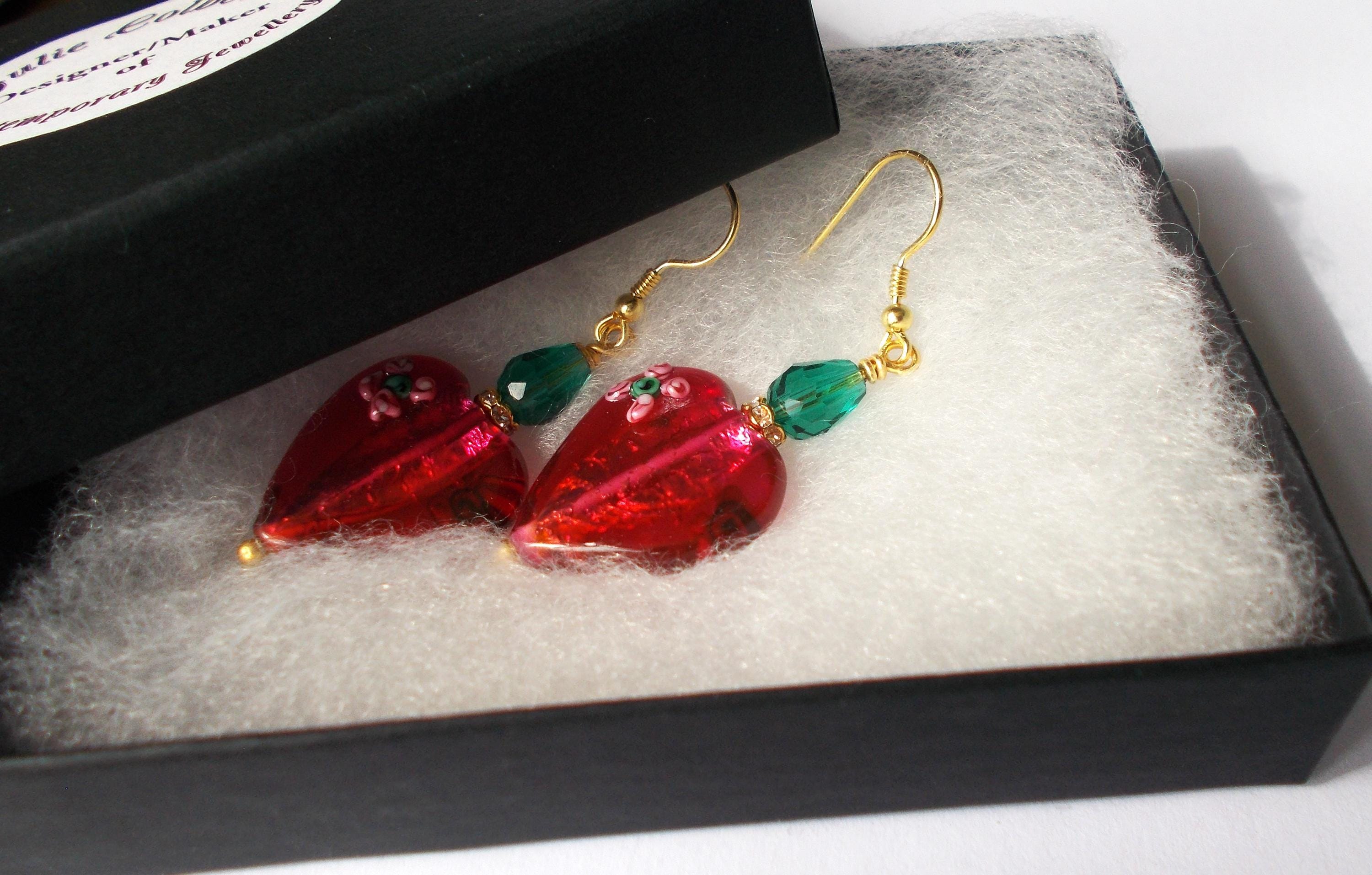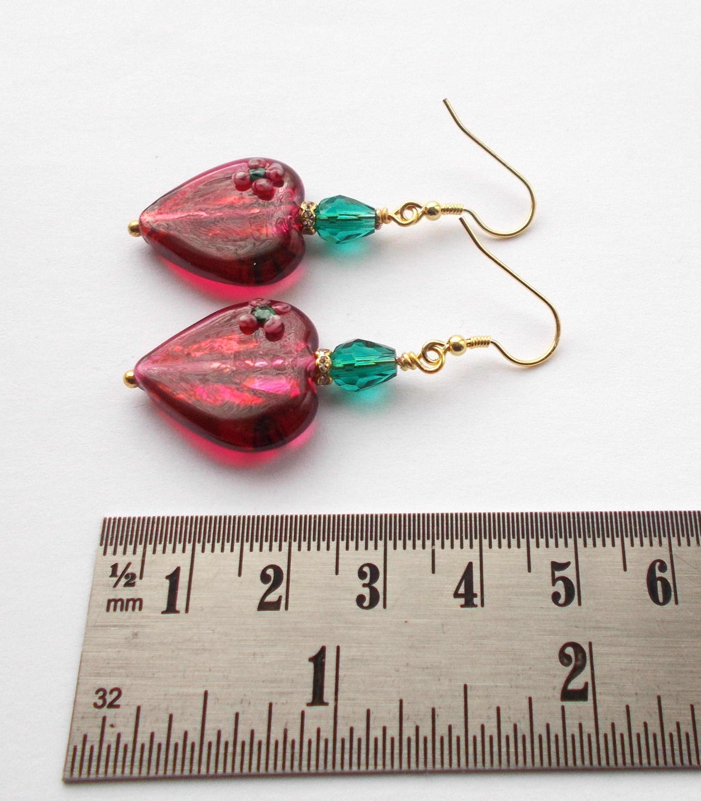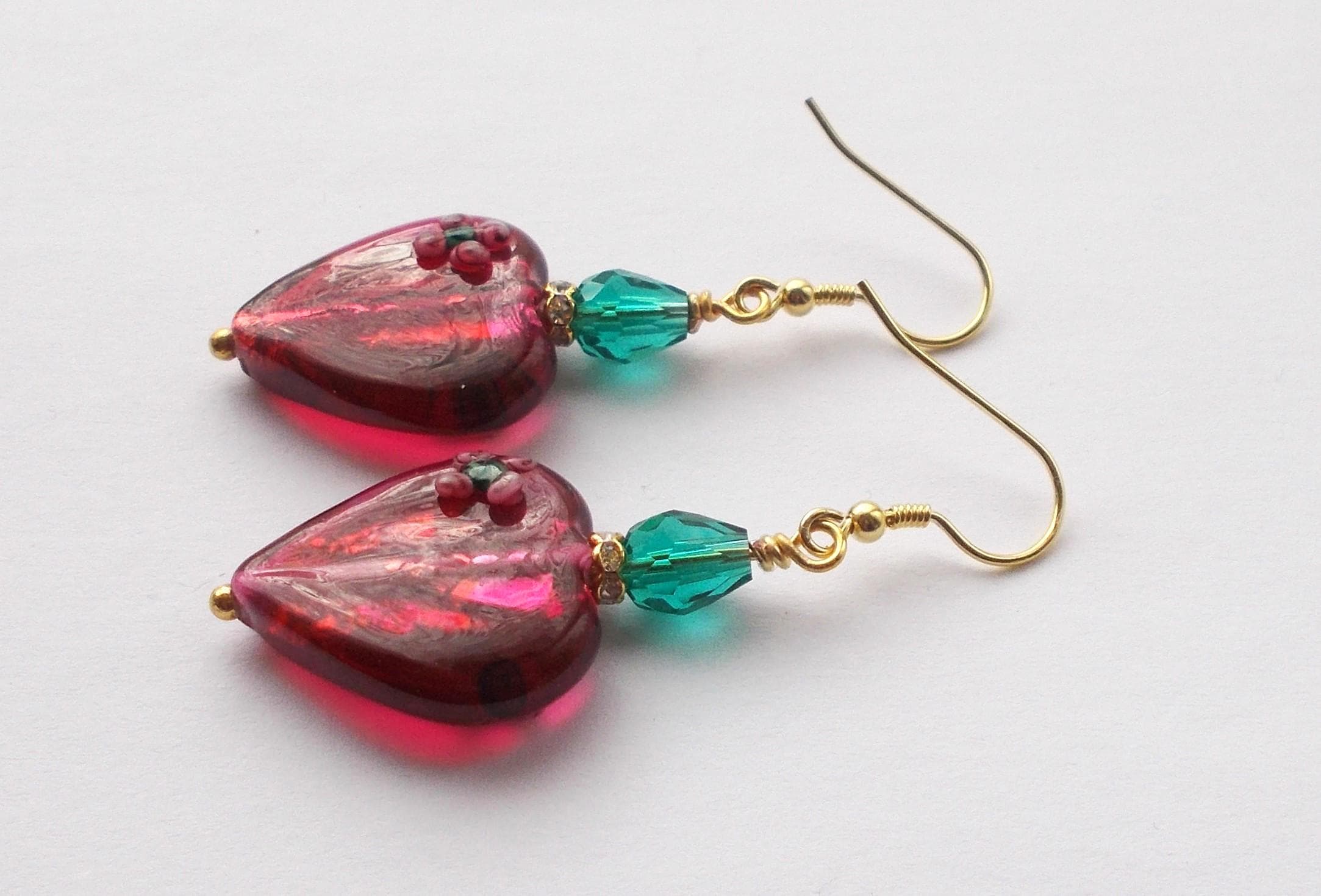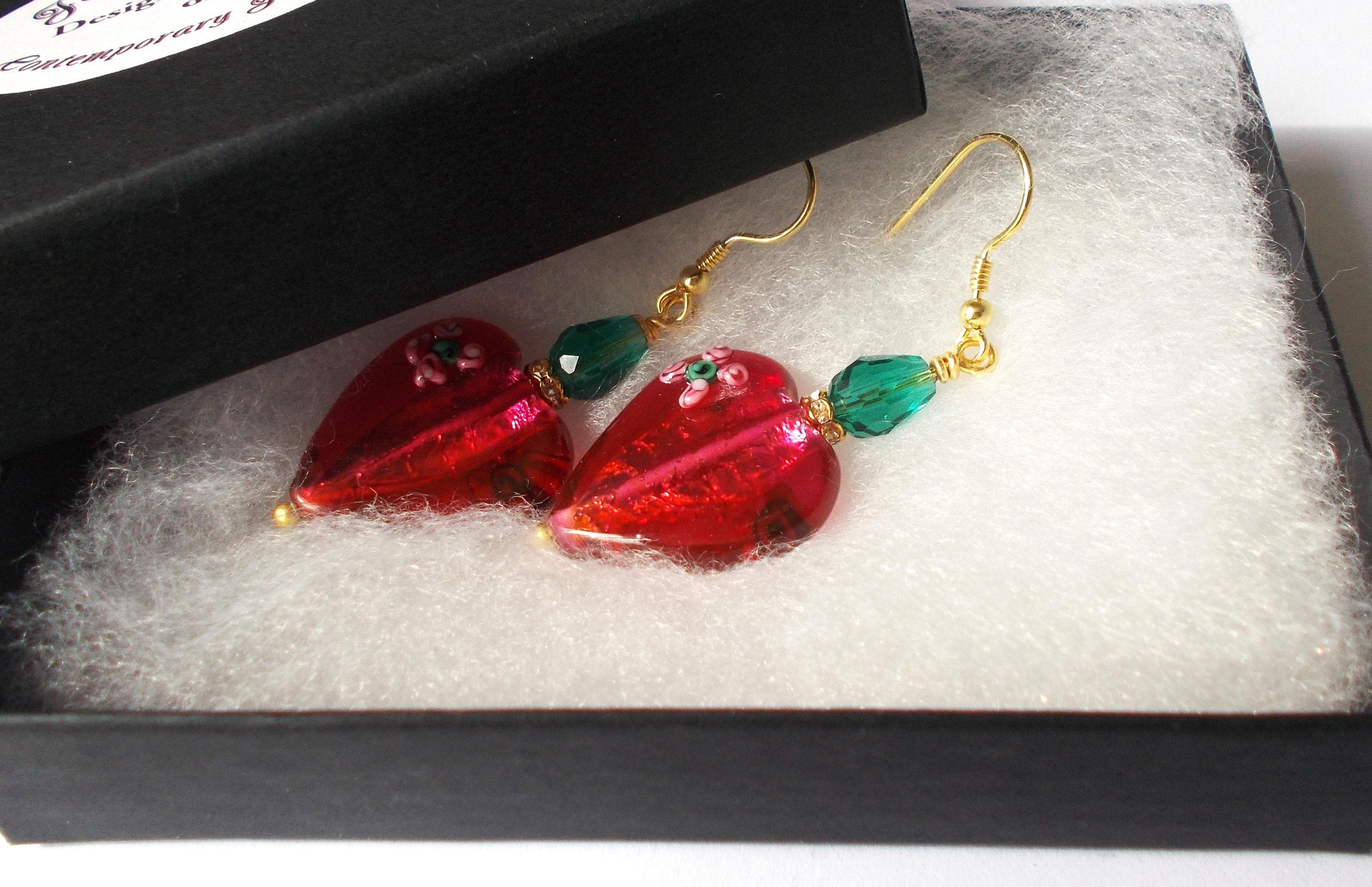 Handmade artisan Victorian / Art Nouveau inspired vintage red glass heart earrings, small green faceted glass beads, brass findings, gold vermeil earring hooks, earrings are approx. 2 inches long and will be sent in a gift box.