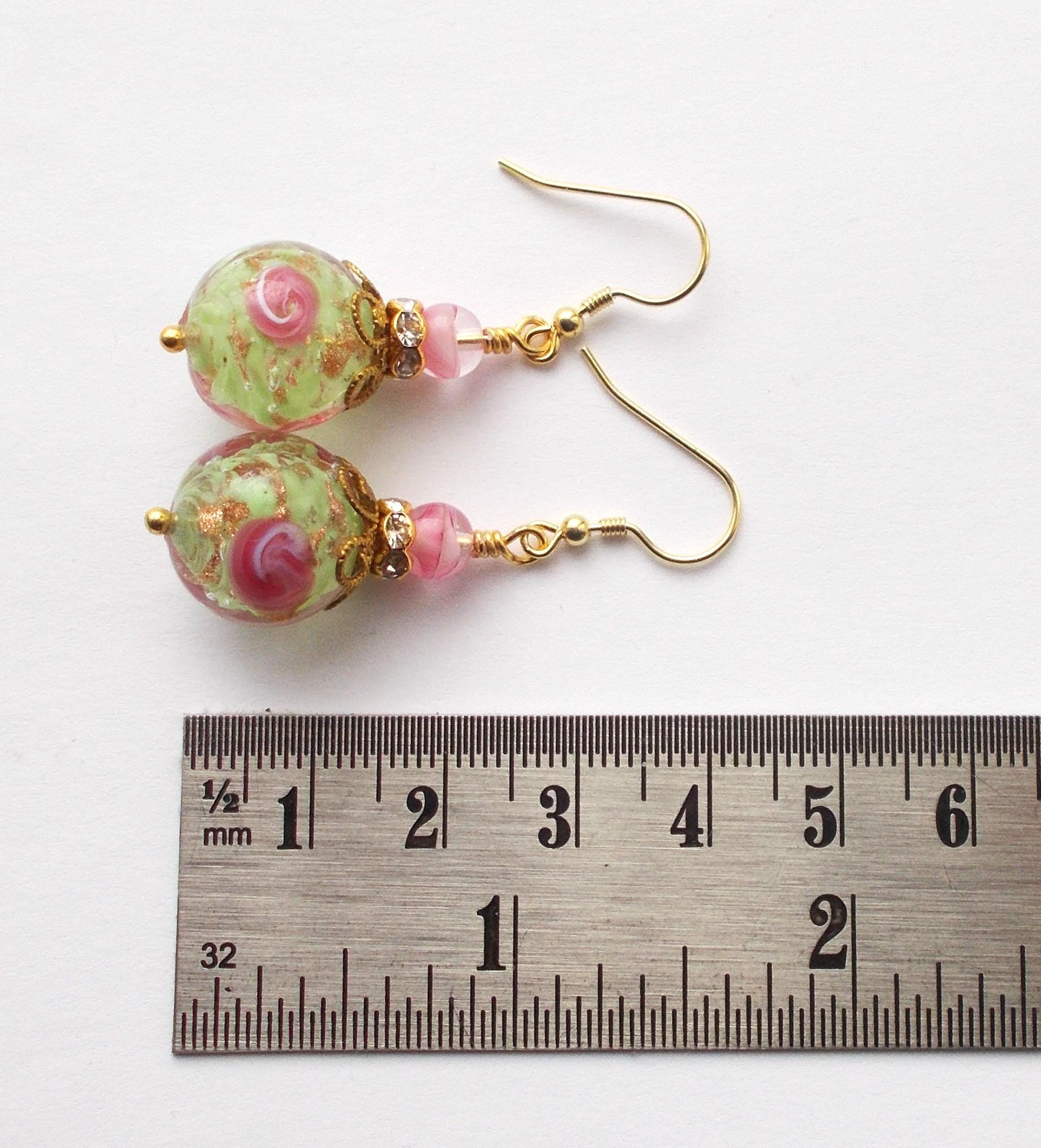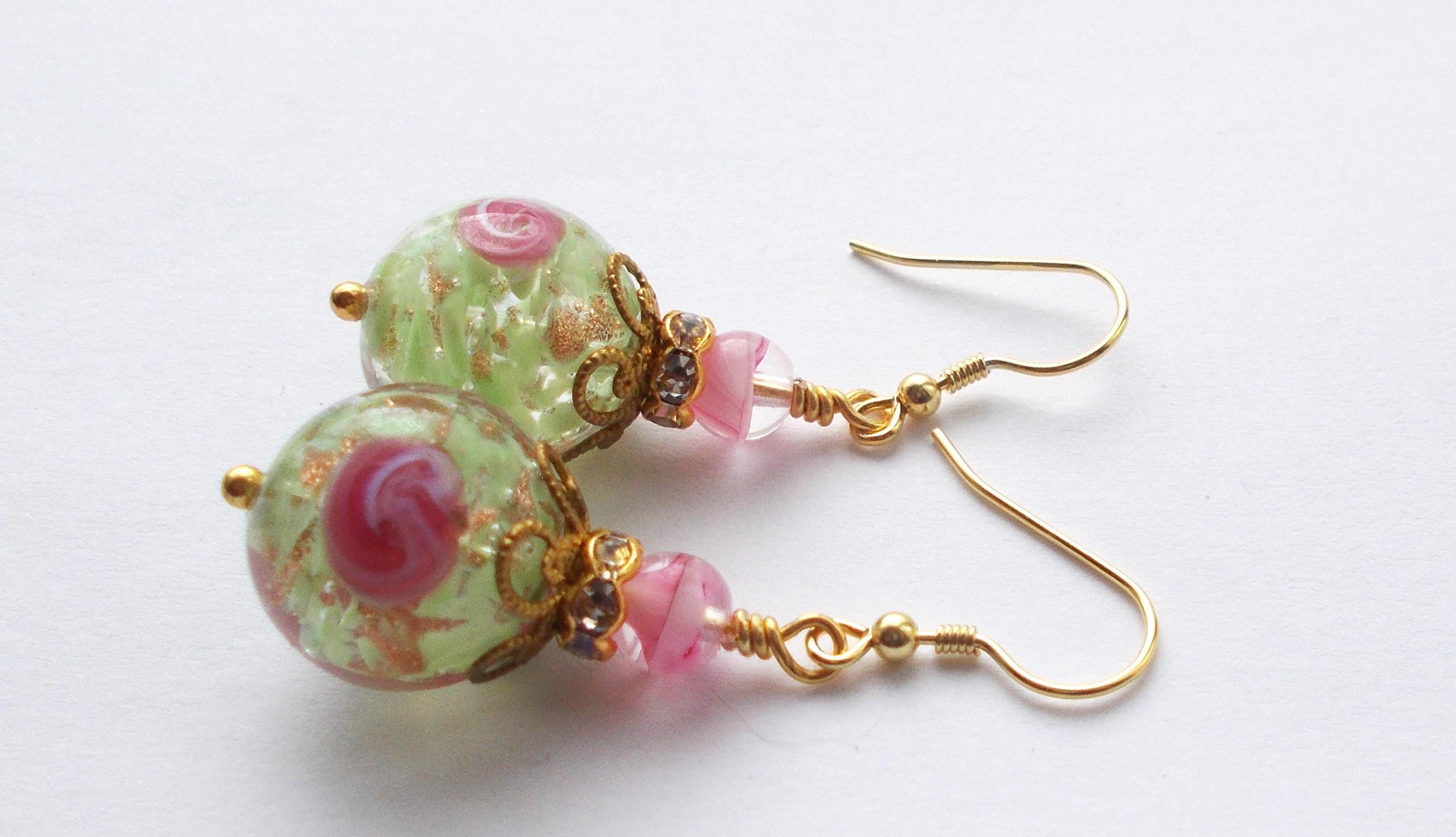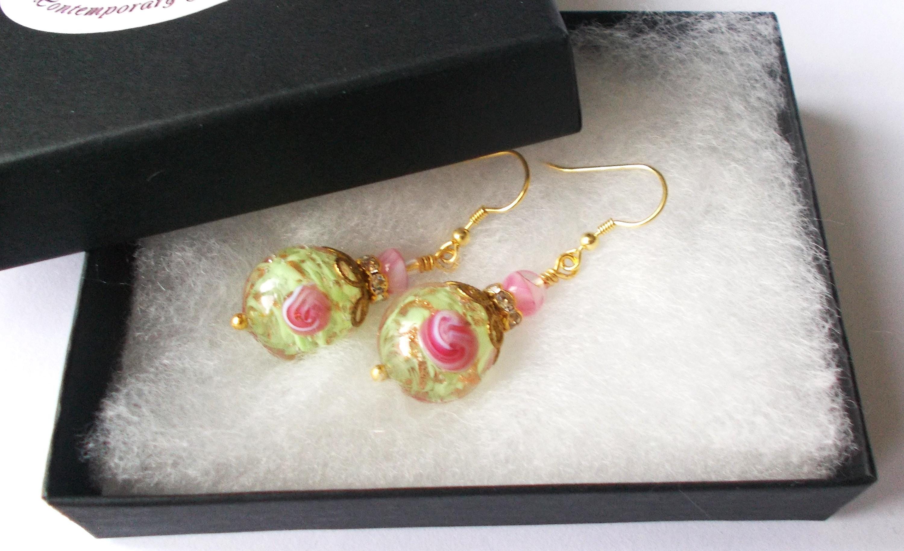 Handmade earrings with vintage Venetian glass beads, mixed brass findings and gold vermeil (gold covered sterling silver) earring hooks, earrings are approx. 4 cms long. Earrings will be sent in a gift box as shown.