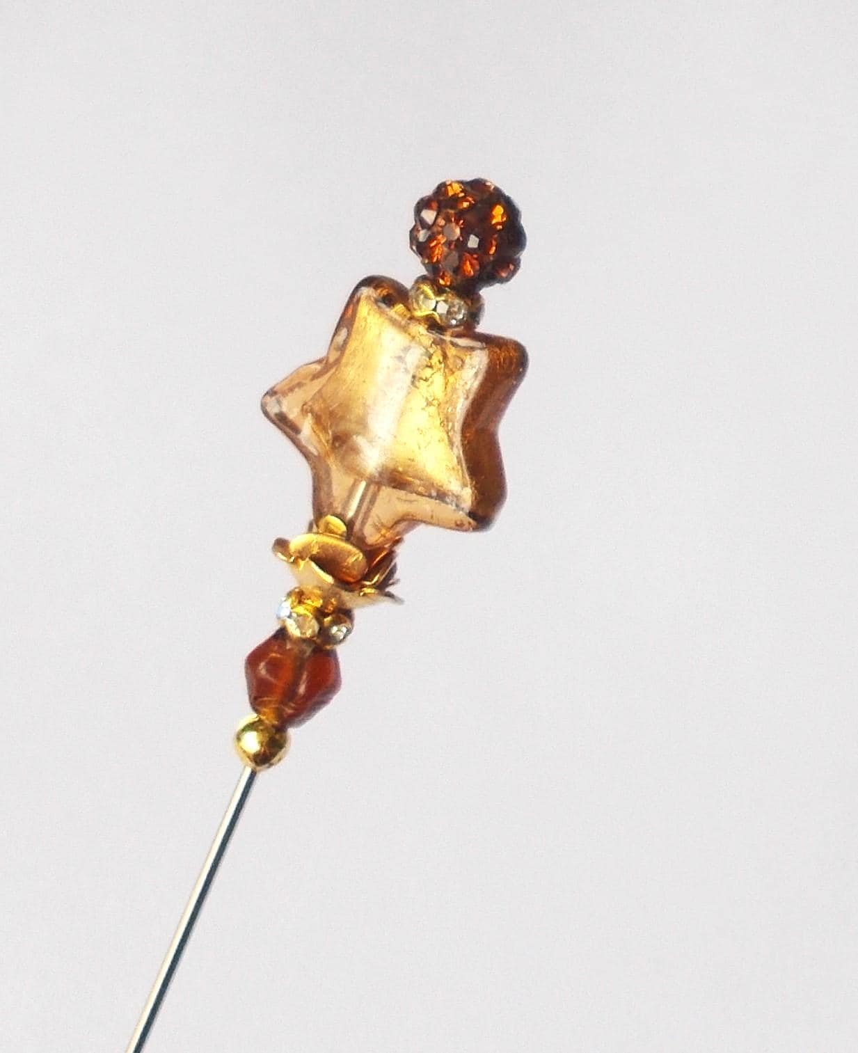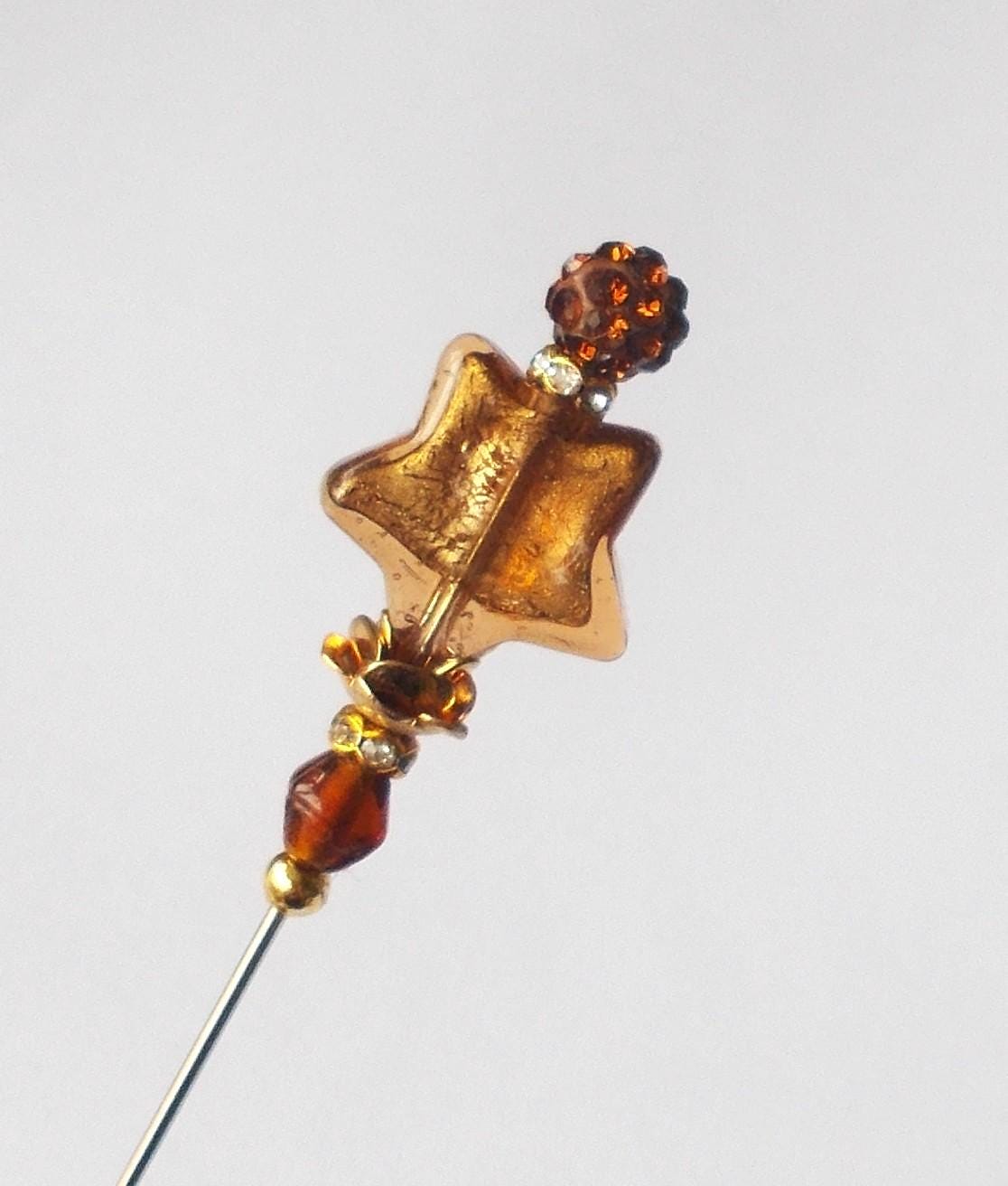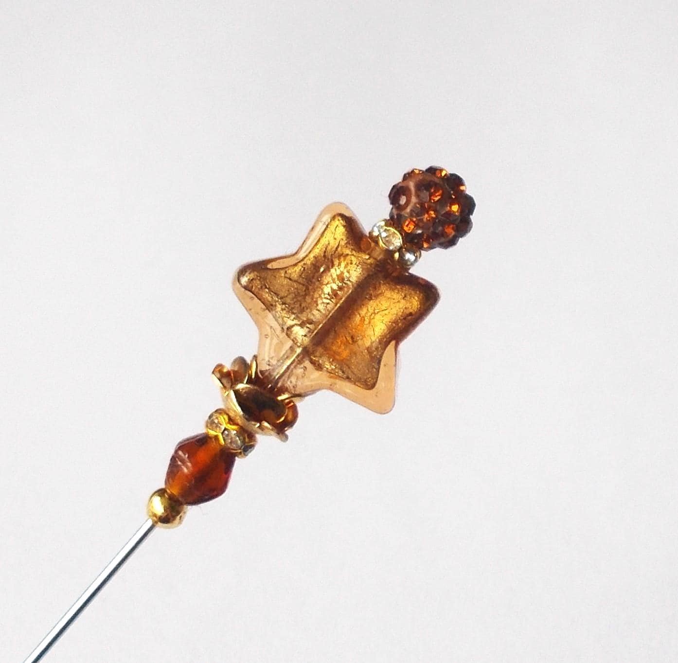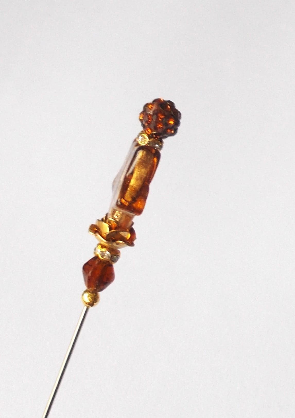 Pretty small decoration hatpin that I made using a mix of brown glass bead, gold coloured findings, 1mm diameter steel pin and hatpin is approx 5 inches long in total, comes with pin protector and will be sent in a gift box.