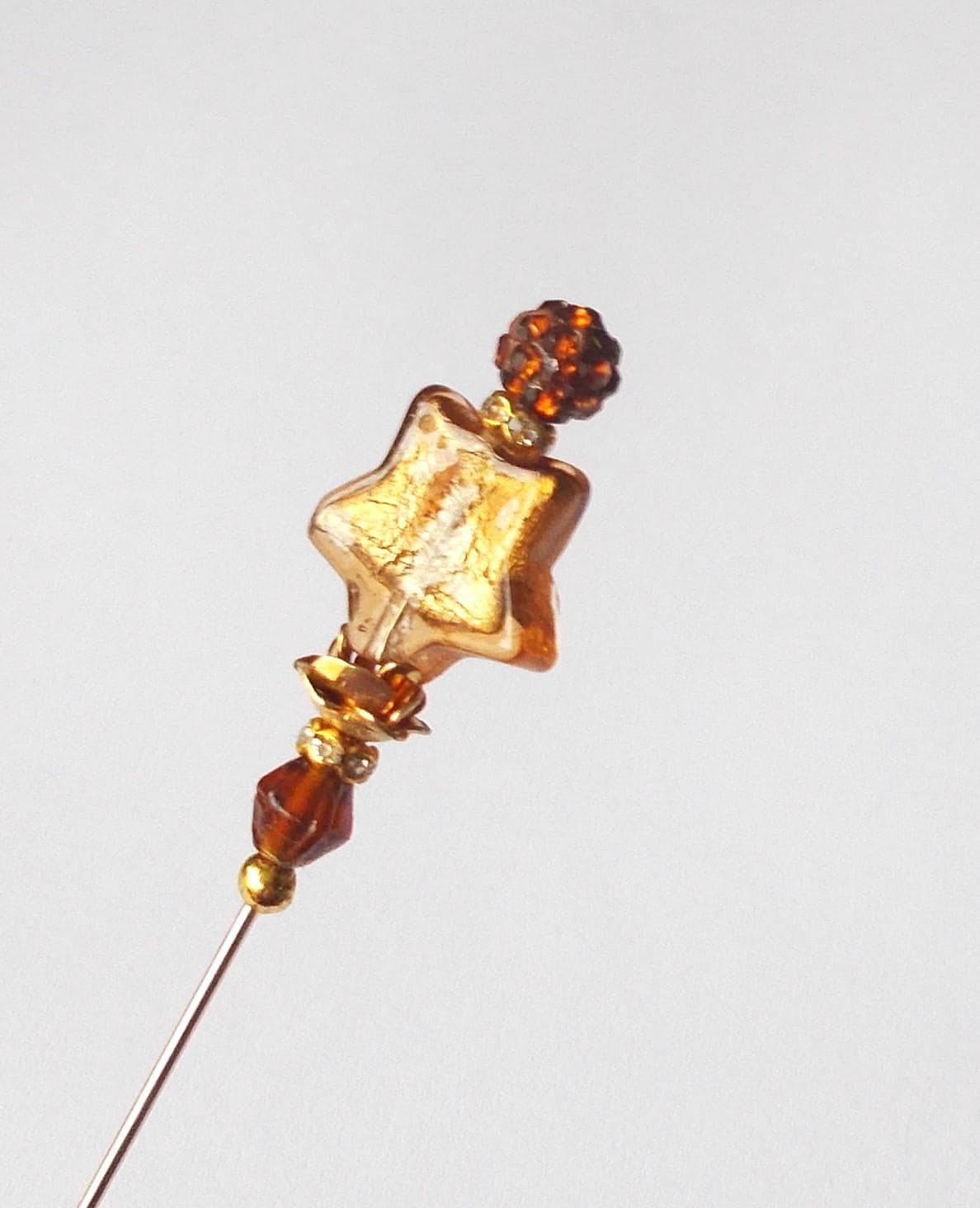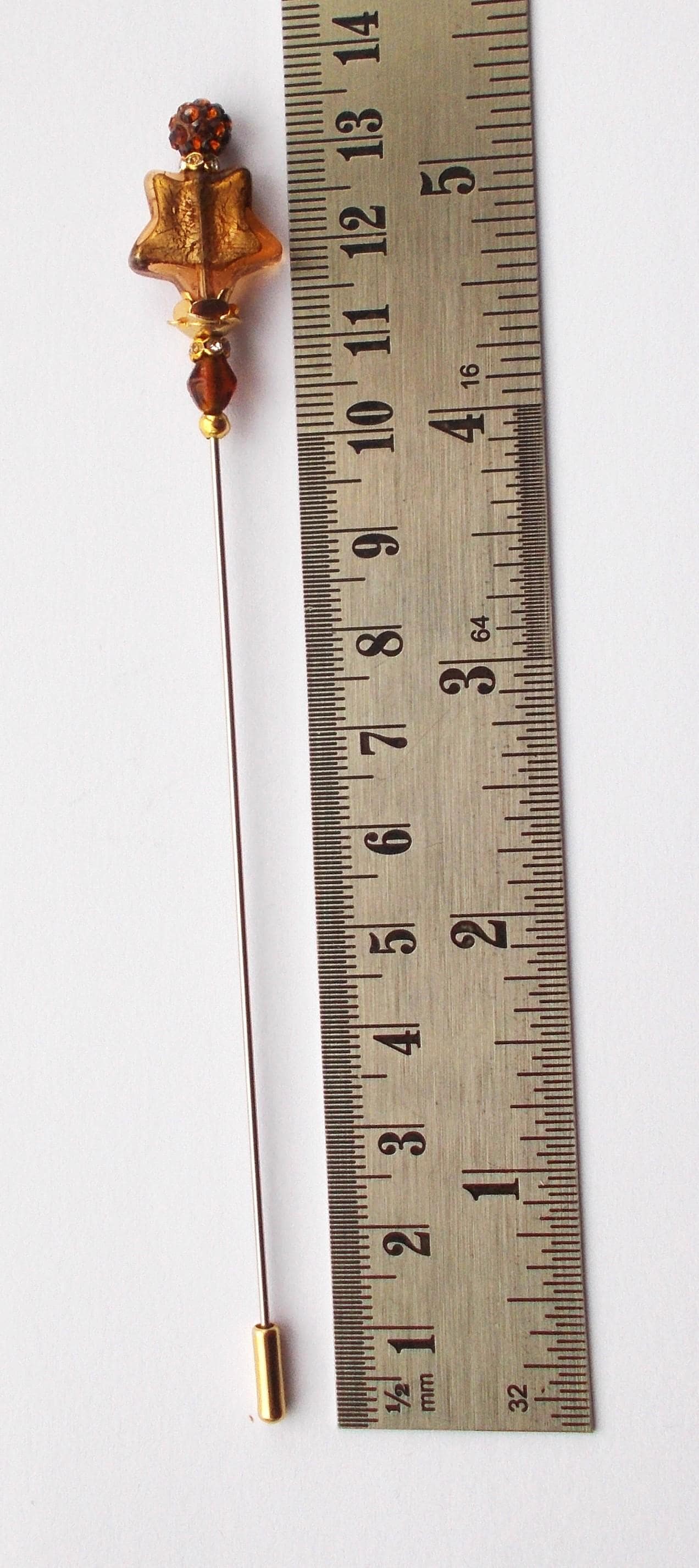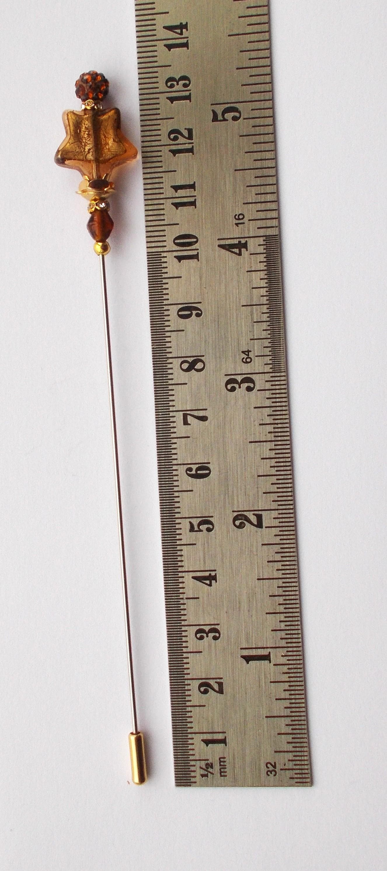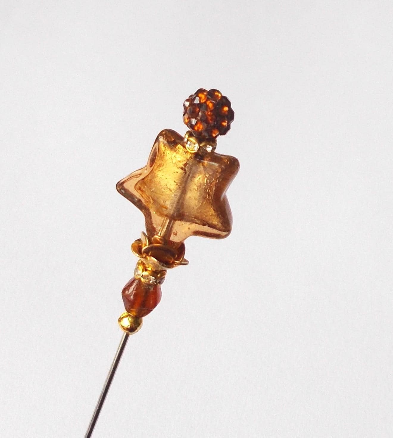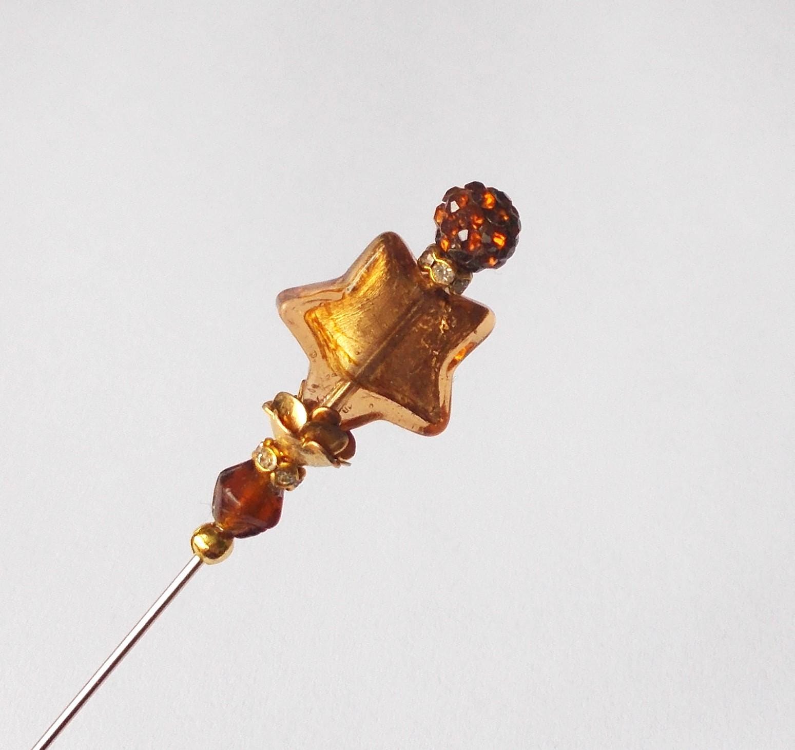 Pretty small decoration hatpin that I made using a mix of brown glass bead, gold coloured findings, 1mm diameter steel pin and hatpin is approx 5 inches long in total, comes with pin protector and will be sent in a gift box.
